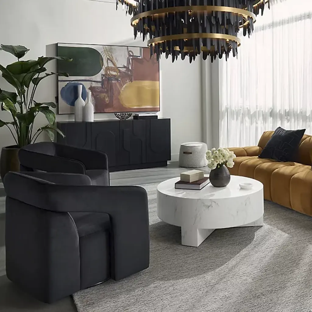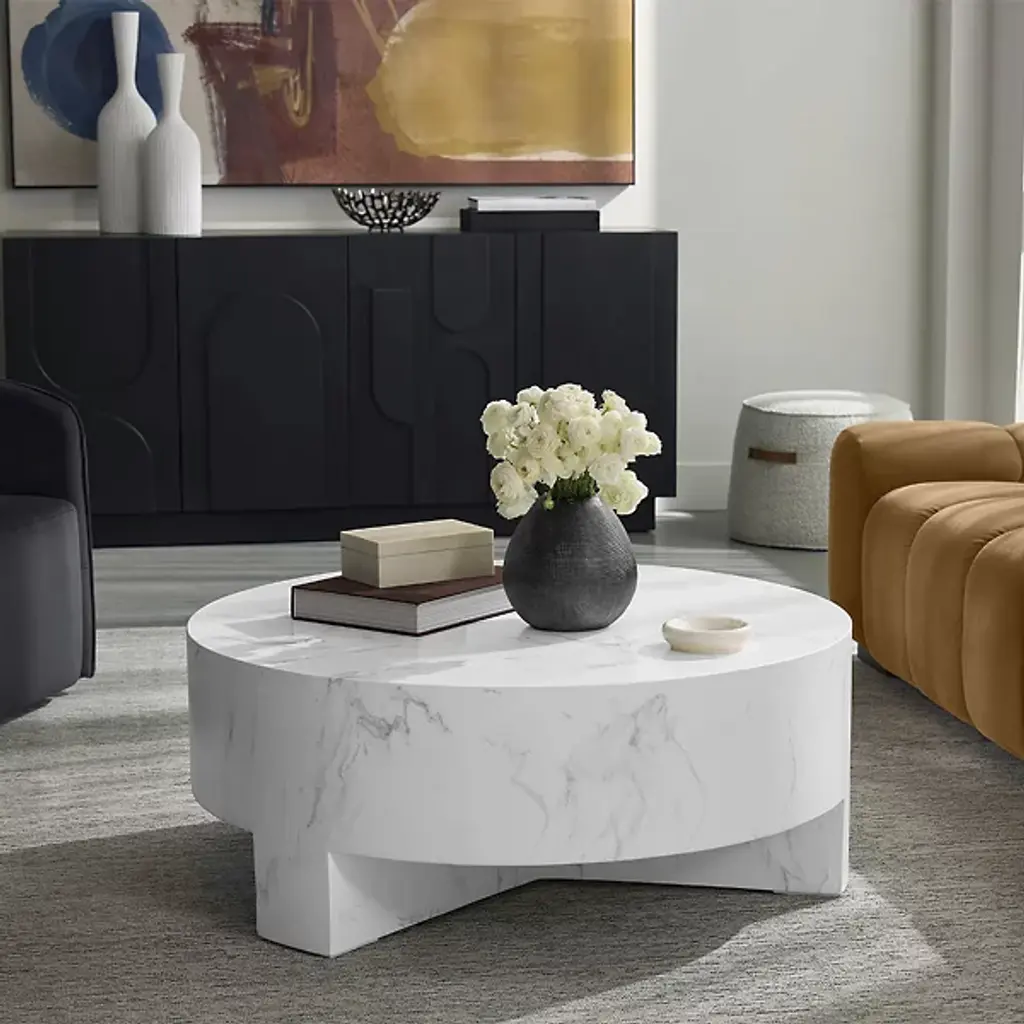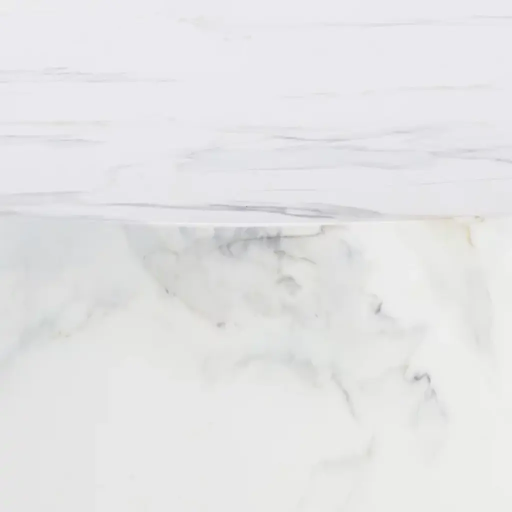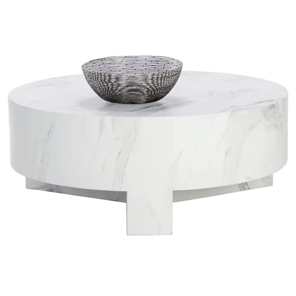 The Mirella Coffee Table from Sunpan adds smooth style to any space with its minimalist design and sophisticated materials. A circular tabletop with a cutout base is finished in a stunning white Calacatta marble effect, featuring warm veining that adds natural charm. Made from durable glass fiber-reinforced concrete and sealed with a protective topcoat, this table resists moisture and stains while adding old-world elegance. Each piece showcases unique veining, pitting, and subtle variations, ensuring no two are alike, blending smooth functionality with artistic appeal.