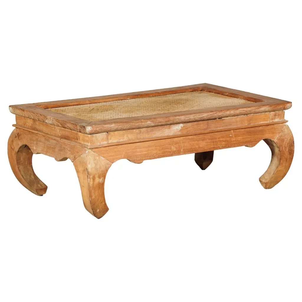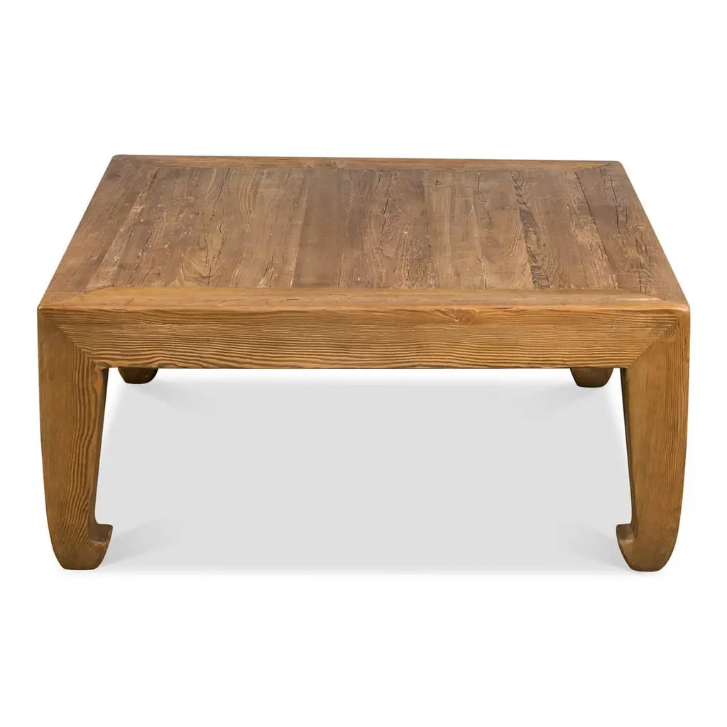 Asian-style square coffee table of reclaimed pine, a classic style inspired by the far east. This table is a square shape with horse hoof-style legs, a design that dates back to the 14th century. Dimensions: 39" W x 39" D x 18" H.