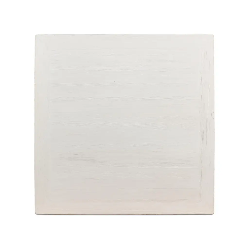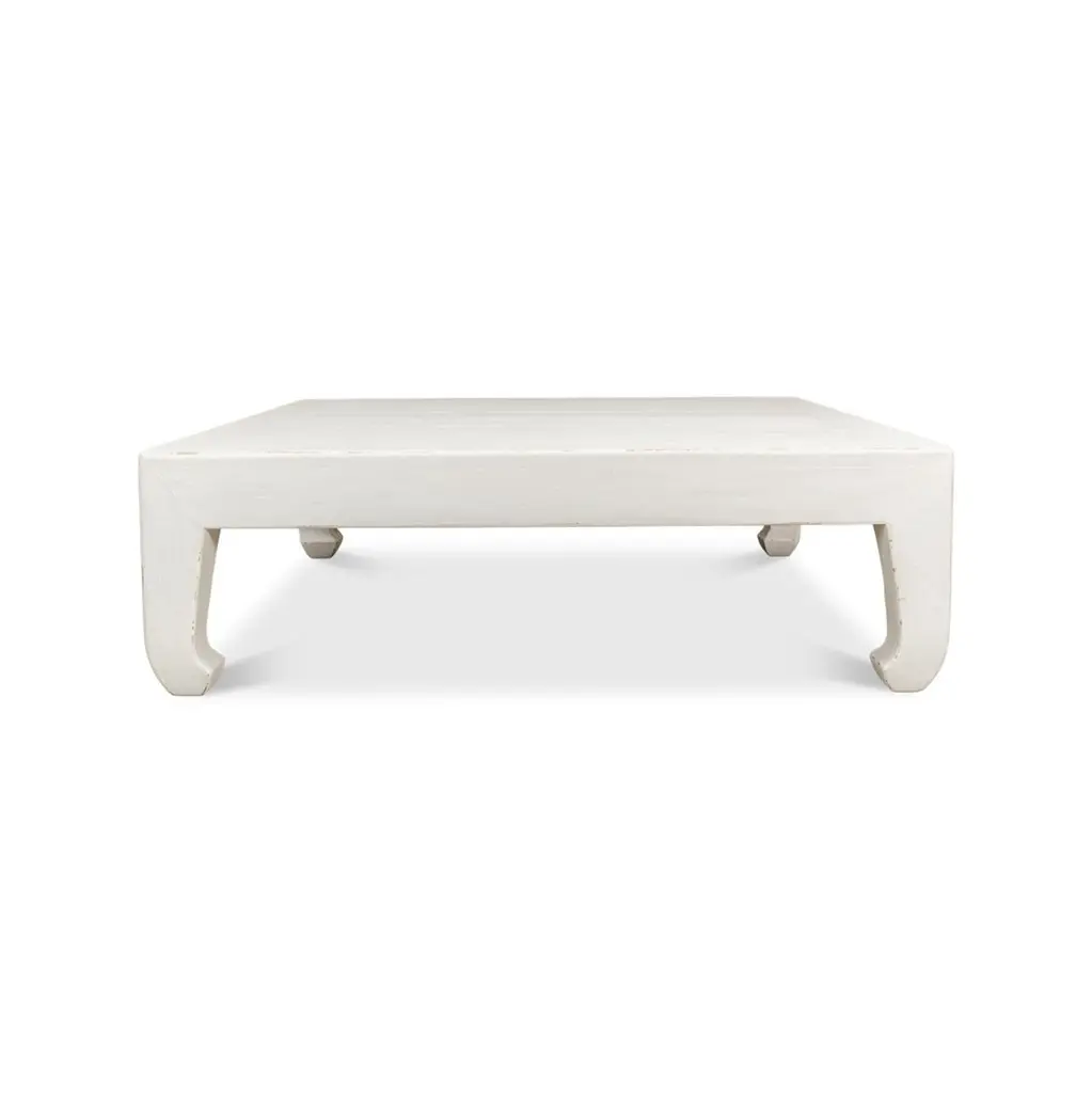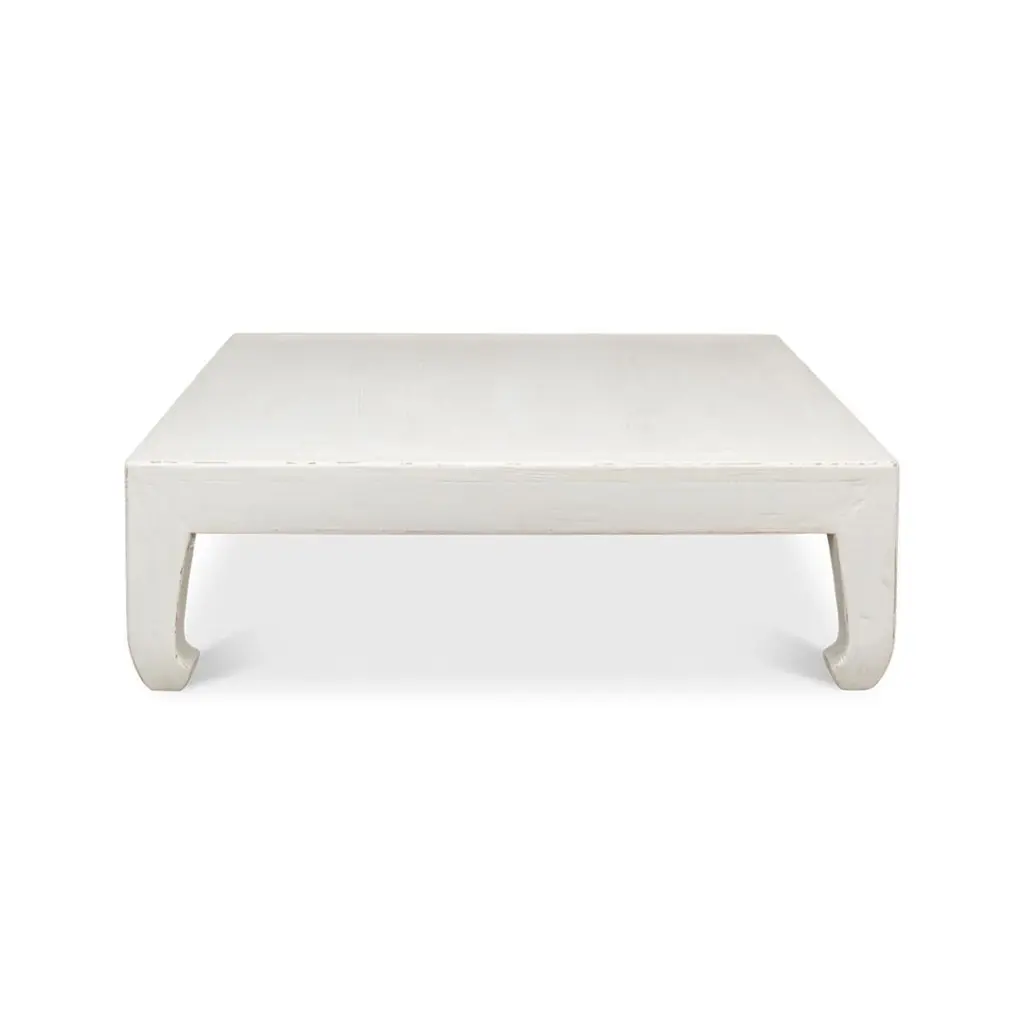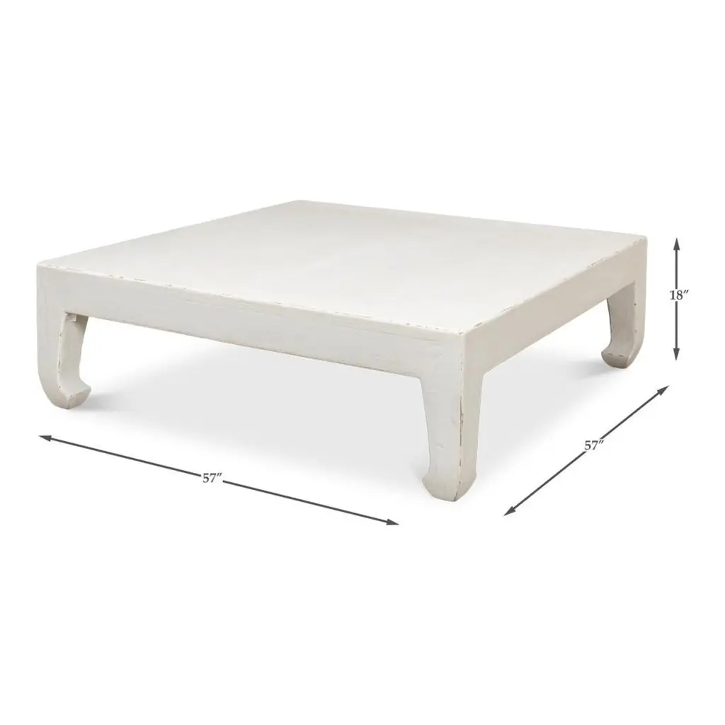 Modern Asian-style white coffee table, a Classic style inspired by the far east. This table is a large square shape with horse hoof-style legs, a design that dates back to the 14th century. Made of reclaimed pine with a slightly distressed white painted finish. Dimensions: 57" W x 57" D x 18" H.