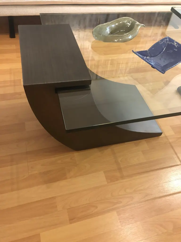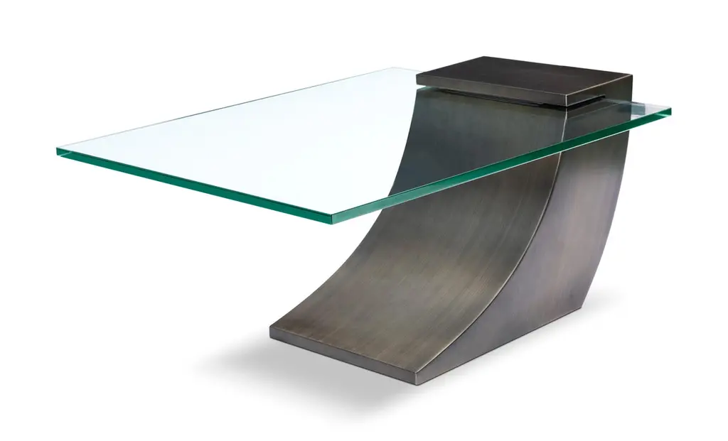 Modern Bronze cocktail table designed by Greg Sheres. In stock. The clean sculptural bronze form gives this table its sophistication. The cantilevered glass adds to the dynamic quality of the table. Great alone or as a pair for larger spaces. Glass top cantilevers from opening in the stainless steel sculptural base. A classic design by American designer Greg Sheres. This table makes a big statement and yet has a minimalist spirit.