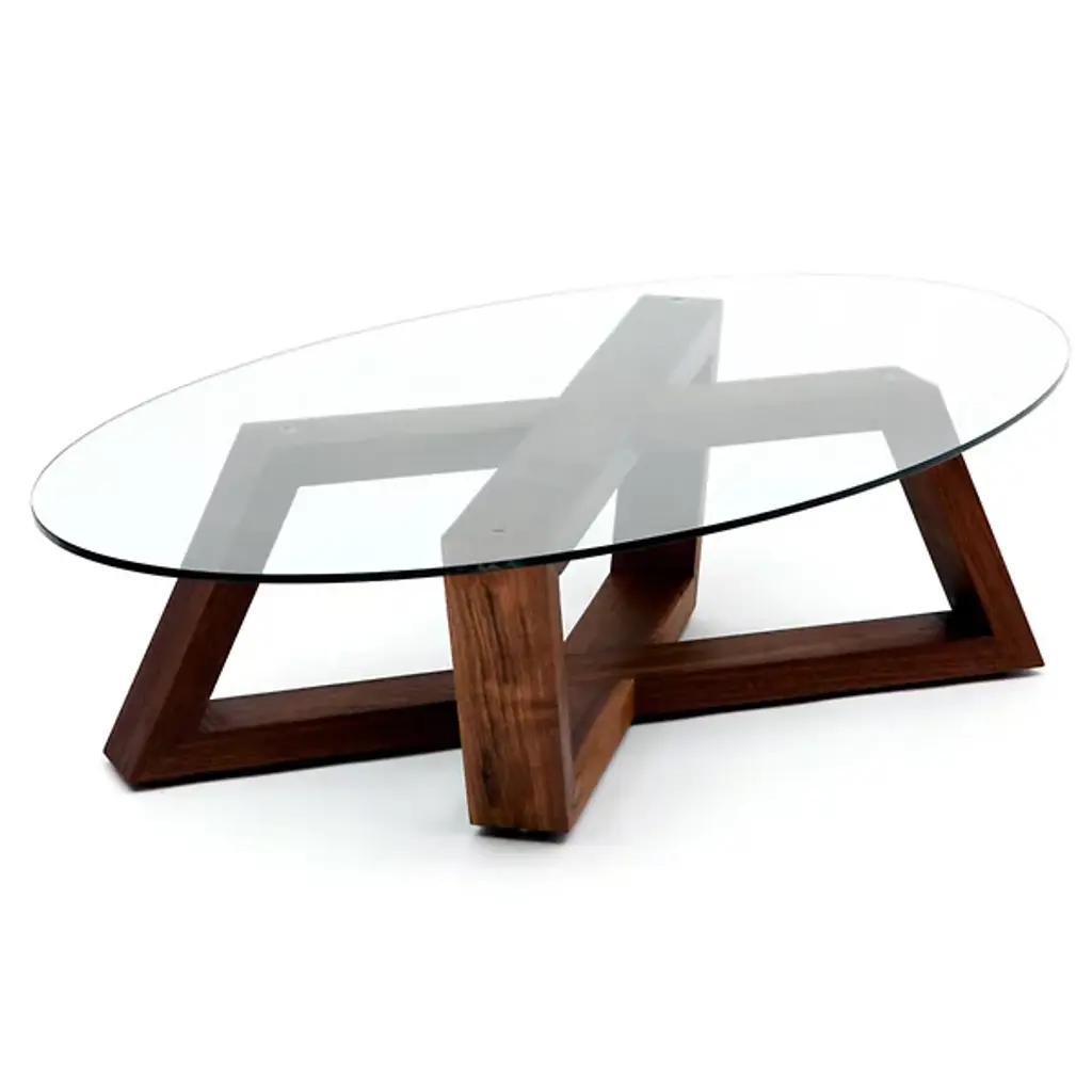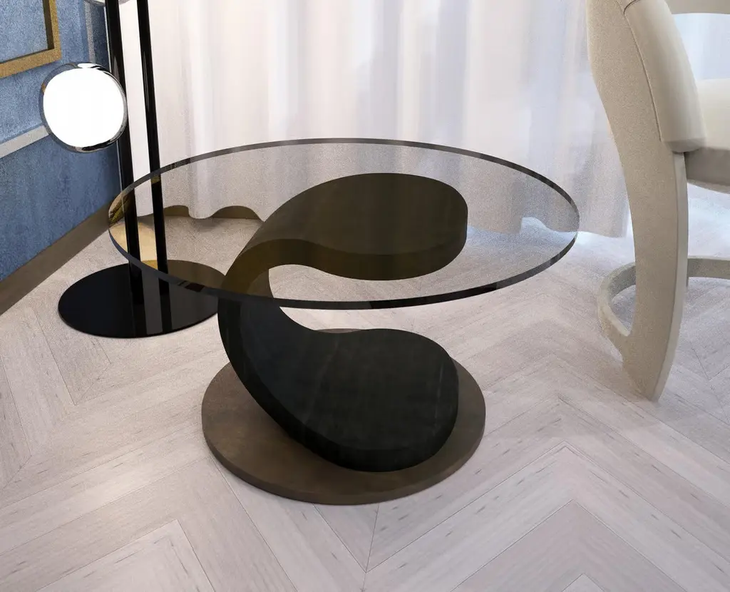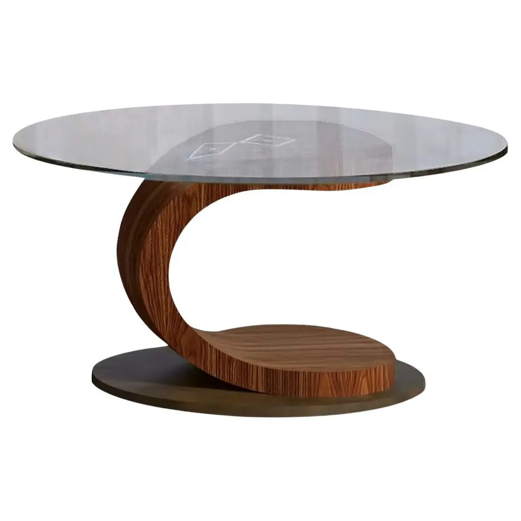 Coffee table in round shape with glass top. The structure is in Canaletta walnut. Base enriched by metal element.