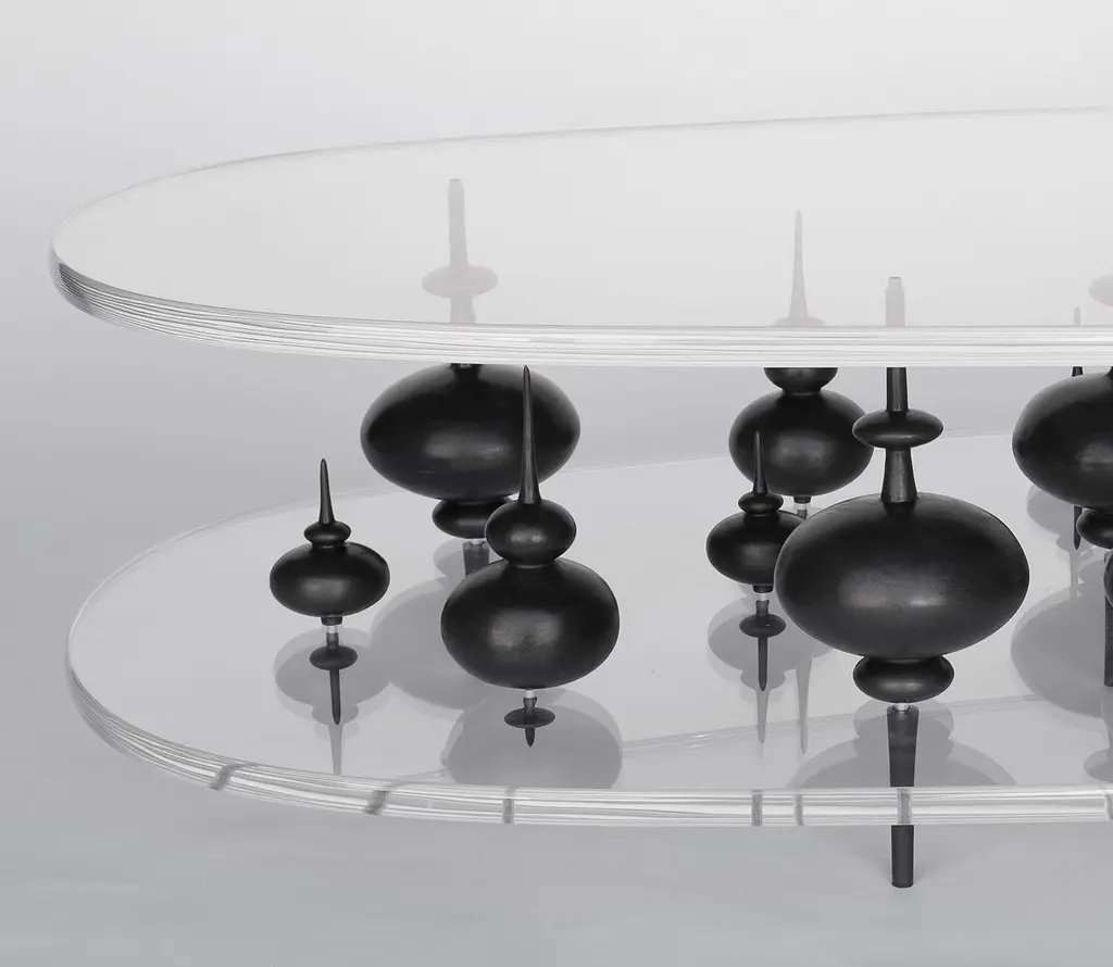 Modern Cocktail Table With French Black Bronze Minarets Between Lucite