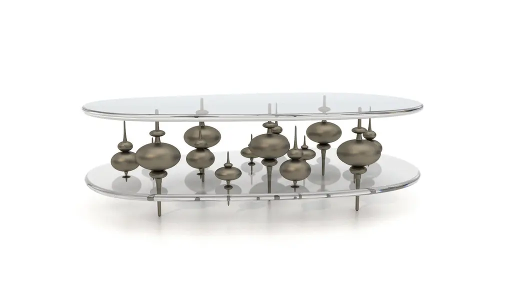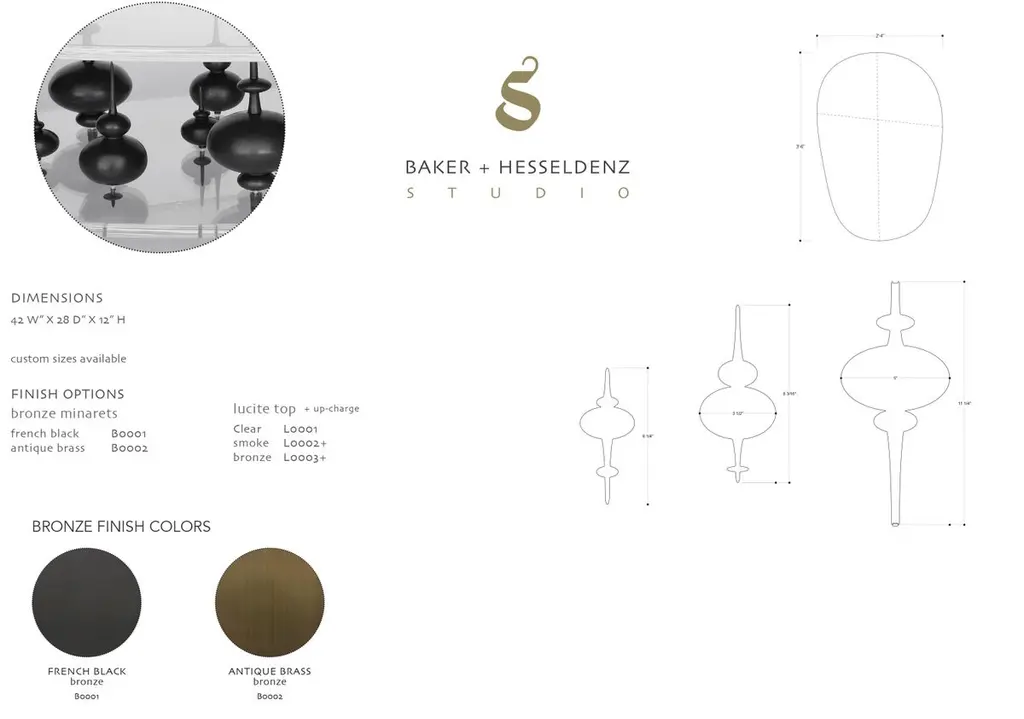 The Minaret cocktail table is inspired by how the rooftop spires pierce through the clouded skyline of Istanbul Turkey. 15 cast bronze elements, hand fabricated at a world renowned foundry in Tucson Arizona, float magically between two crystal clear layers of 3/4" Lucite. clear lucitebronze minaret