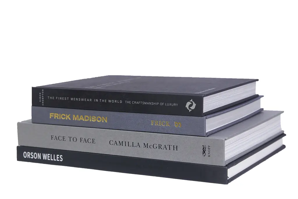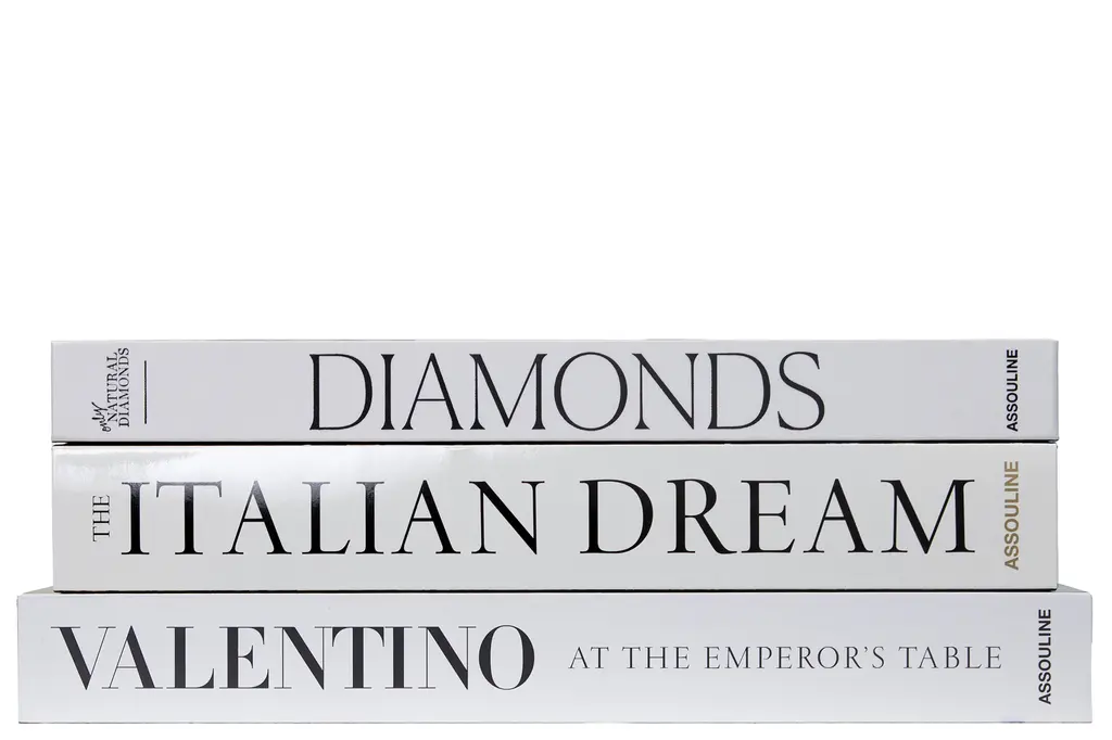 Assouline luxury coffee table stacks add a chic personalized touch to any room. A trio of luxurious coffee table books with unified bold black and white spines. Featuring an artistic close-up of design and fashion.