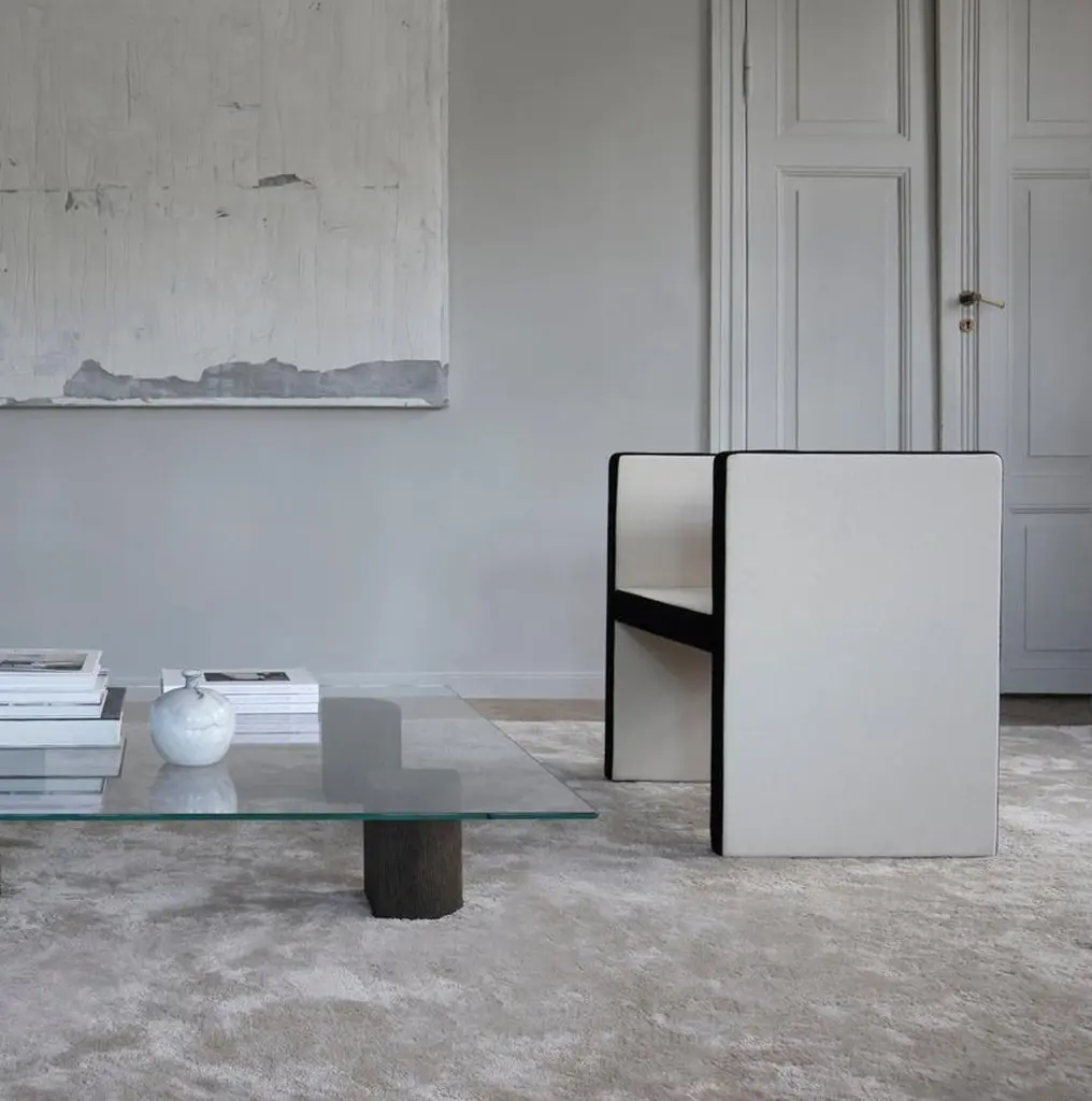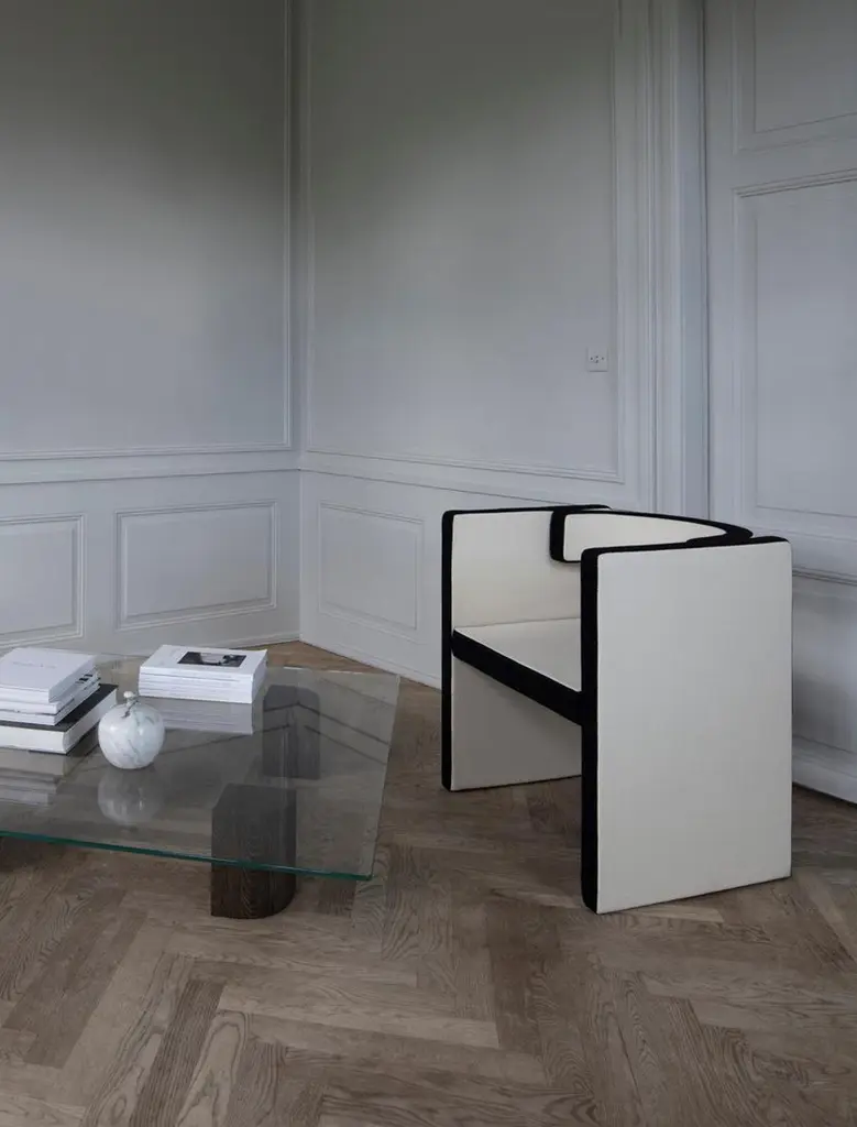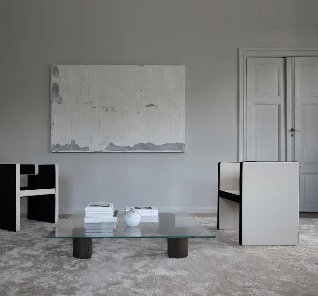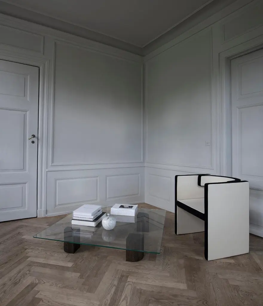 Coffee table 'Quarter' by Friends & Founders.Dimensions : H. 21 x 120 x 120cm.Model shown: Square tabletop and smoked oak legs OPTIONS- Shape of the tabletop : Square: 120 x 120 cmRound: Diameter 120 cmRectangular: 120 x 80 cm- Wood finish: Natural white or smoked oakLounge table featured in solid wood and hardened glass. Top in clear glass, available in different designs. Base in solid oak with an oiltreated solvent-free satin finish.Contemporary design studio Friends & Founders was founded in 2003 by Ida Linea and Rasmus Hilderbrand in Copenhagen, Denmark.For this couple, designing and creating is a ”geometrical performance act”. The lines and shapes are sleek and pure; often organic. And sometimes, it contrasts with the masculinity of the materials used, as marble or metal. The creations signed by Friends & Founders may look simple. In reality, the pieces are a perfect balance between functional comfort and elegance of lines and design.