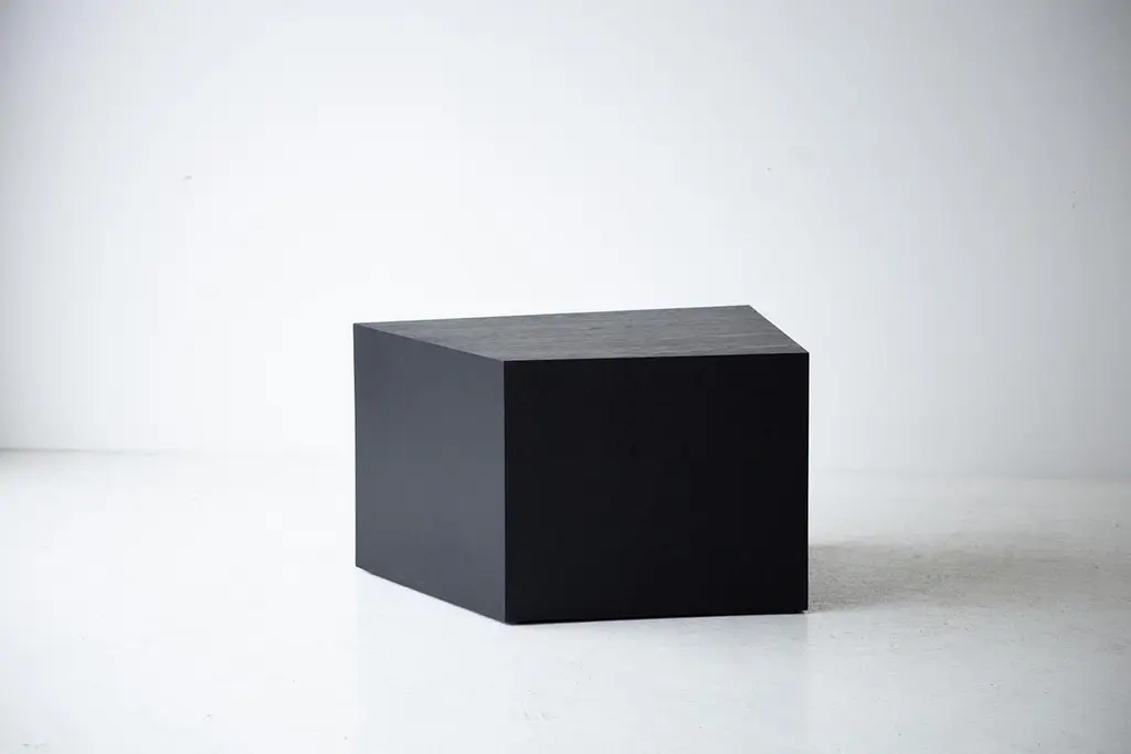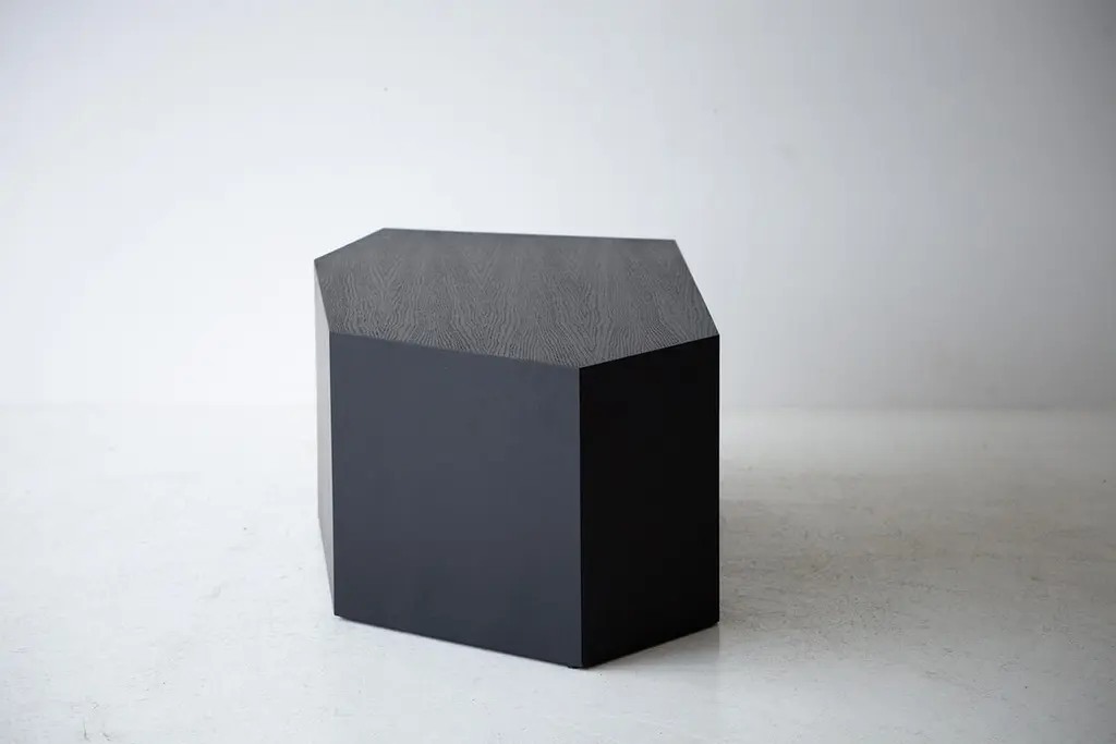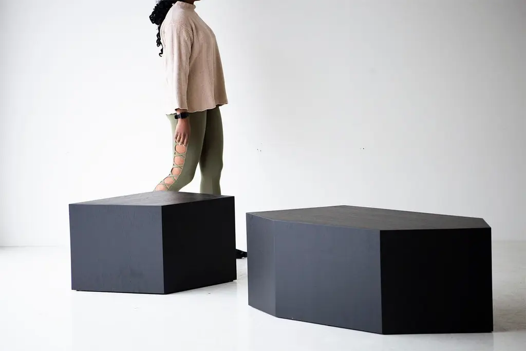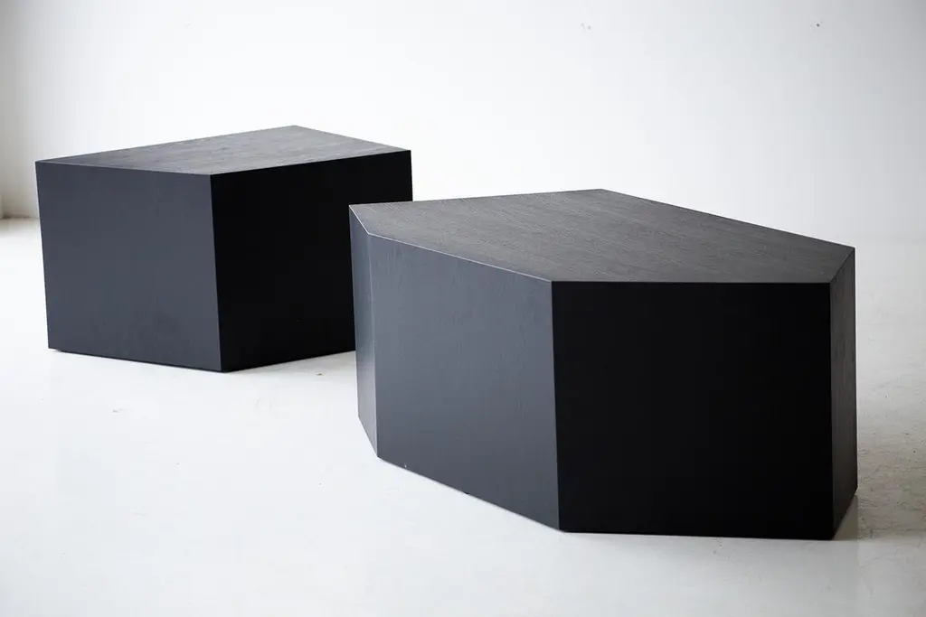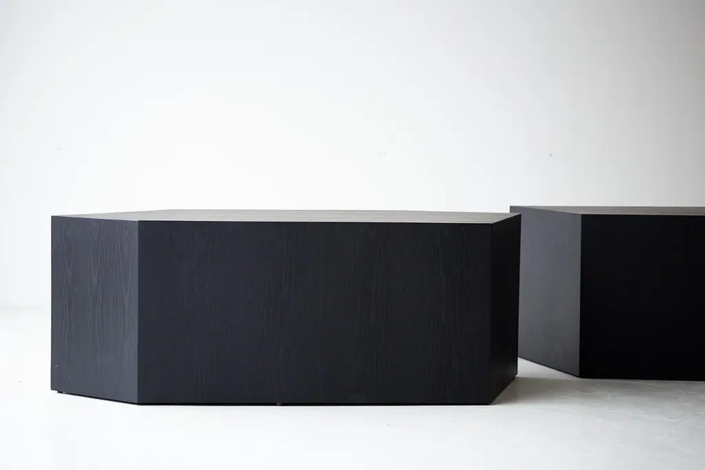 This listing is for the smaller version.This Modern Coffee Table - The Crag Tables are made in the heart of Ohio with locally sourced wood. Each table is a hand-made mitered box from white oak veneer and finished with a beautiful matte black commercial-grade finish. These are sculptural and versatile. Use them as a coffee table, side table, pedestal, etc. We love these! specsPeriod/Model: New; ModernSpecs: White Oak Plywood Veneer, Commercial grade finishCustomizable: Yes! It's what we do :)dimensions and pricingBig: $1,250 H: 17"W: 49"D: 25"Small: $1,100 H: 17"W: 29"D: 23".