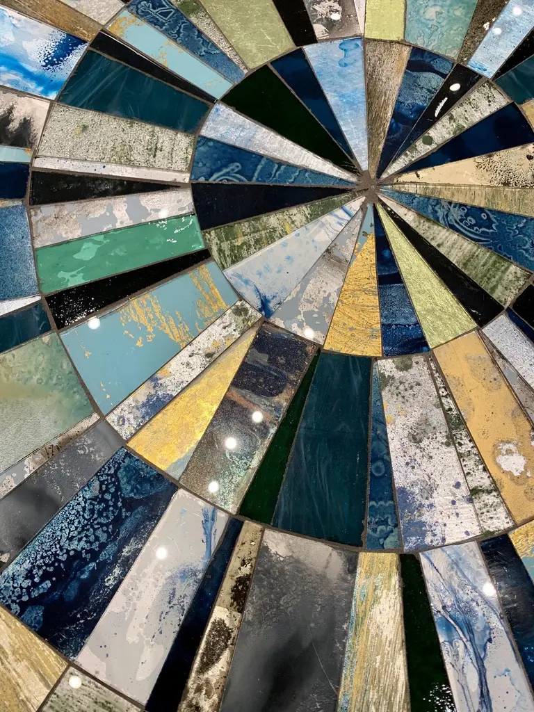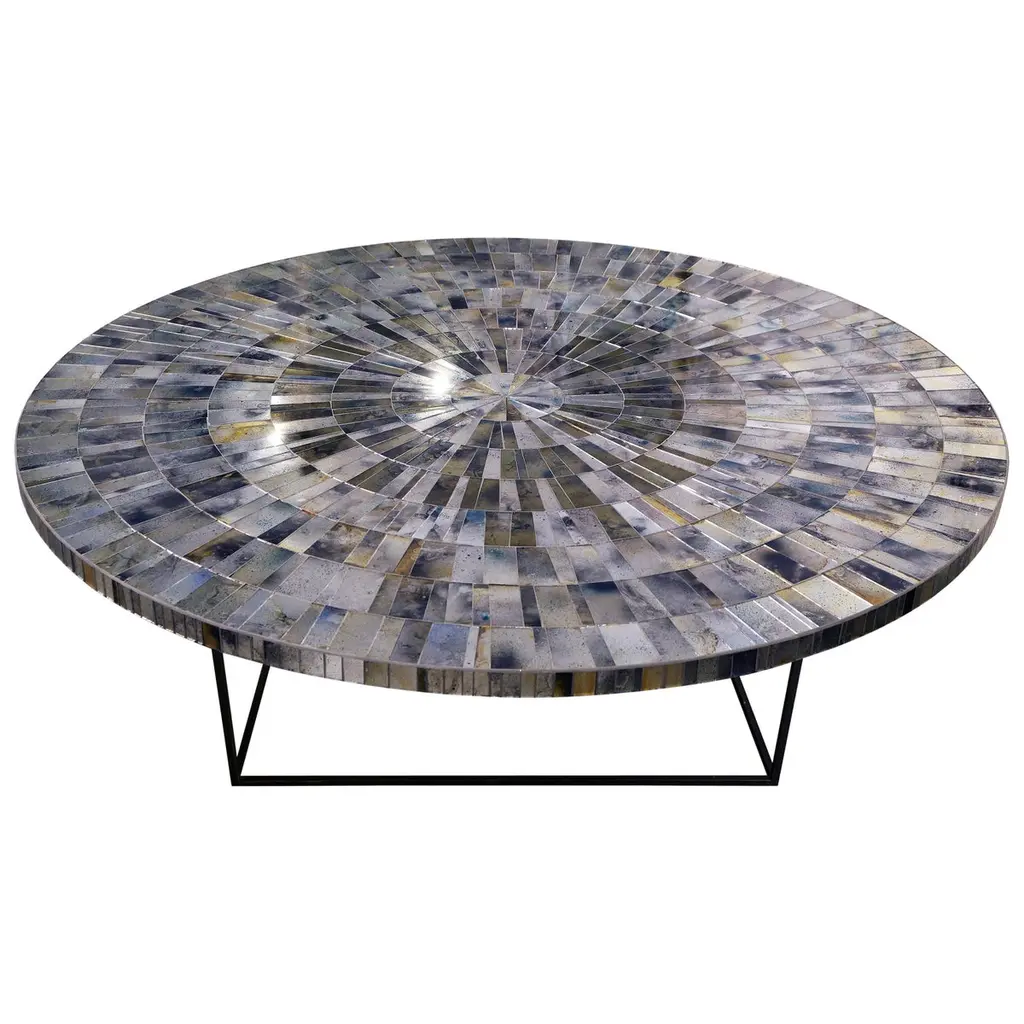 Aqua (églomisé) mosaic coffee table designed by Ercole Home with hand painted glass mosaic surface in Sunburst pattern.The base is made of 1/2" thick tubular metal in natural steel finish.Custom sizes and finishes are available. You can choose varying styles and heights to the bases.Made in New York City.