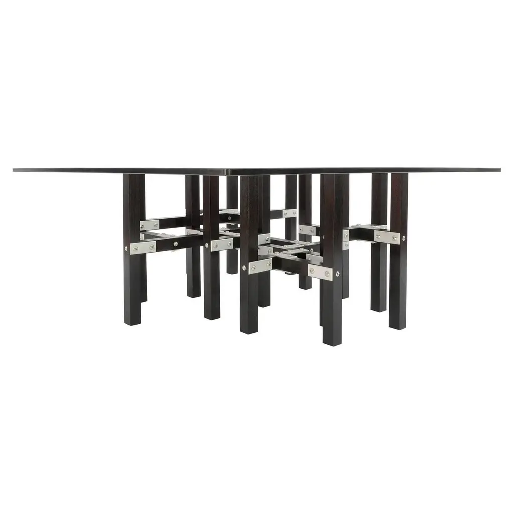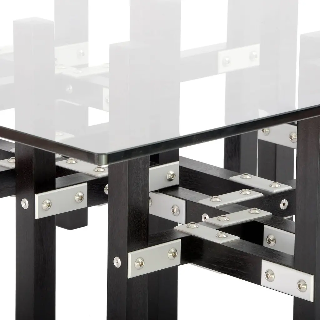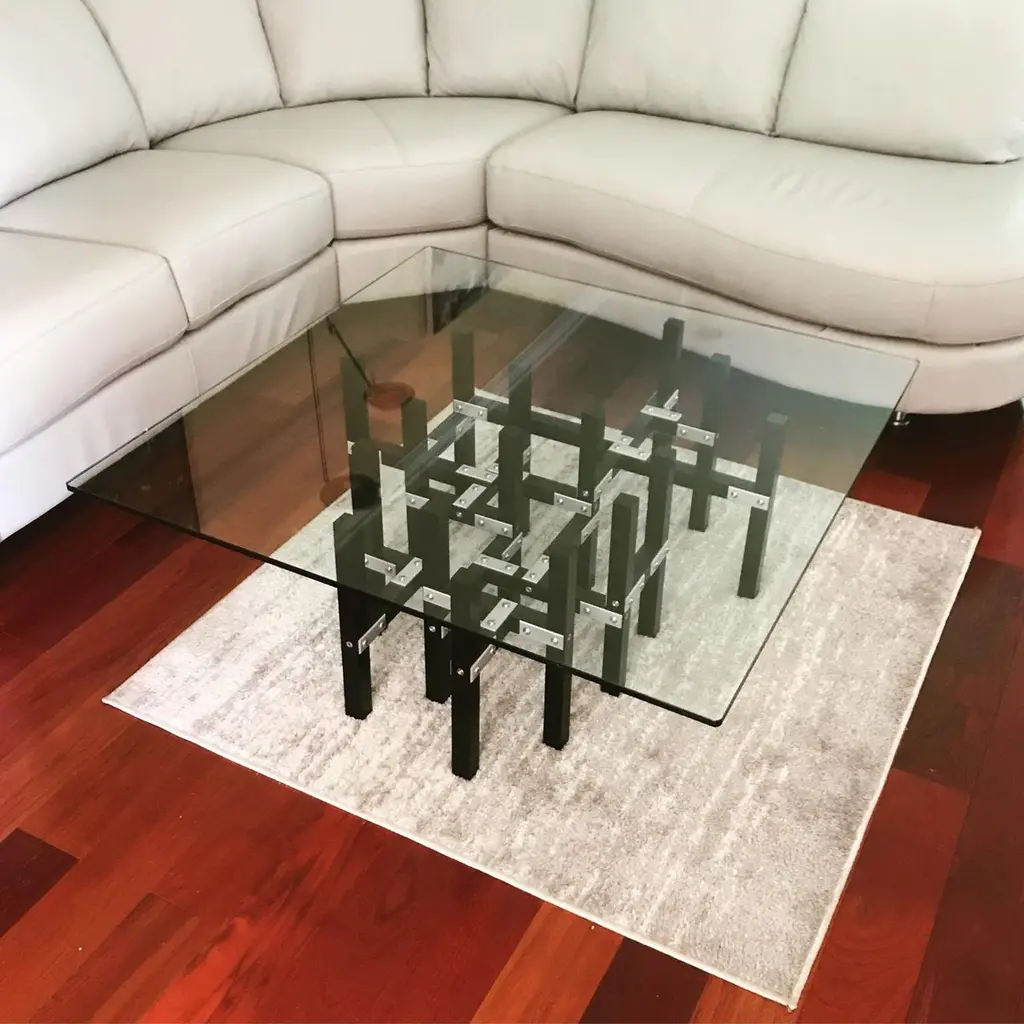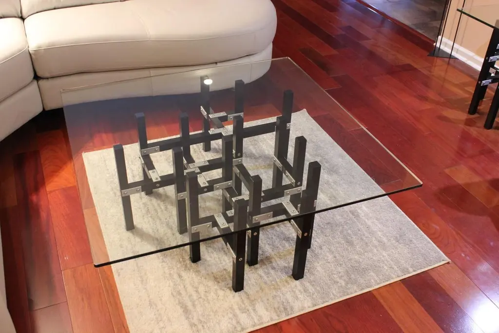 The Metis table by Peter Harrison has Industrial brackets connecting its many elements. This square coffee table has 16 legs which visually vibrate your eyes. Levelers in each leg assure that the table can be adjusted to any floor. The wood pictured is dyed black Mahogany. The plates are aluminum, the bolts are all stainless steel. The top is 1/2" thick tempered glass that measures 42" x 42".The Metis table is designed and meticulously crafted by Peter Harrison in his Upstate New York studio and sold studio direct. Questions? I respond quickly to the message system!