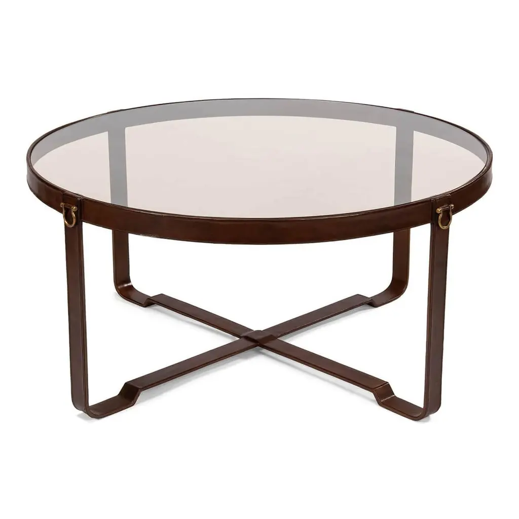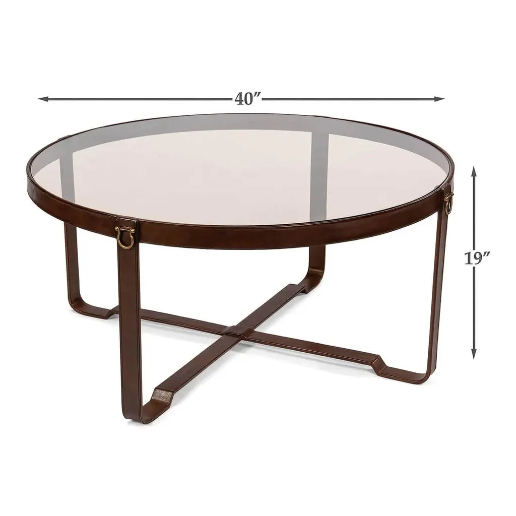 A modern leather-wrapped glass top round coffee table. The sleek glass top sits on metal legs covered in antique leather with brass details. The brass details on the sides give this piece an equestrian feel. Dimensions: 40" W x 40" D x 19" H.