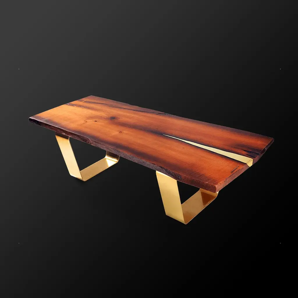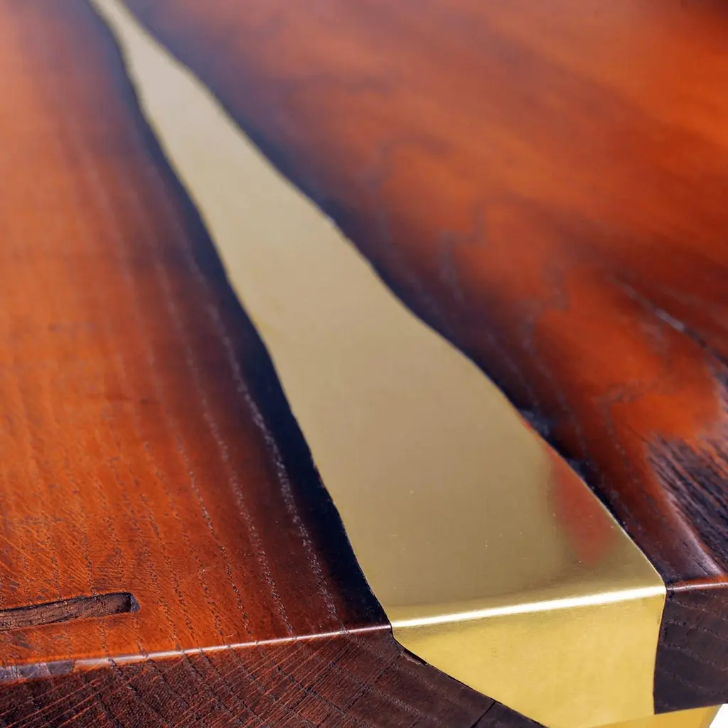 With modern brass legs and brass injection in wood this unique peace of artwork is almost invaluable! The finish is wonderfully smooth to the touch and looks fantastic. Brass can be replaced with any other metal, even wood tone can be changed. Let`s make your table unique and special!Dimensions:Width 146 cm (57.48 inches) x depth 65 cm (25.59 inches ) x height 45 cm (17.72 inches)Materials: oak/ Legs - solid satin brassFinish: stained and oiledWeight around 50kgMade to orderCUSTOMIZATION AVAILABLE - Different colors, materials, finishes and customized sizes available upon request. If you’re interested in a customization that is not currently listed, please contact Kanttari.BESPOKE – We do create individual and fully customized designs. Please contact Kanttari to discuss your specifications.MANUFACTURING – we fully hand-craft each piece in our workshop by our best craftsmen. Production lead time may take up to 9 - 12 weeks, bespoke items may be longer – depending on the exact specification and availability of materials chosen. For more information please contact Kanttari.SHIPPINGCarefully packaged in wooden crate.Fully insured.Request a customized shipping quote.