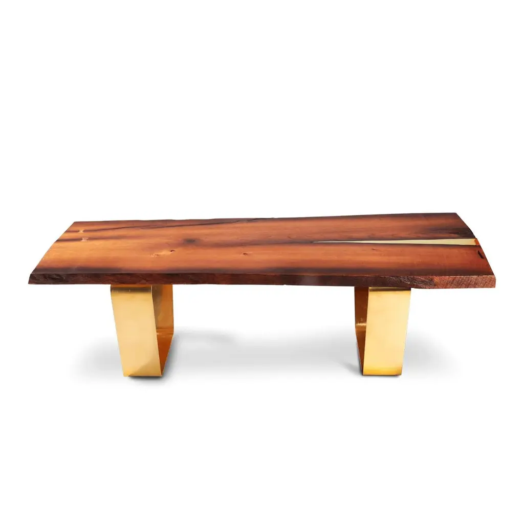 Modern Live Edge Wood Coffee Table In Brass, Gold, Copper
