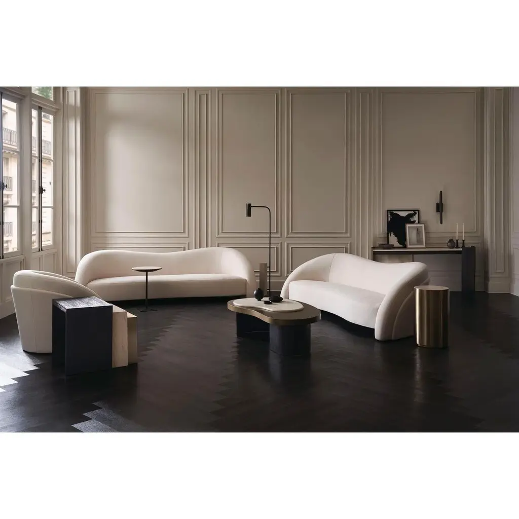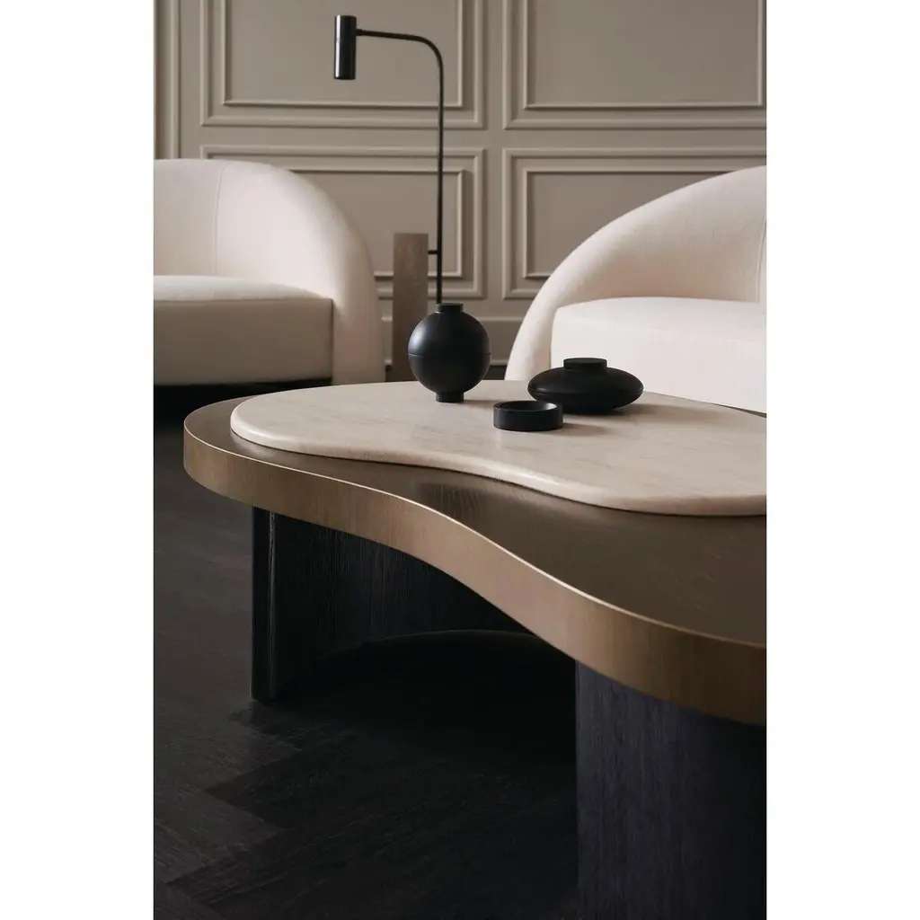 An artistic expression of modern elegance, this cocktail table adds interest and fluidity to living interiors. Its sleek design is comprised of an asymmetrical top crafted from radiating quarter sawn oak in Lucent Bronze, accentuated by a kidney-shaped travertine stone section for added depth and striking contrast. A curved pedestal base in a dramatic Cinder finish naturally mimics its sense of movement.Dimensions: 56.5" W x 31.5" D x 15" H