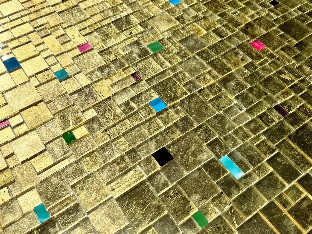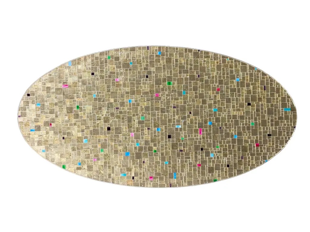 Ercole Home's Modern Oval Moon Gold Mosaic coffee table is a beautifully designed piece that blends modern lines with sophisticated materials. The sleek oval shape is covered in a stunning mosaic pattern, featuring hand-cut gold eglomise a glass with small specs of jewel tones glass. in our geometric Mondrian design. The table top is raised above a minimalist metal base, contrasting with the intricate mosaic pattern. Custom sizes, glass, and metal finishes are available. Top also available without metal base. This piece is skillfully hand crafted by Ercole's team of mosaic artists at our Brooklyn, NY studio.