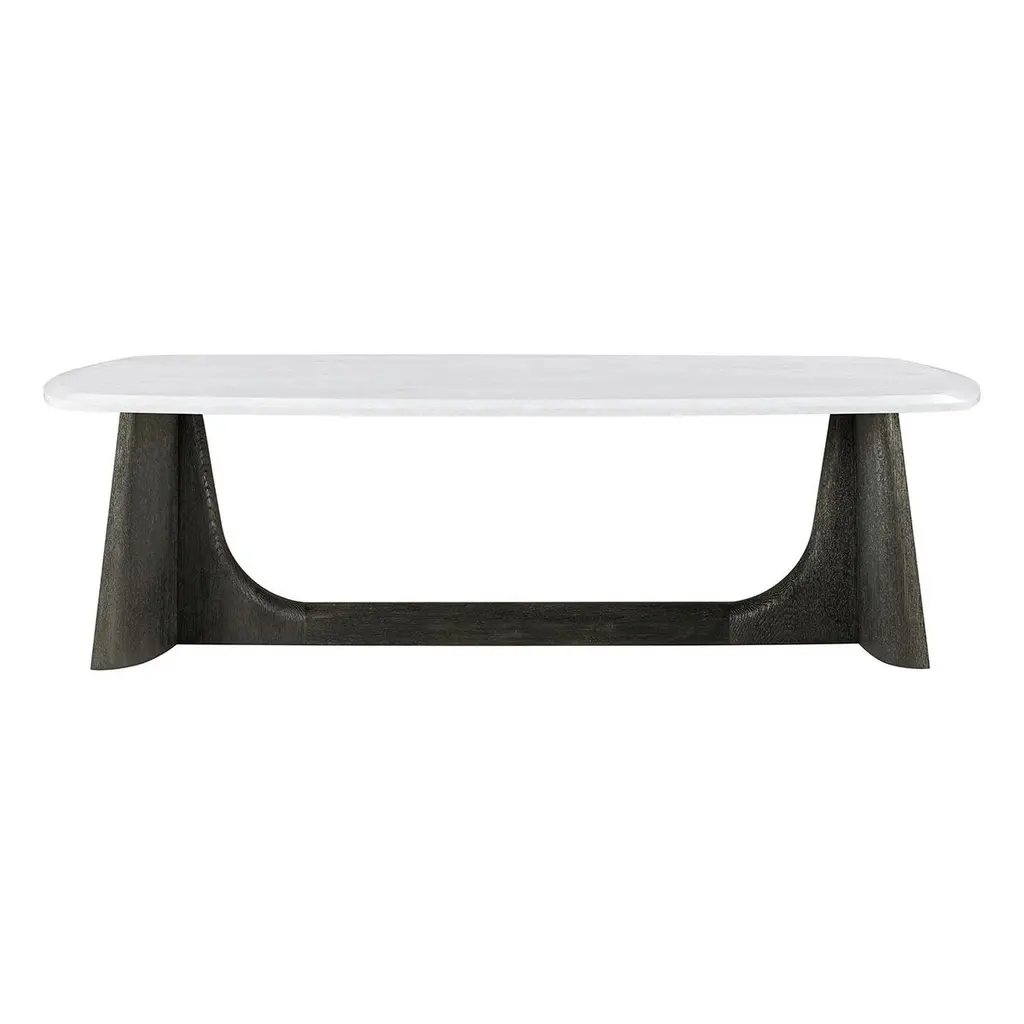 With a beveled edge white quartz top standing squarely on solid trapezoid-style trestle end base. Finished in a dark charcoal oak to the ends and long stretcher. Dimensions: 55" W x 32" D x 16.5" H