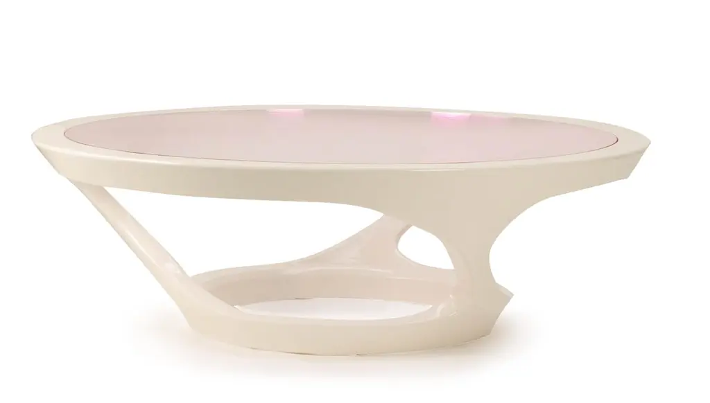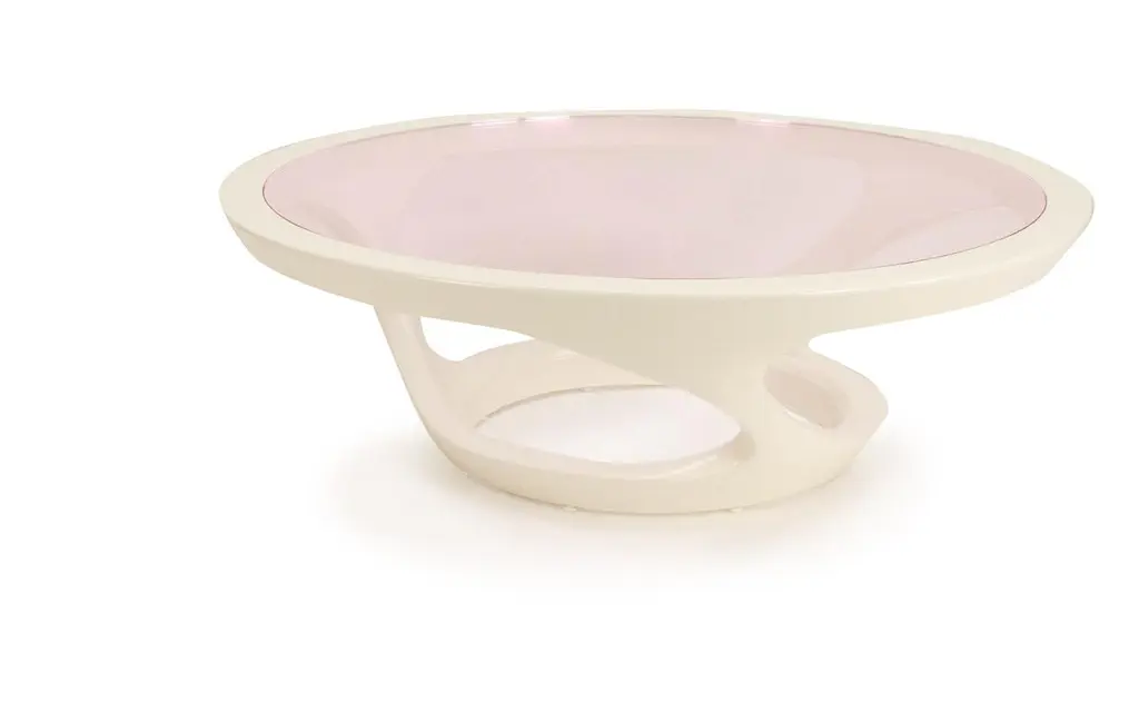 Our Alkahest coffee table is a round table with a carved base lacquered in white with a pink Lucite top. Made in our Connecticut workshop. Size, Lucite and base color are customizable.Measurements:53" diameter x 17 1/2" height.Customization may change price. Allow 8 weeks production time.