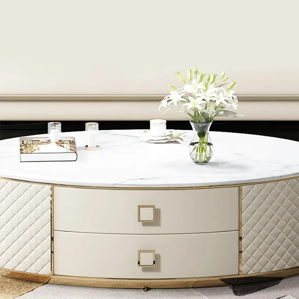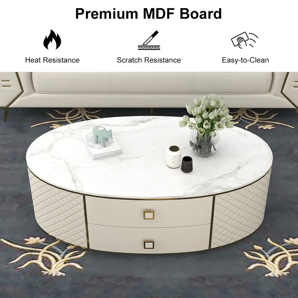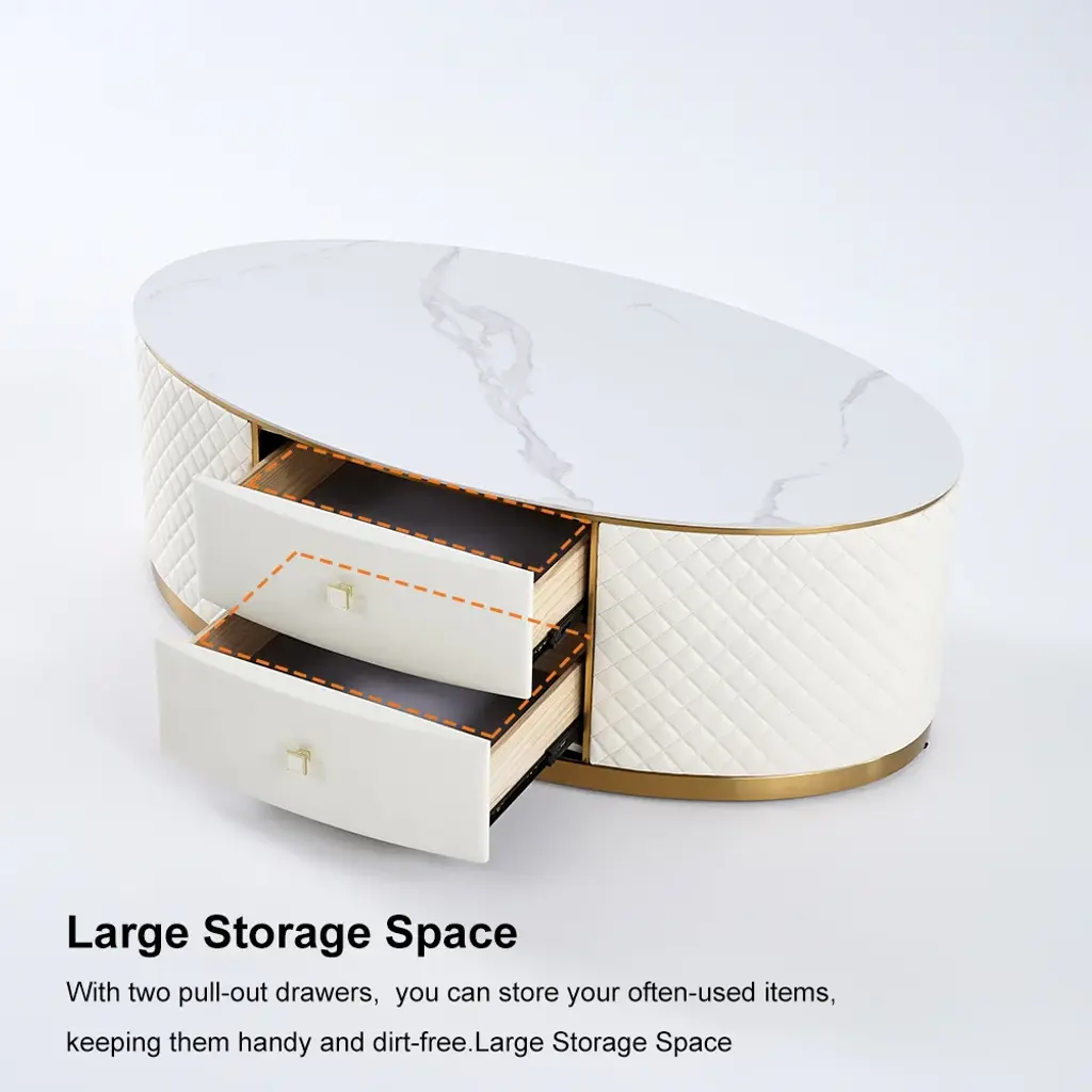 Modern White Oval Sintered Stone Top Coffee Table Microfiber Leather With 2 Drawers