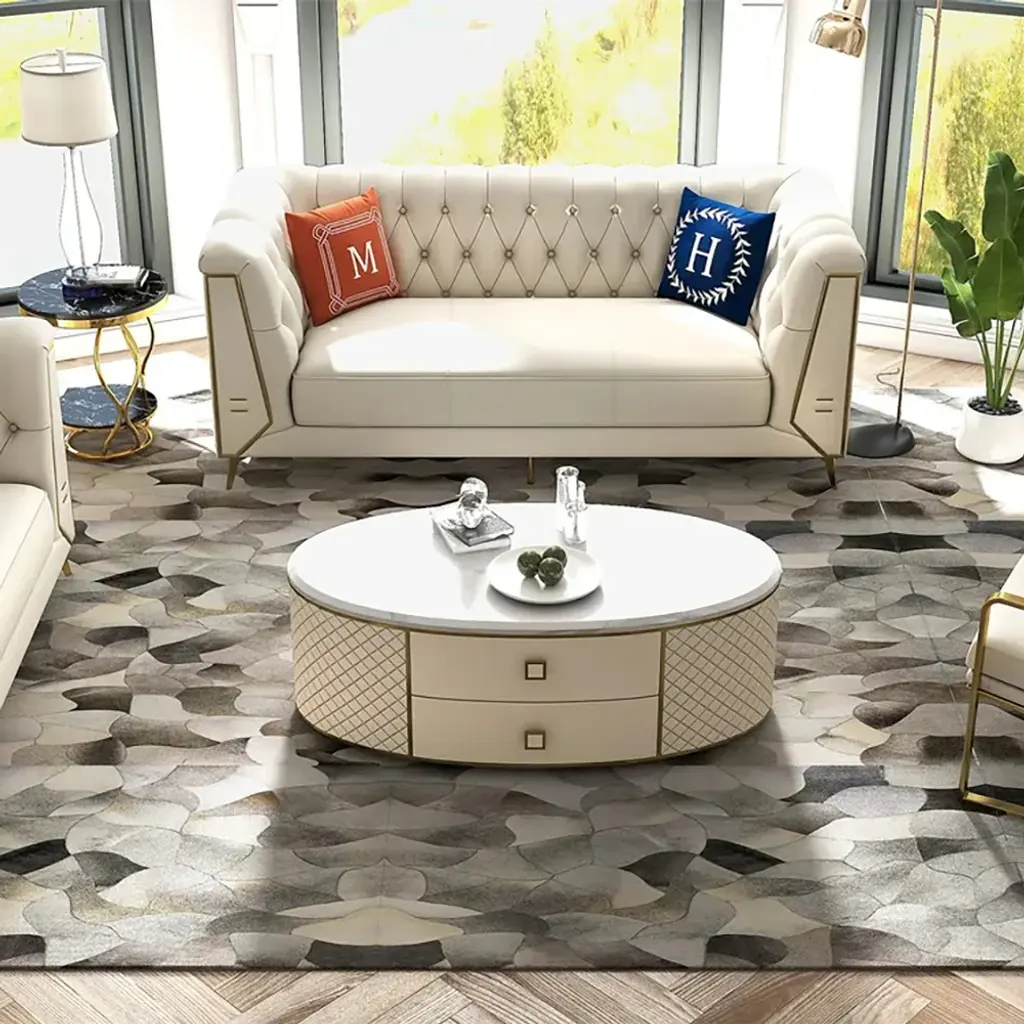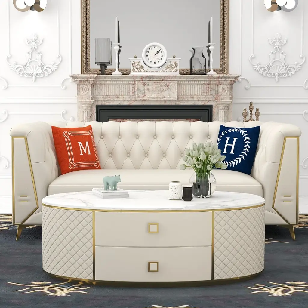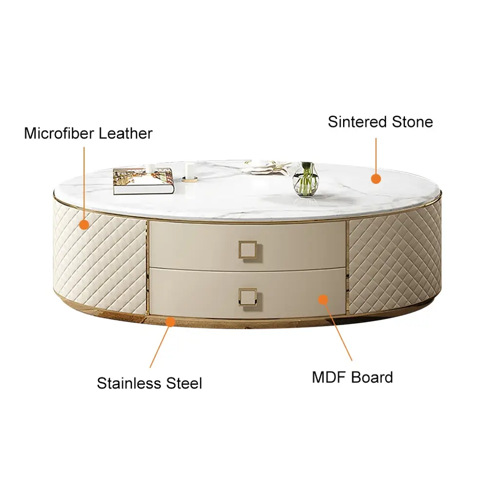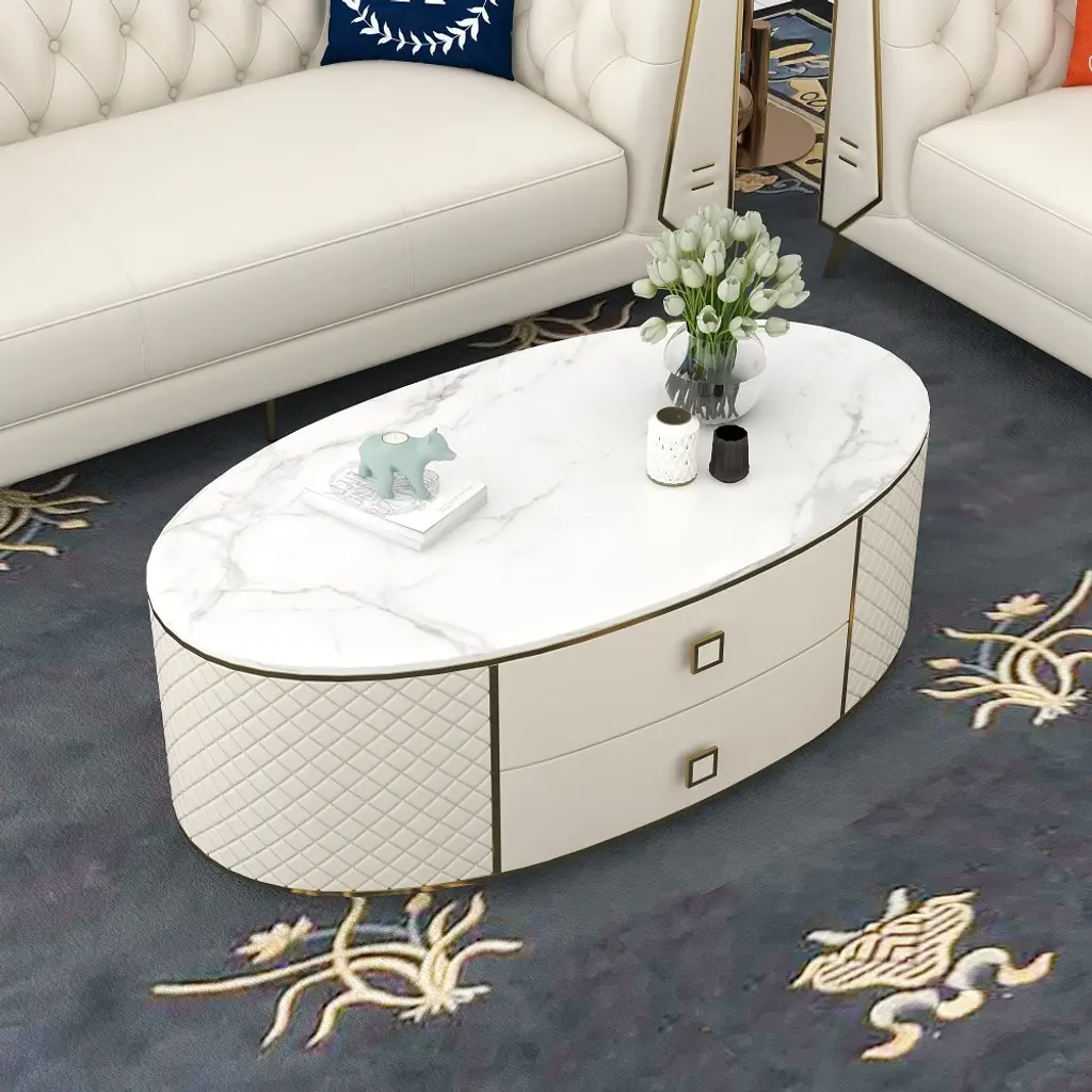 Modern White Oval Sintered Stone Top Coffee Table Microfiber Leather With 2 Drawers