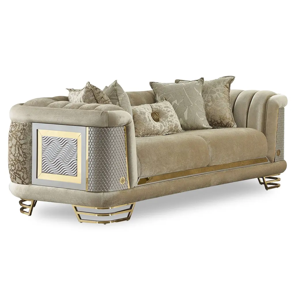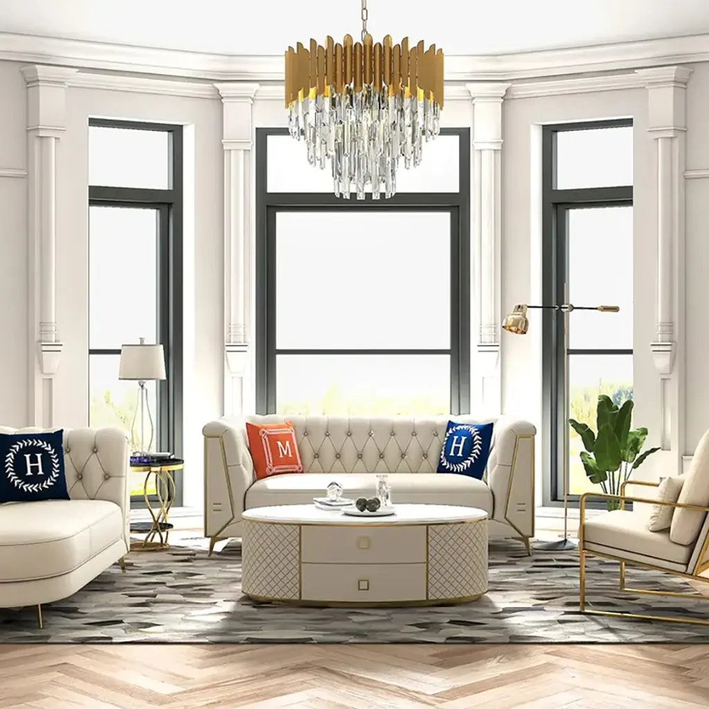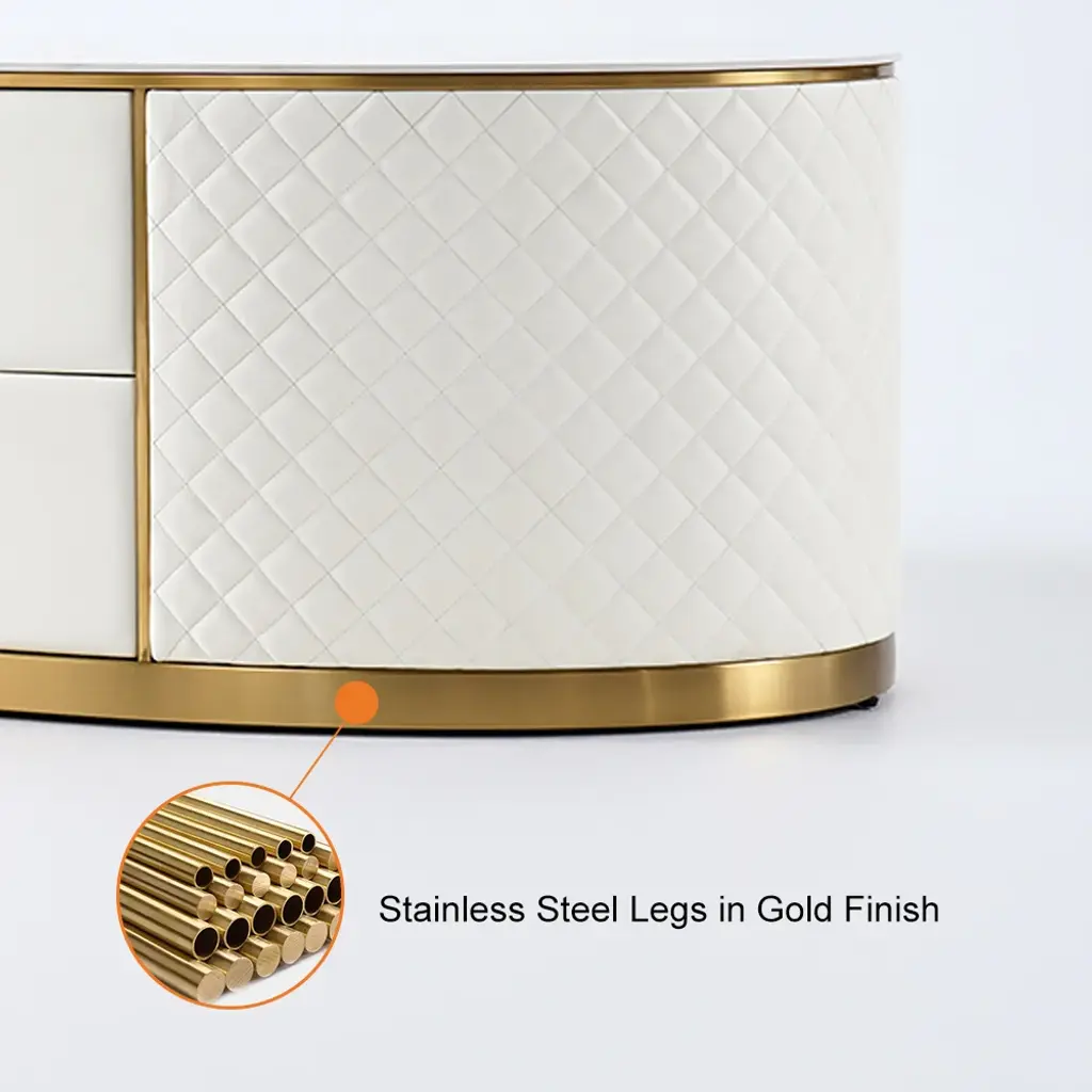 This elegant oval coffee table combines a sintered stone top with gold stainless steel and microfiber leather. Featuring two spacious drawers for organized storage, its curved design and luxurious materials create a stunning centerpiece for any modern living space.