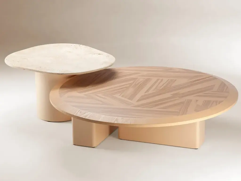MOMENTS is a walnut with Emperador marble base coffee table. The smooth rotating movement of the two circular tops gives its name to this unique side table. The marble base gives it firmness and sobriety, which contrasts with the modular play of the wood. Its upper top is supported by a subtle piece, a detail that accentuates the exquisiteness of this piece of furniture.Wood options:Natural solid walnutBlack ashMarble options:EmperadorSahara NoirCalacatta Gold