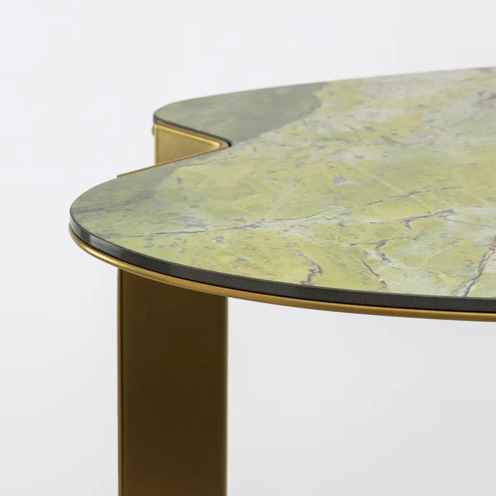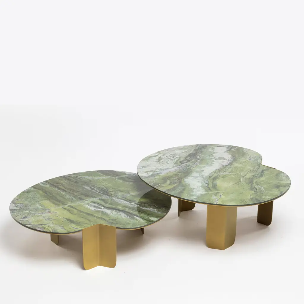 A design of rare elegance that reveals its inspiration from water lilies - recurring elements in Monet's paintings - at first glance, this coffee table reinterprets organic shapes in a stunning modern version. The three bent steel legs painted in gold sustain a sinuous porcelain stoneware top with a shiny green marble effect. A smaller version is available in the Artemest catalog