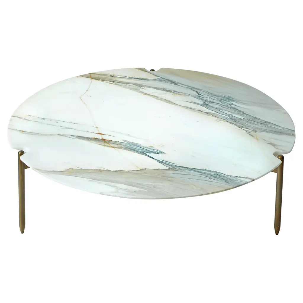 120Nature meets geometry in this sublime coffee table of phytomorphic inspiration. As suggested by its name, its artful silhouette is an homage to the water lilies so dear to Monet. Bent steel legs painted in gold offer elegant support to the porcelain stoneware top, marked by a scalloped profile and distinguished by a shiny green marble effect. A larger version can be found in the Artemest catalog.
