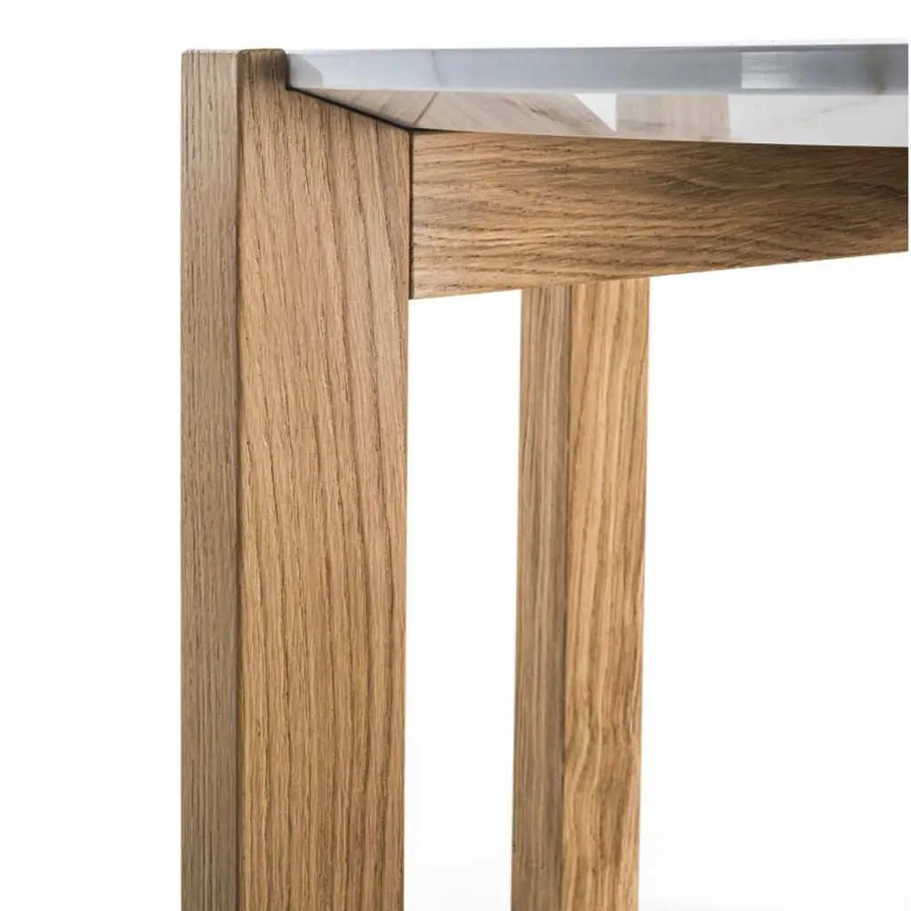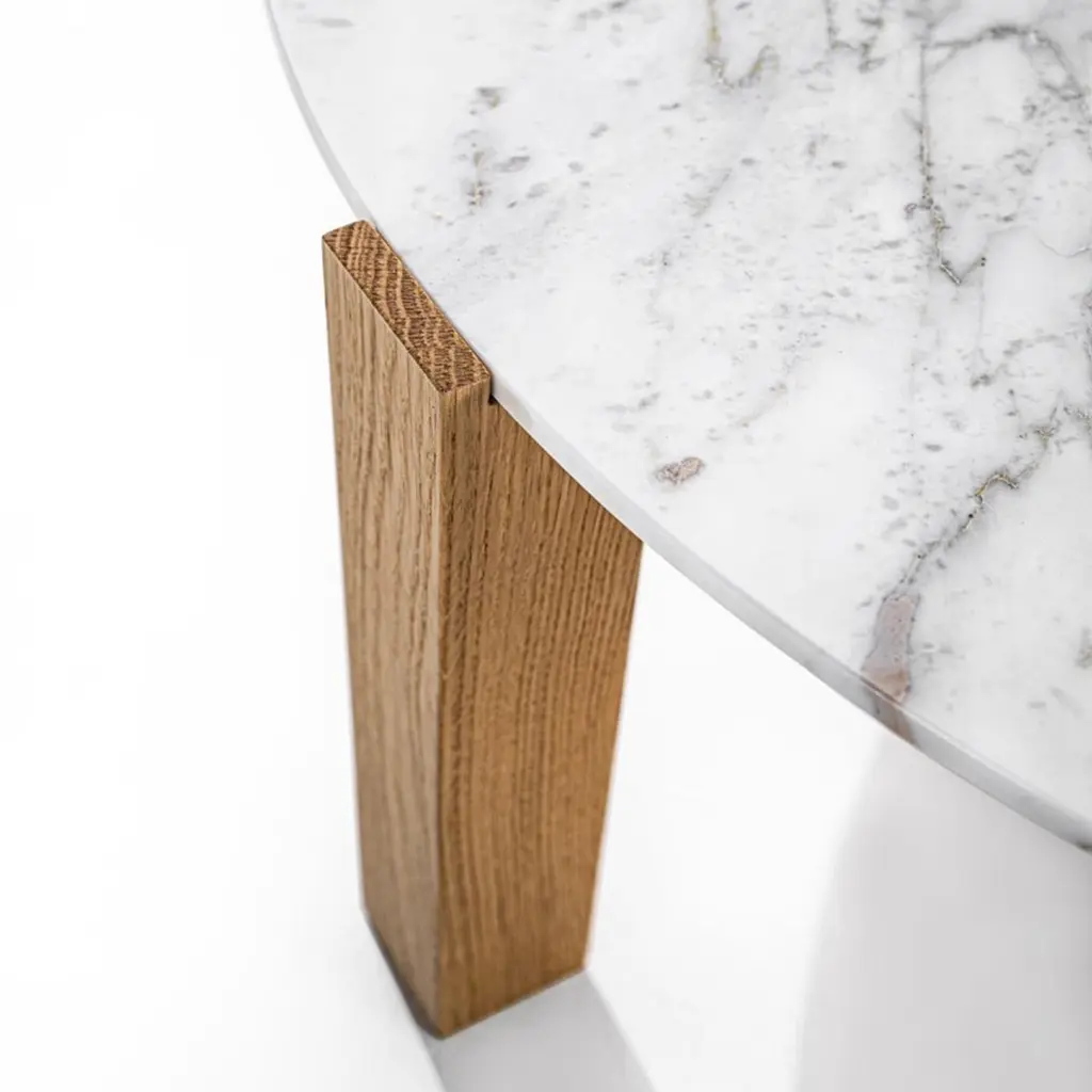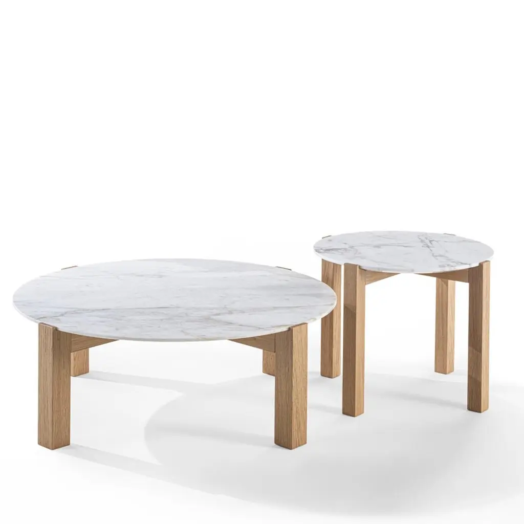 A showcase of unpredictable, intriguing natural traceries represents the spontaneous decoration of this stunning coffee table. A sturdy base in solid wood consisting of rigorously-sculpted legs welcomes the superb circular white marble top in discreet recesses that reveal the thoughtful crafting process behind a seemingly simple design. A smaller yet taller version is also available.