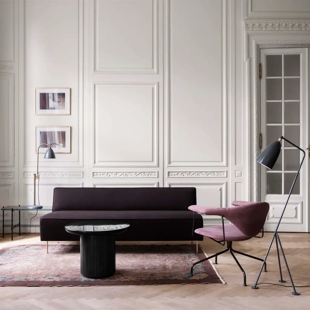 With the grand expanse of its marble top defined by spare contours, this coffee table readily makes a statement. Space Copenhagen devises a luxe but low key composition of circular forms denoted by its name Moon. Playing against the visual interest of the stone, the round base has a sleekly bevelled surface.