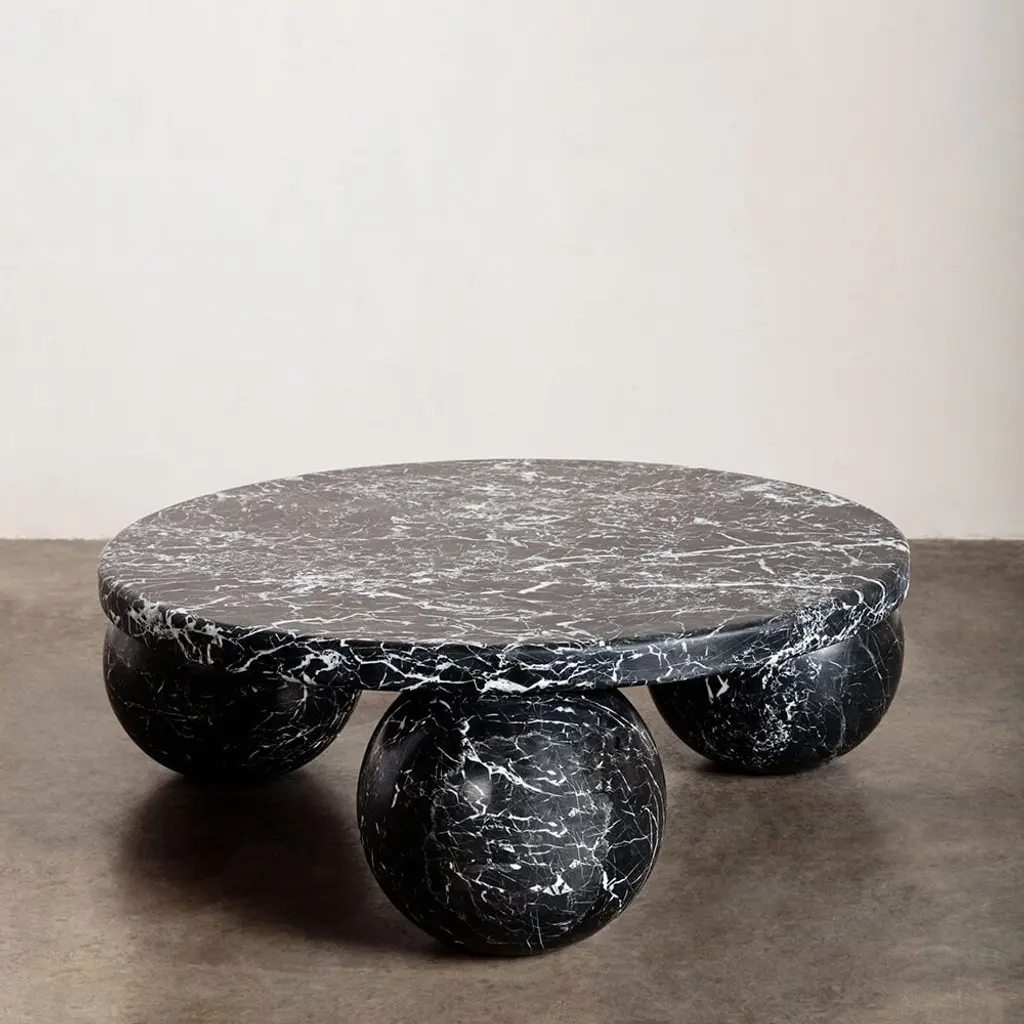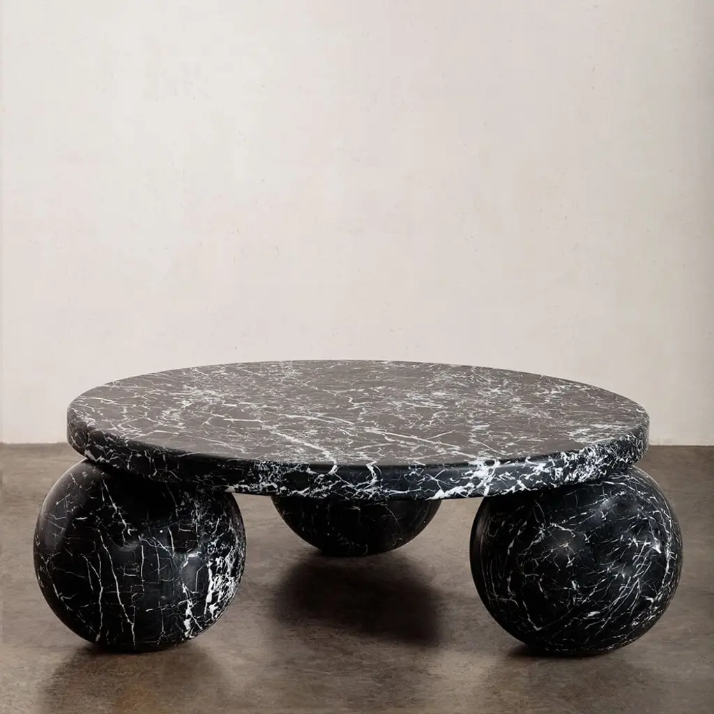 Hand carved from solid stone, the Morro Coffee Table exemplifies modernity through geometric simplicity and form. The sculptural 3-sphere base and substantial top are each composed of solid stone with a honed finish that enhances the richness of this beautiful natural material. Hand crafted in Los Angeles.