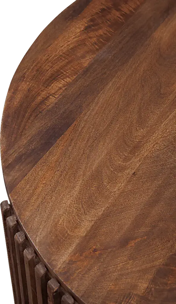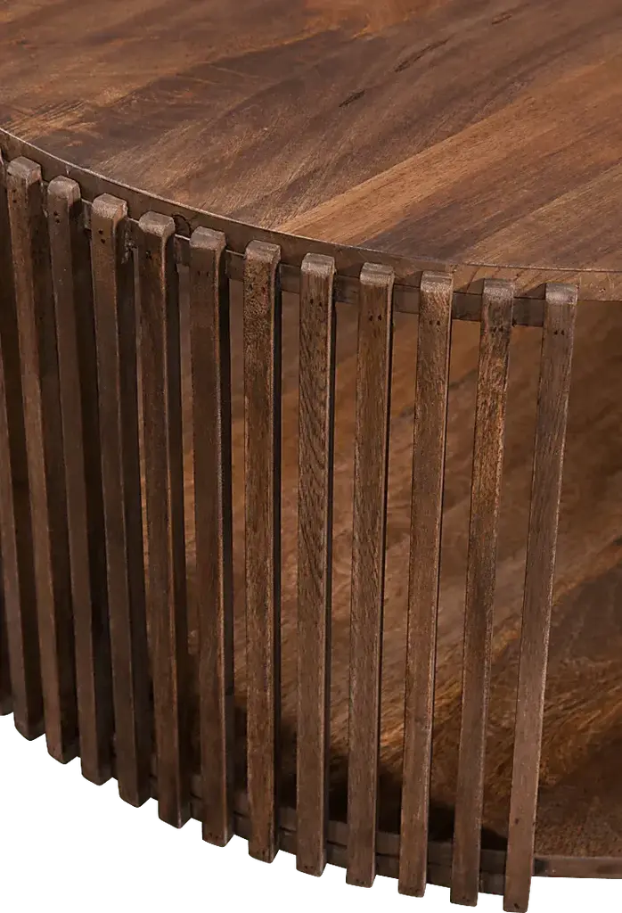 The Munia round coffee table features an open concept design, with spindle slats along the sides, exposing bottom shelf that is perfect for housing reading materials or showcasing decorative accessories. The design exudes rustic, industrial, and mid-century modern styling in a dark mango finish that will complement any living room or den. The cocktail table is also ideal for coastal home decor. Solid mango wood construction ensures durability and longevity, and the circular design will balance any space. Customer assembly is required.