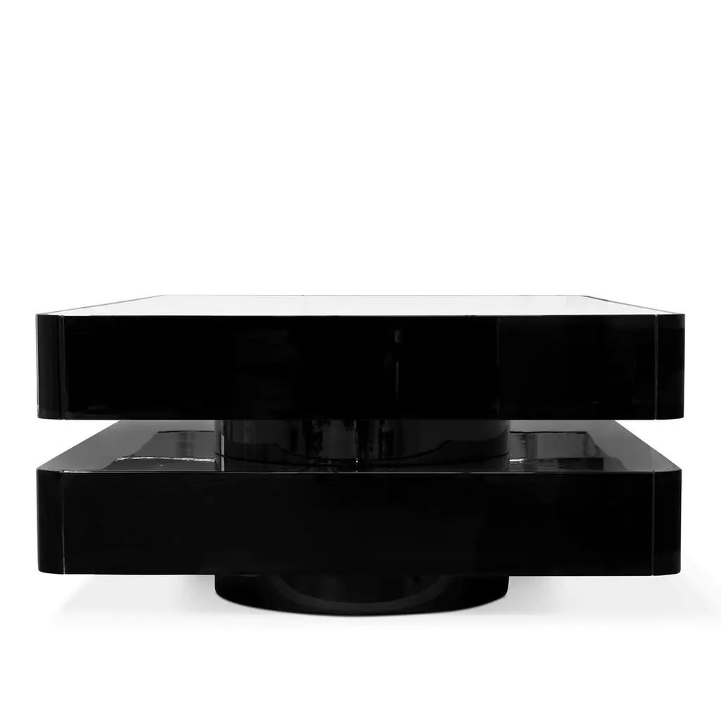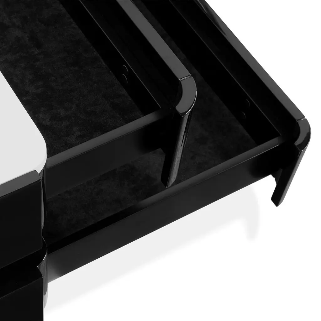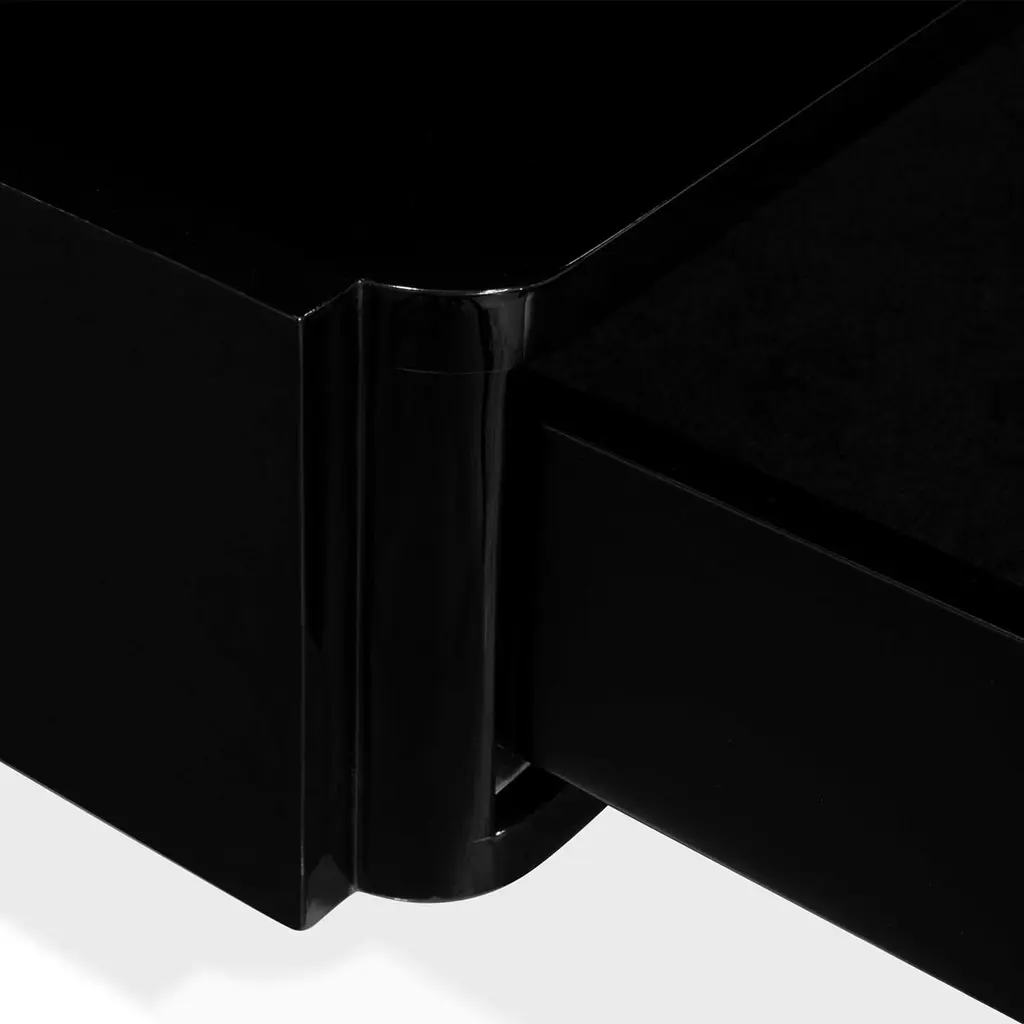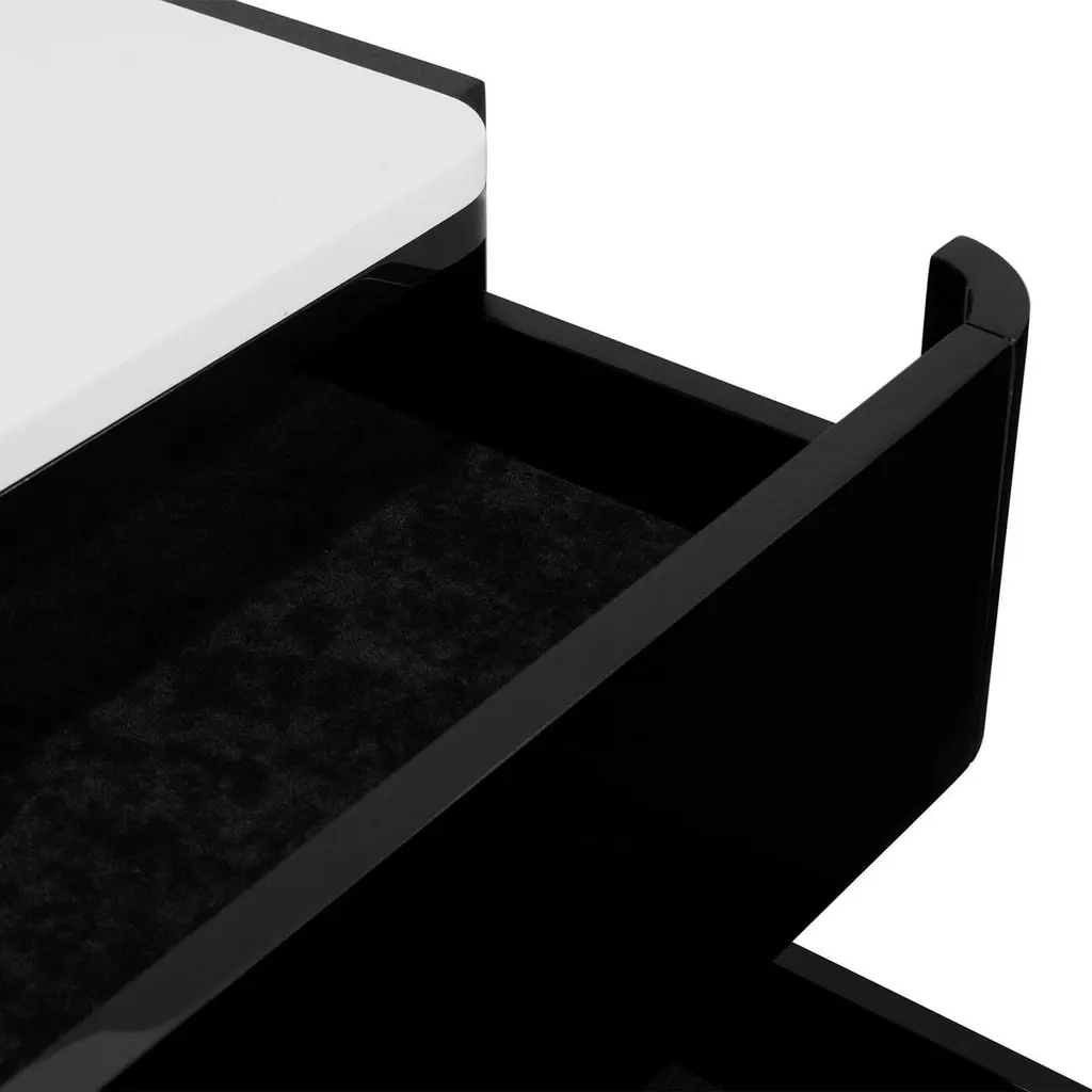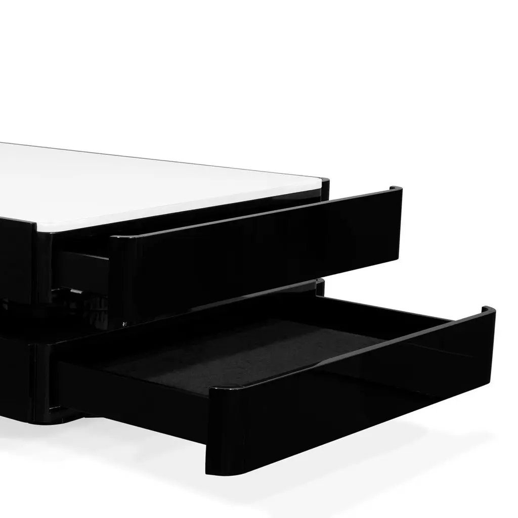 Coffee table Nagoya with structure in solid ash wood,with ash veneered top with white transparent paint andbody in ash wood in black lacquered finish. Including 4drawers, 2 drawers on each smaller sides, with easy glidesystem.
