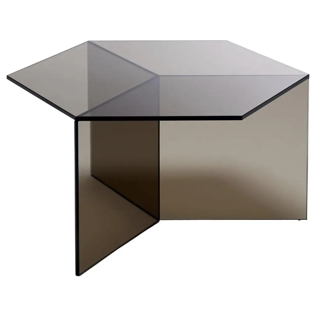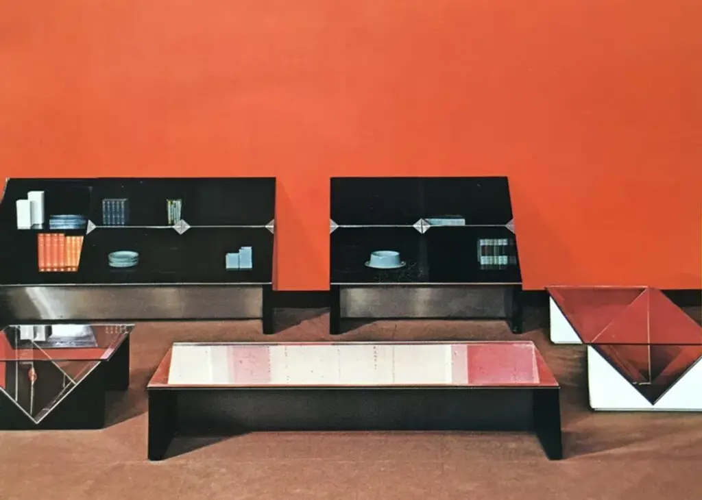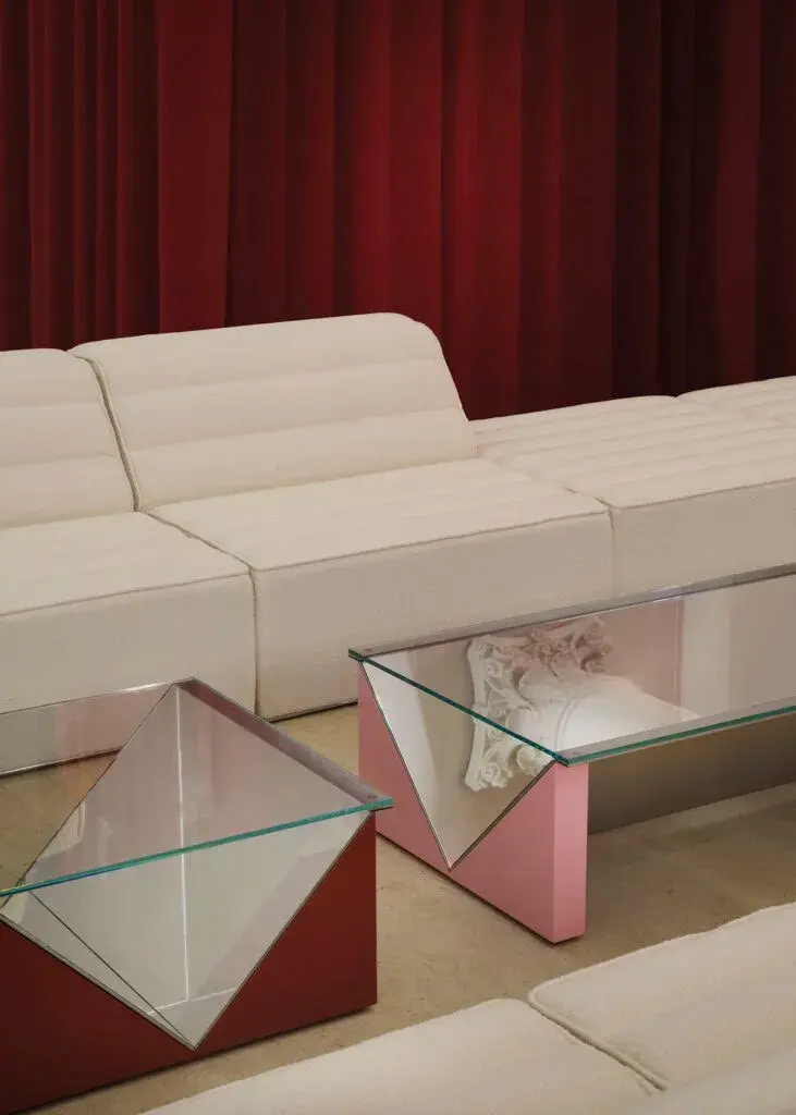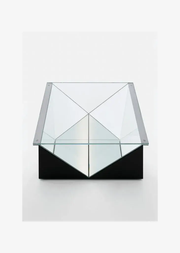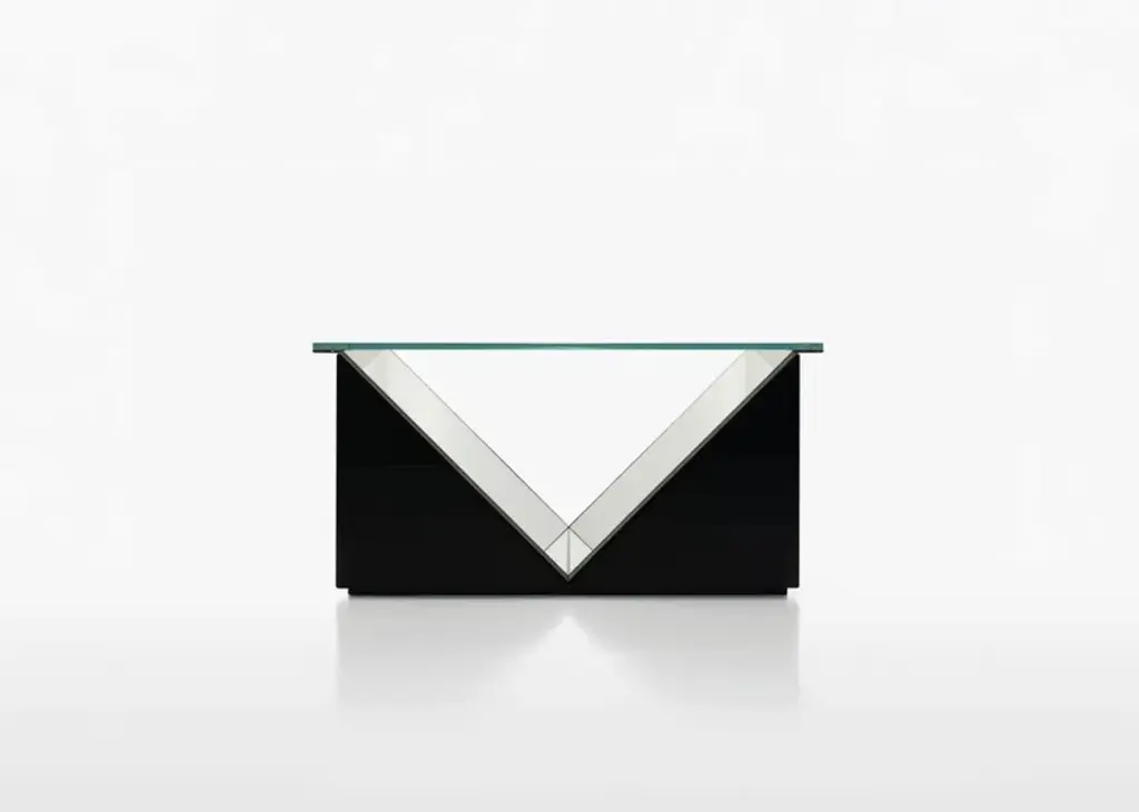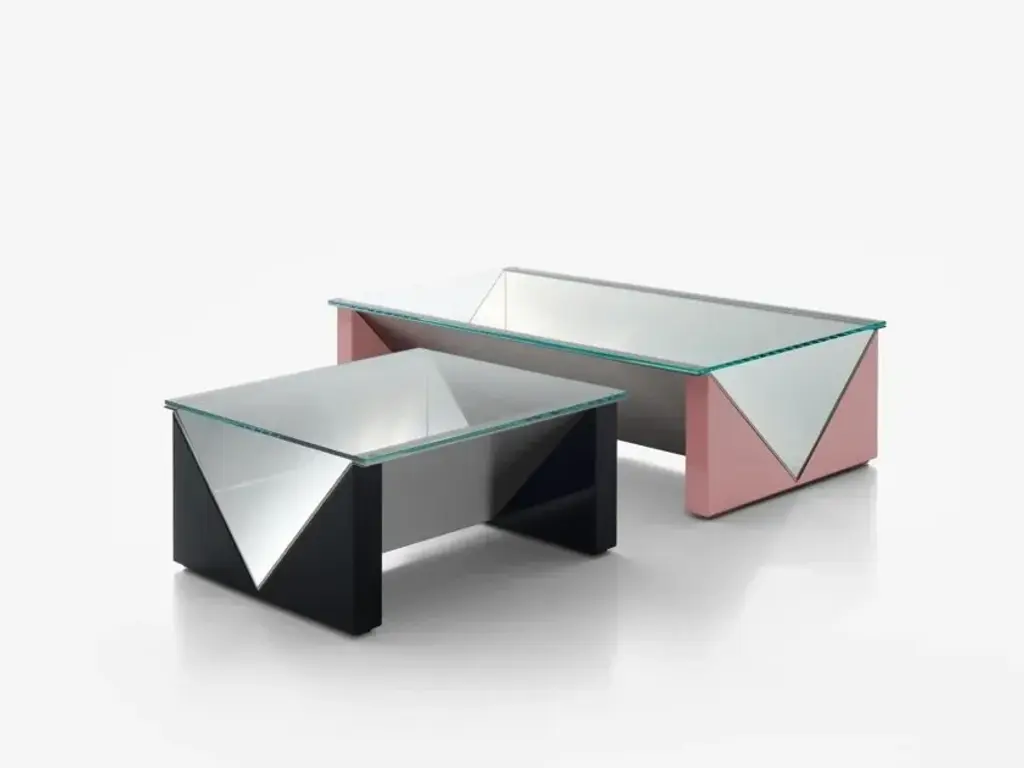 At the 15th Milan Triennale in 1973, Claudio Salocchi launched the Napoleone family of tables, coffee tables and display units, an extremely synthetic interpretation of geometries combined with materials that were anything but usual for traditional home furnishings at that time. The fascinating effects of reflections and transparencies allows those sitting down to see their own image, with interesting ‘introspective’ implications. The current re-edition respects the original design and keeps its aesthetic appearance unchanged in two coffee tables from the Napoleone system enhanced by distinctive polyester lacquering. TopThe top is made of 10 mm thick extra-clear tempered glass fixedto the structure with Ø12 mm bumpers.StructureBridge structure in satin-finish AISI304 stainless steel sheet thatbinds the two side panels and holds the two facing mirrors. The base is made of medium-density fibreboard, always with glossy lacquer in black, white, SW white, linen, sand, clay, burgundy, pink, dark green, mustard yellow, brick red, or navy blue. Matching skirting. Natural silver-plated mirrors fitted insidethe steel frame.