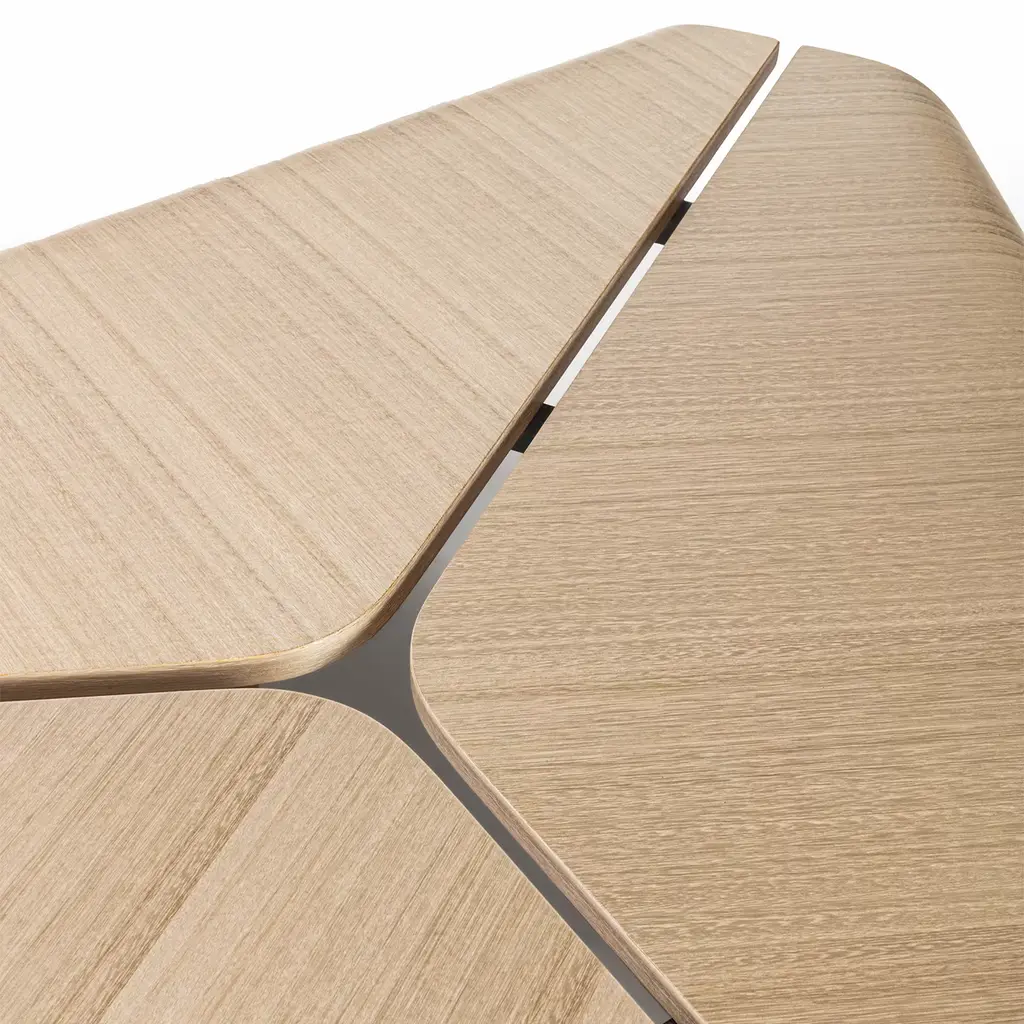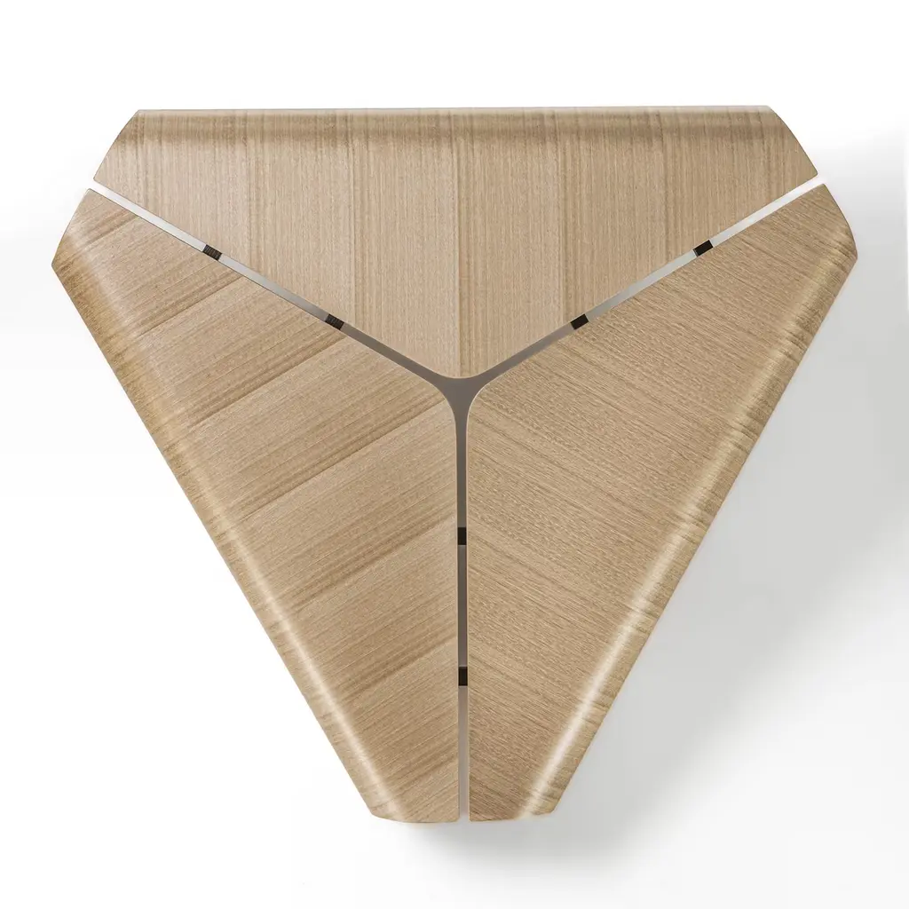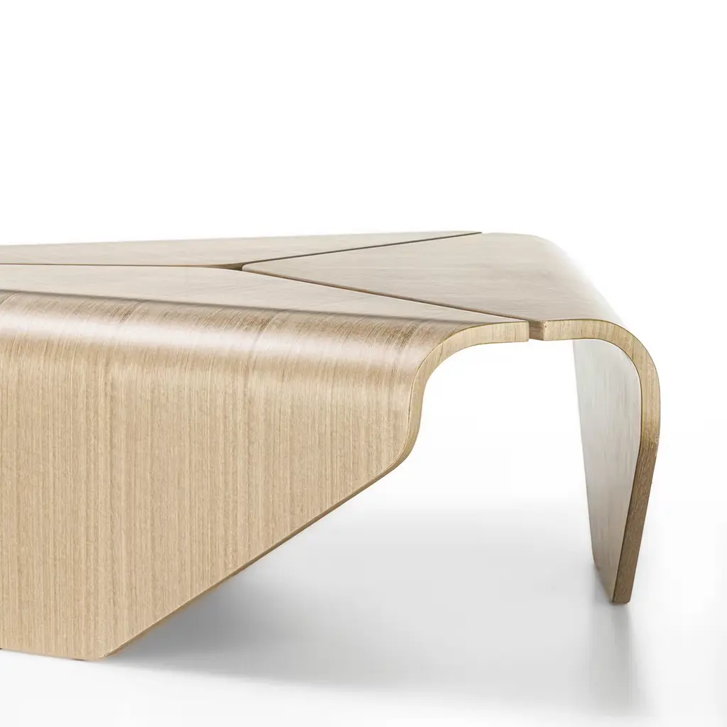 Cleverly bent to achieve a fluid, freestanding silhouette brimming with sculptural charm, three dynamically cut elements compose this captivating coffee table. The solid and bright eucalyptus frame flaunts linear woodgrain, attesting to the table's contemporary feel further reflected in the geometric inspired profile. Please contact the Concierge for available finishing variants. Designer: L. Silvestri and R&S Carpanelli.