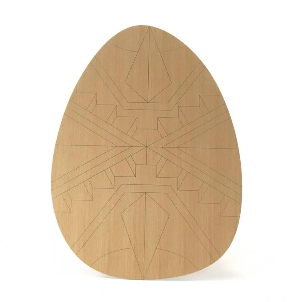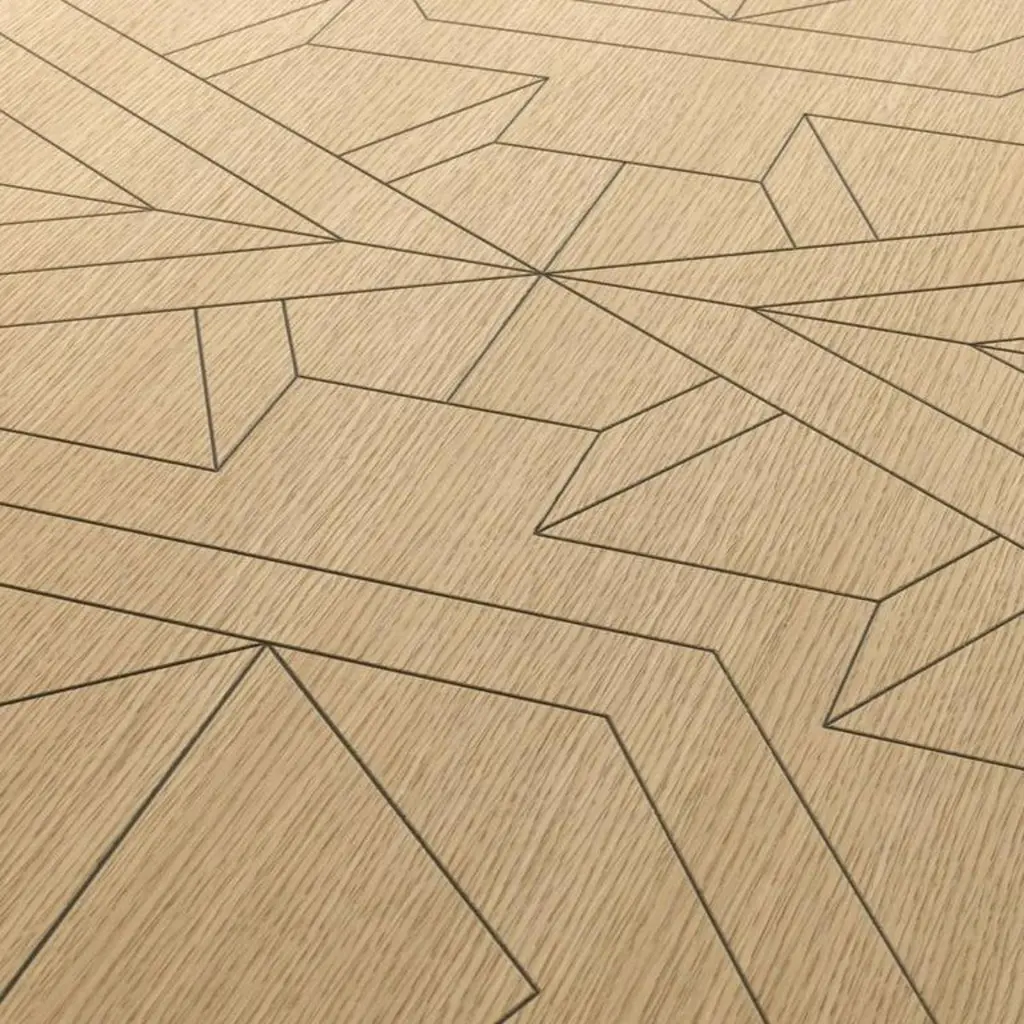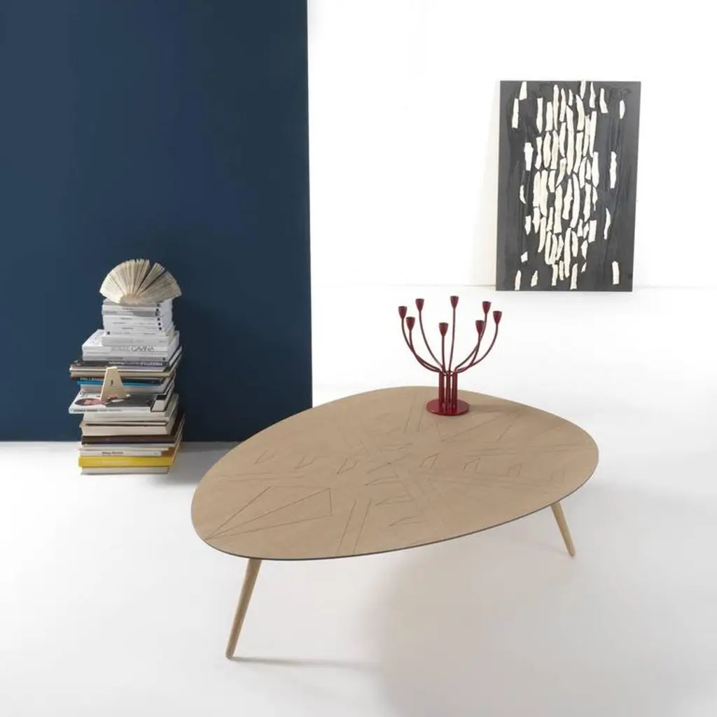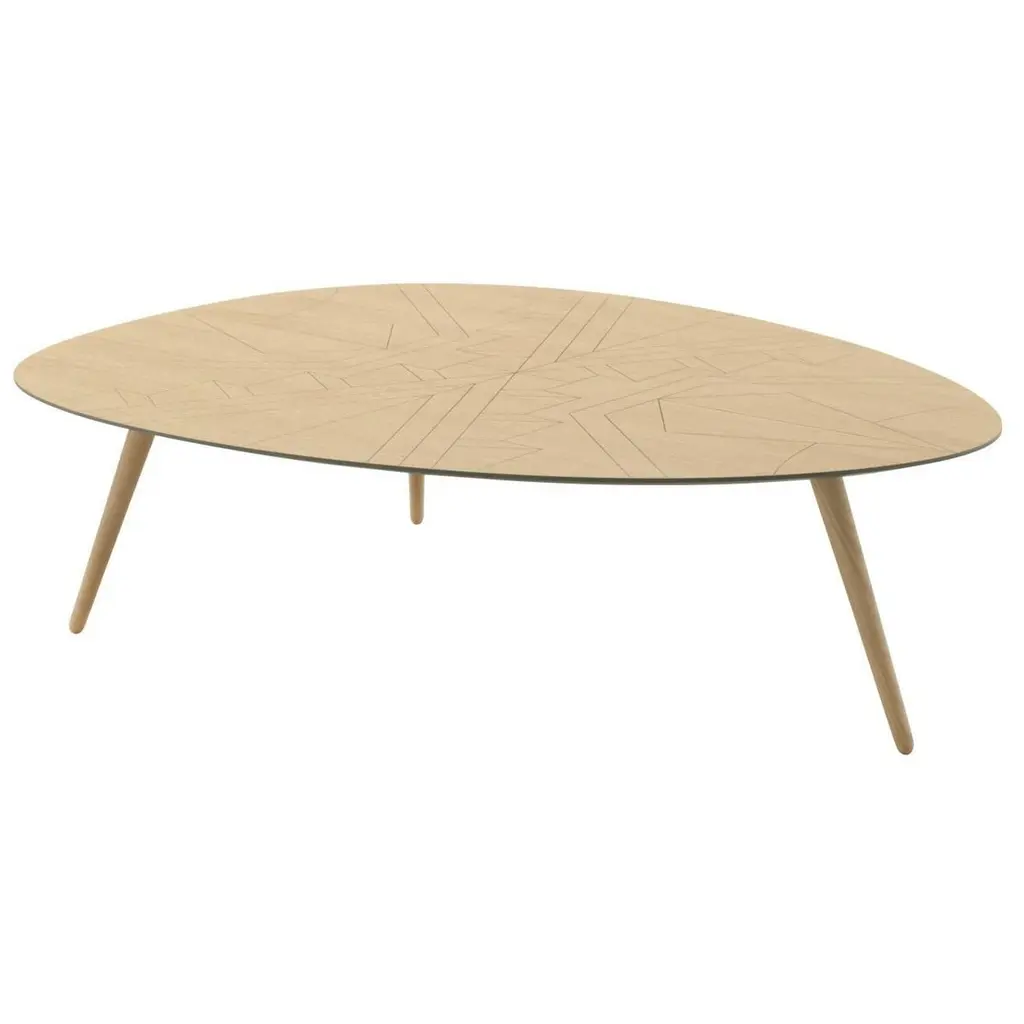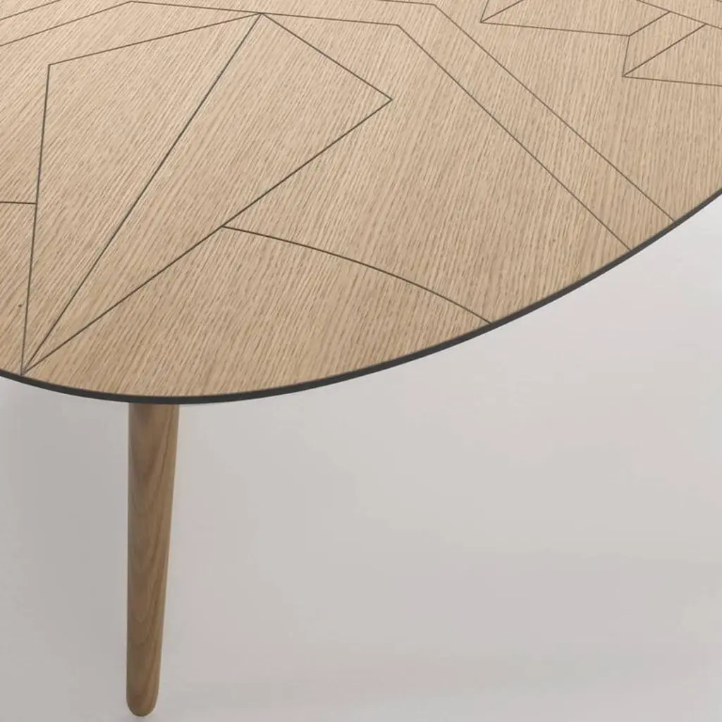 The top of this asymmetric and delicate coffee table is adorned with geometric decorations inspired by the hieroglyphics of the Nazca desert. The top is in oakwood and the legs in solid oakwood.