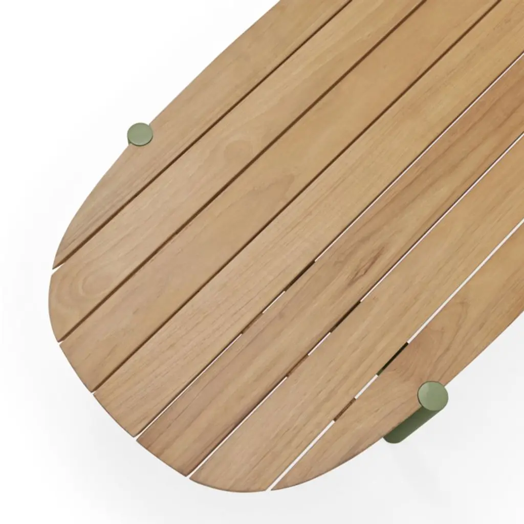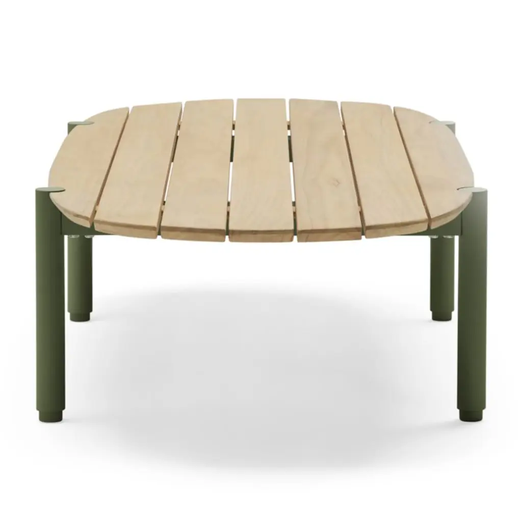 The mixed-material coffee table graces outdoor spaces with living-room style and all-weather durability. Slats of sustainably sourced teak fashion the oval top, tucked into a clean-lined aluminum frame with a matte powdercoat finish in olive green. The long, low-profile table sits comfortably before a sofa, sectional or grouping of chairs.