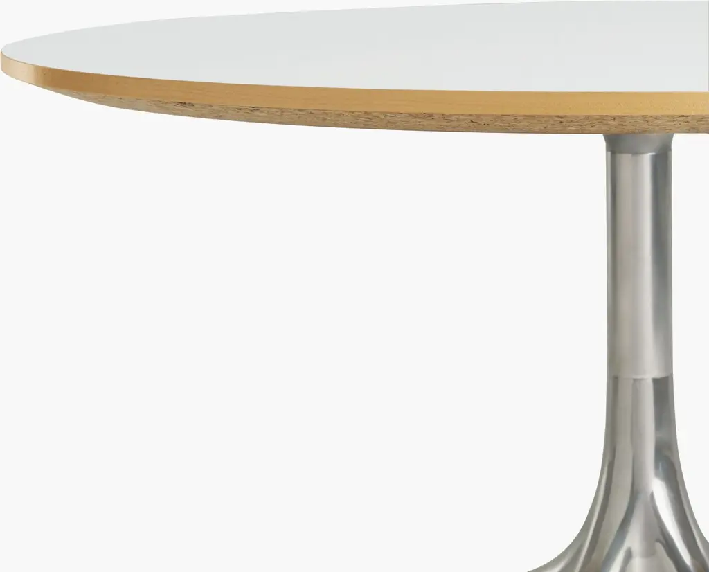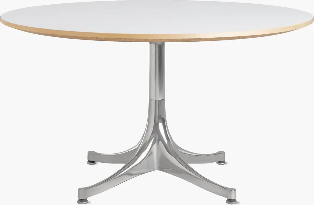 George Nelson's Pedestal Coffee Table (1954) adapts to many spaces and uses. From living room to waiting room, this table accommodates everything from vases and mugs to books and magazines. It features the clean lines and elegant simplicity typical of Nelson, with a round top covered in laminate or veneer mounted on a polished or white aluminum base. Self-leveling glides adjust to uneven floor surfaces. This is the authentic Nelson Pedestal Coffee Table produced by Herman Miller.