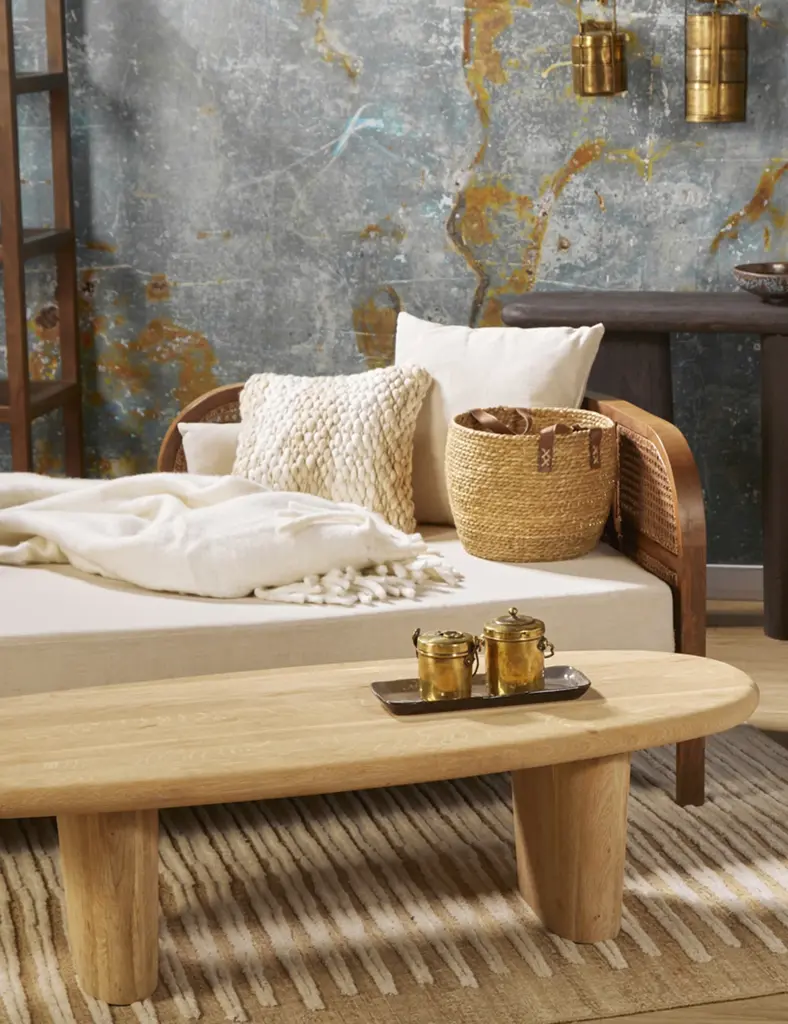 With interesting woodgrains and rounded edges, this coffee table pulls off a modern look with a softer appeal. Perfect for living rooms with a minimalist, yet whimsical, aesthetic!
