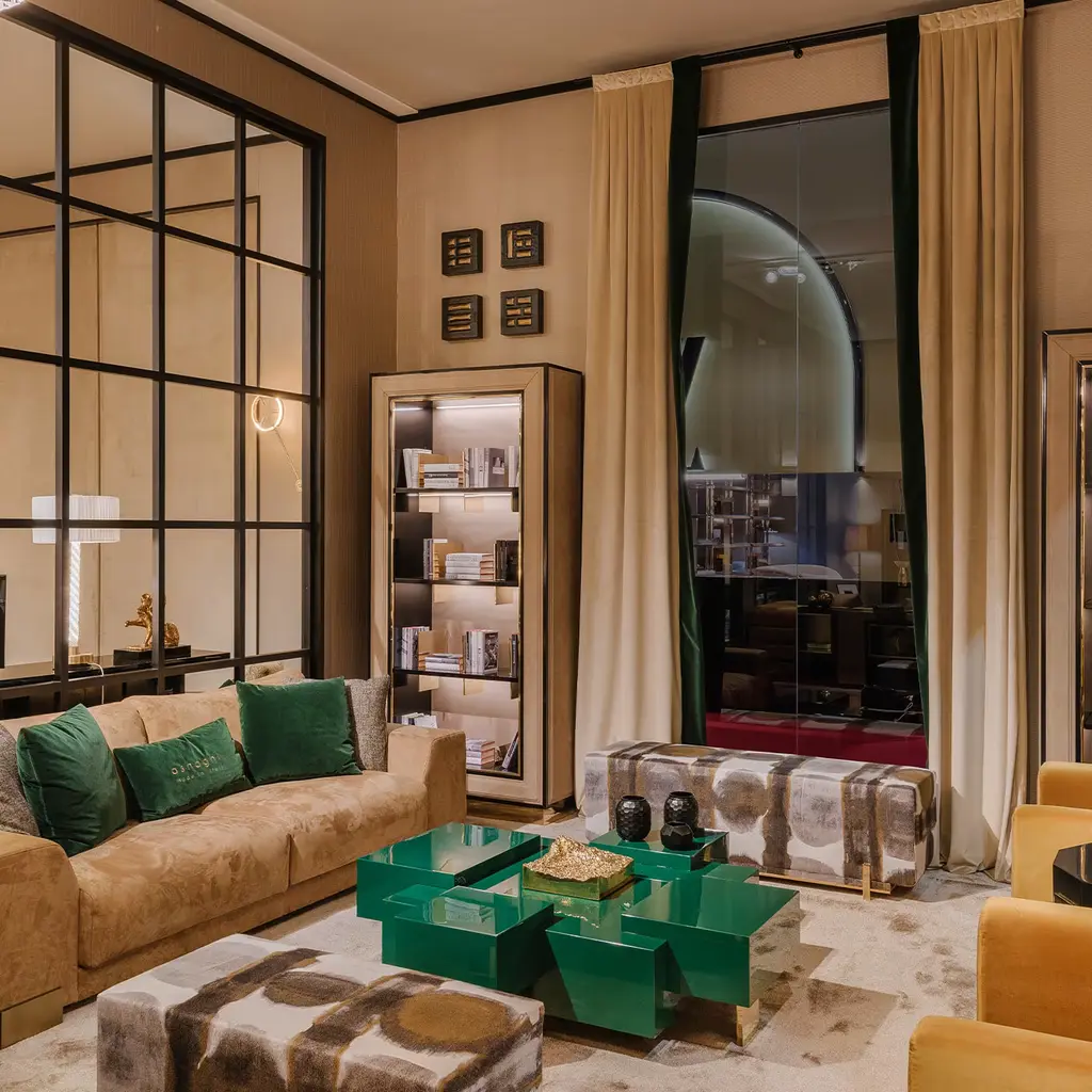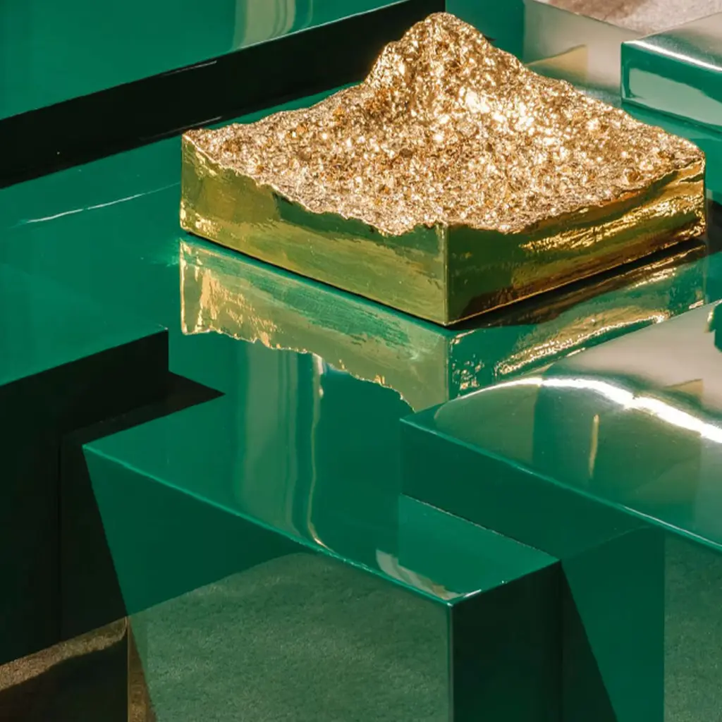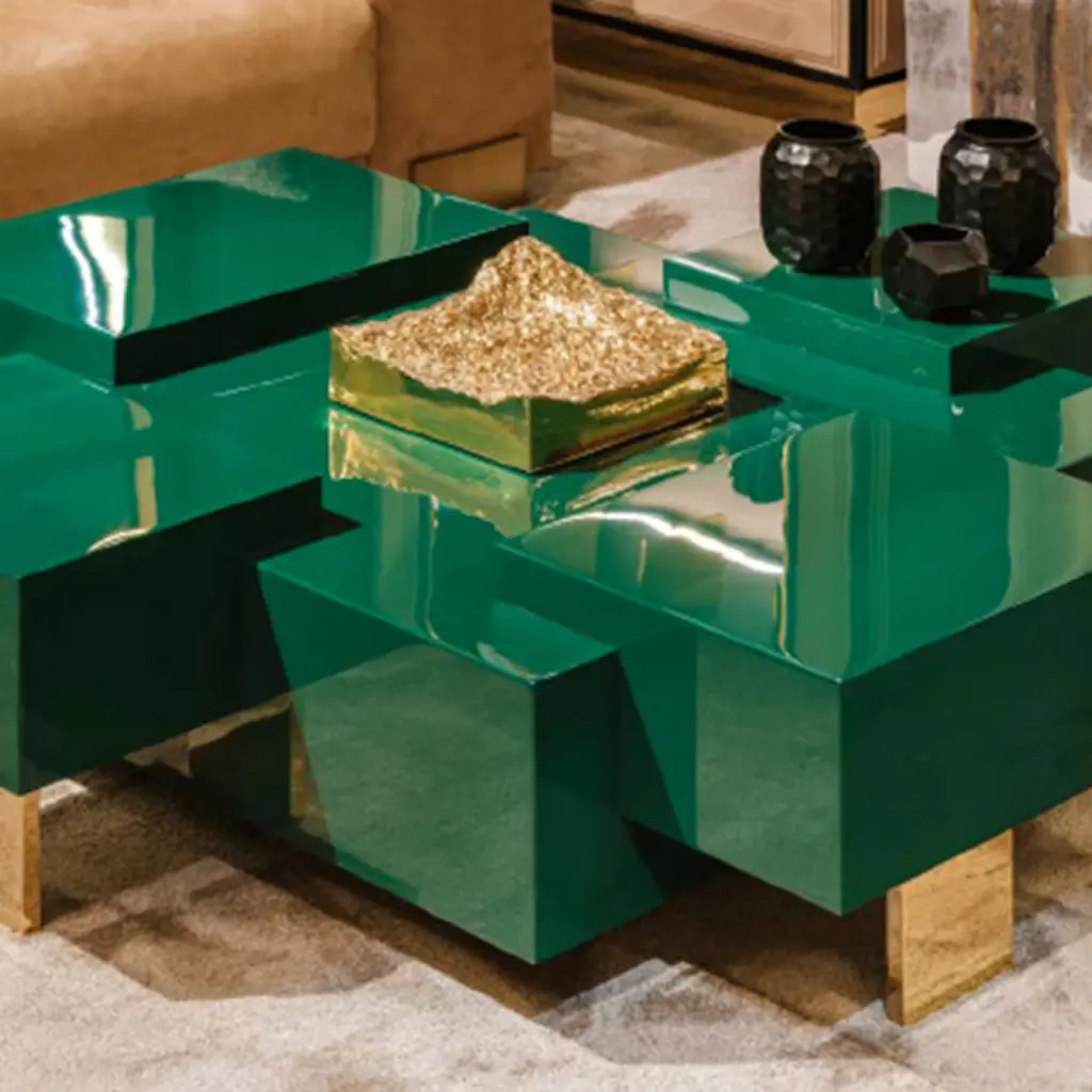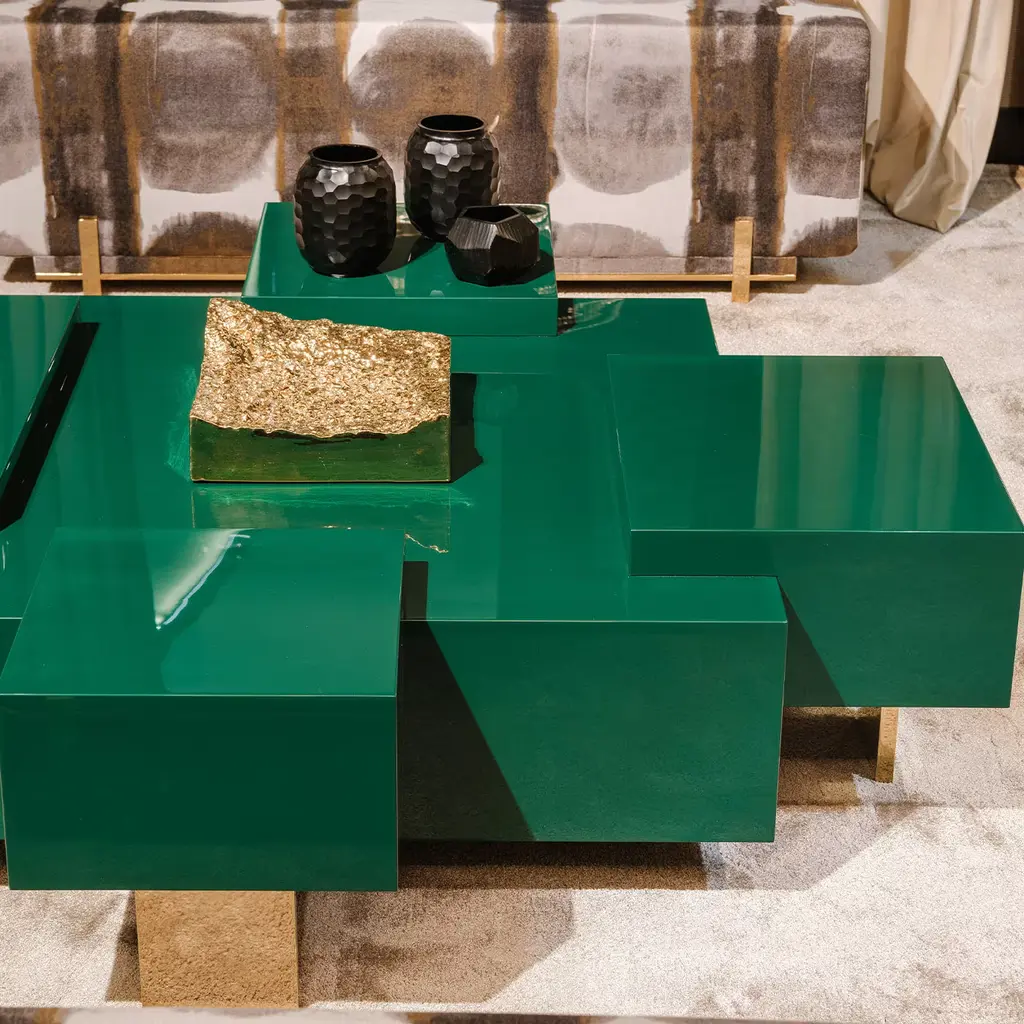 Suitable as both a coffee and side table, this one-off piece boasts a dynamic wooden silhouette comprised of five surfaces highlighted by the glossy forest green lacquer. Complemented by four thin, brass-finished metal sheet, this coffee table will imbue any room with its sophisticated allure. The top is available in other colors and can be hand decorated upon request, please ask the Concierge for details.