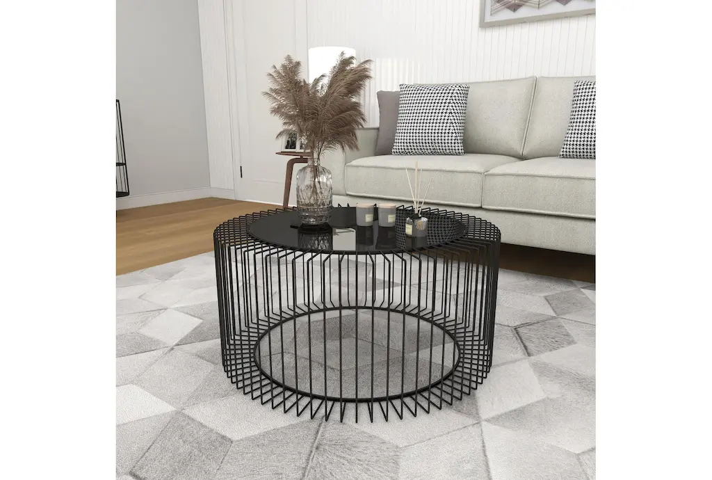 A spacious table top with a unique design offers an eye catching display from every angle. Useful and elegant, coffee tables are more than just a pretty piece of furniture in front of your couch. Glass table top lets you add few eye-catching decor objects, such as small indoor planter and contemporary sculpture. This item ships in 1 carton. Round opening at the base allows you to place small decoration inside. Suitable for indoor use only. This item ships fully assembled in one piece. Maximum weight limit is 100 lbs. This is a single black colored living room table. Contemporary style. Shop coffee tables like this one and find the perfect design for your space.