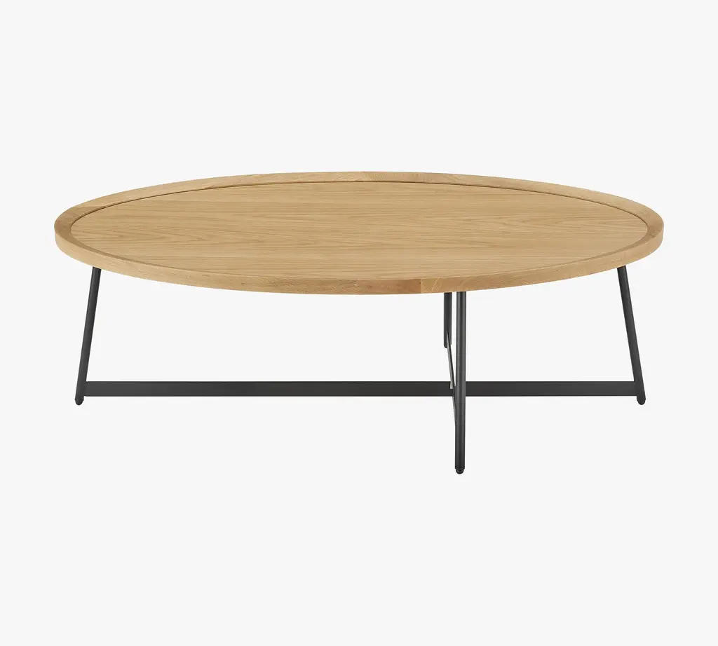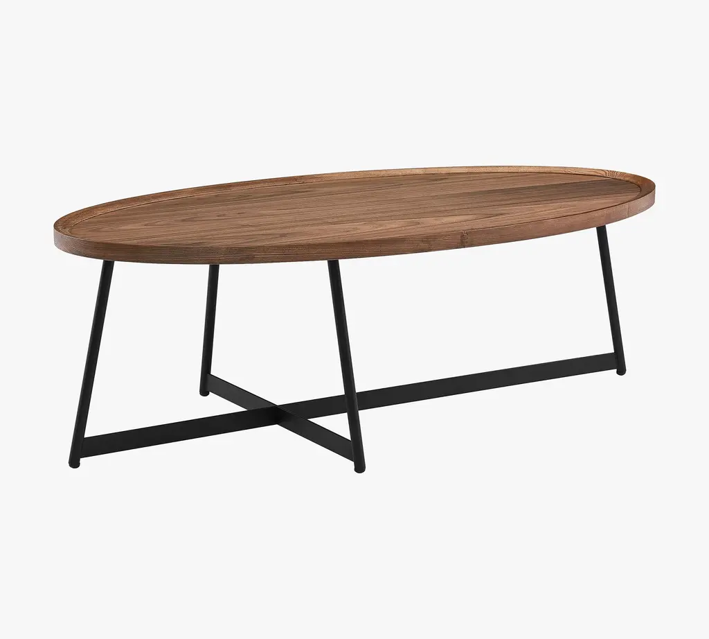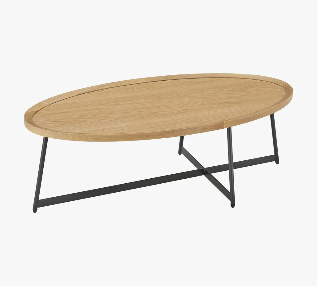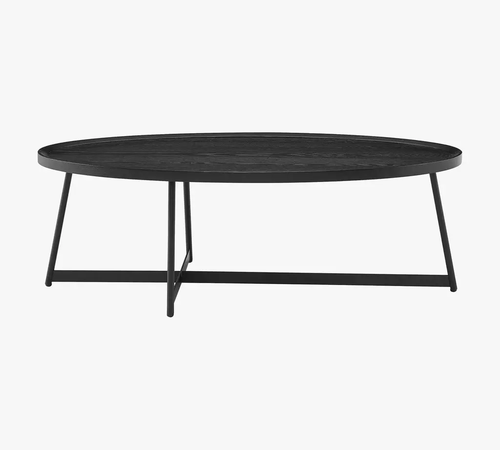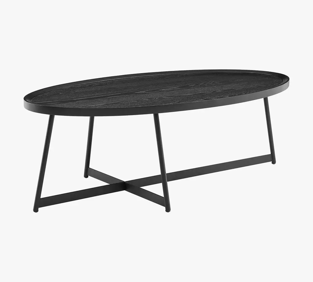 Airy and architectural, our coffee table is a study in modern geometry. A play of gentle curves and crisp lines, the oval top is crafted of richly finished ash veneer with raised, solid-wood edges. It rests atop an X-shaped, black steel base whose asymmetrical form adds restrained flair to a modern living space.