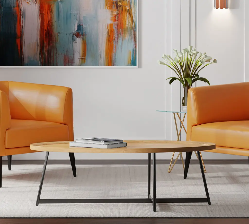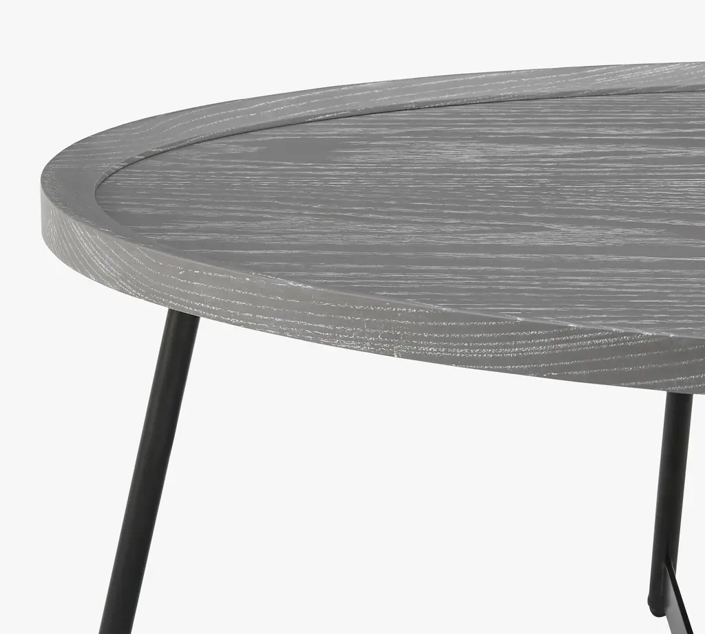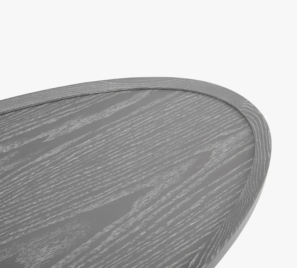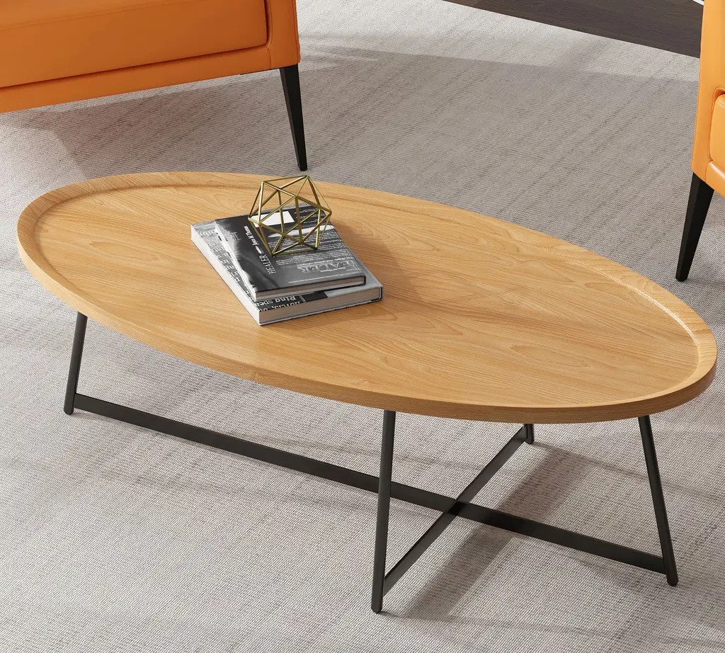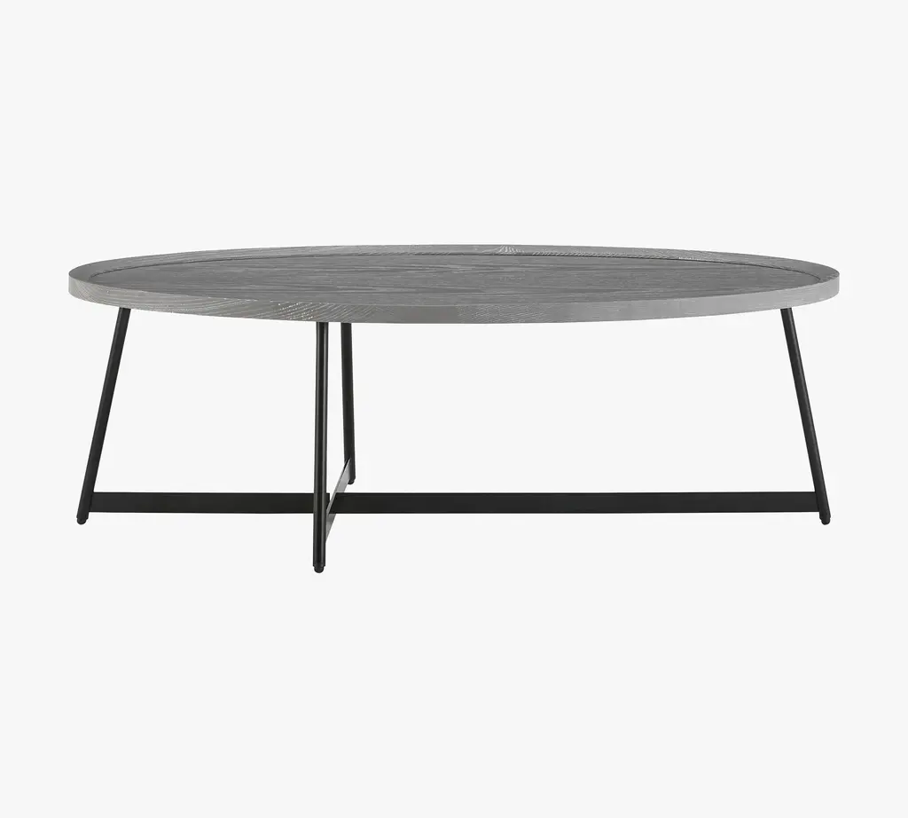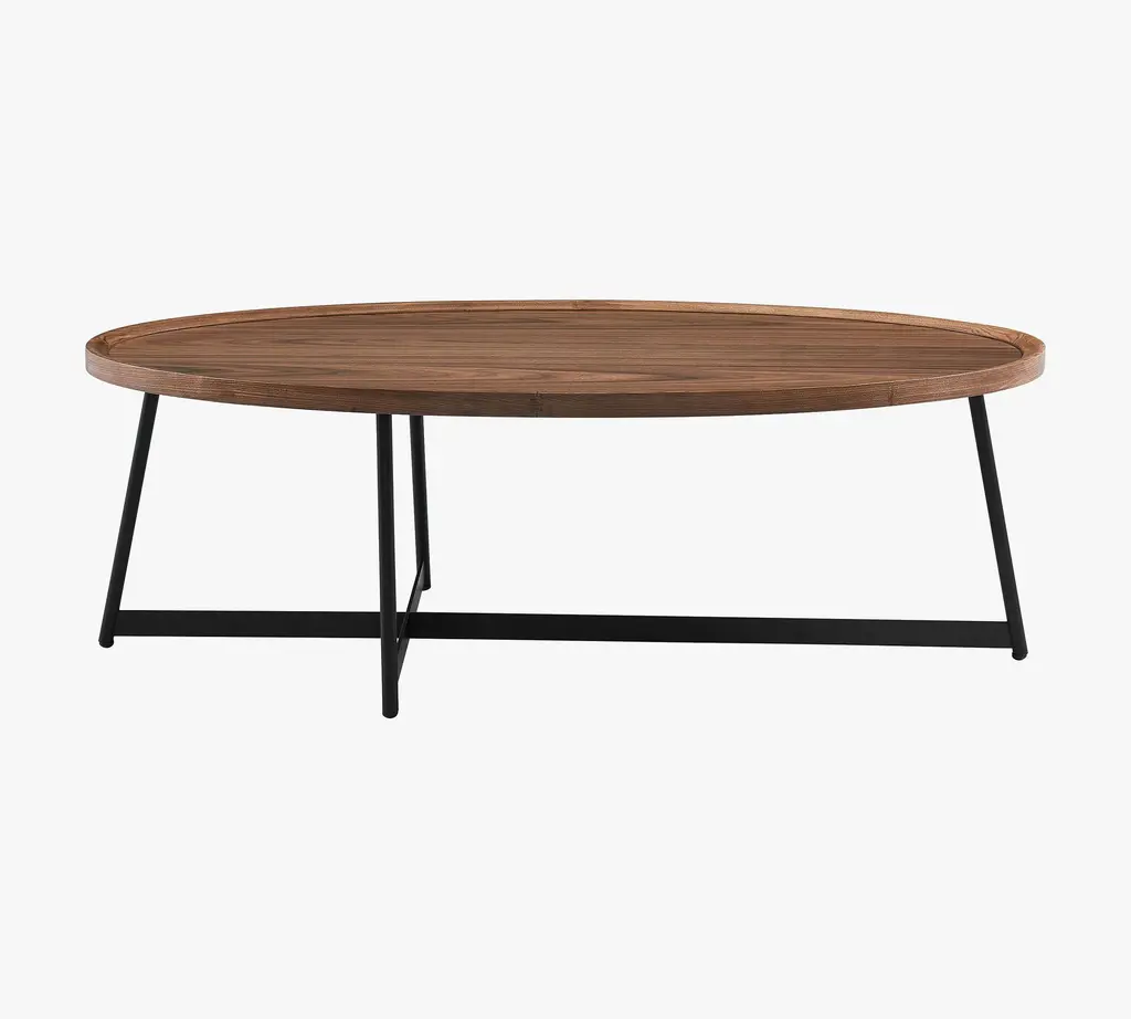 Airy and architectural, our coffee table is a study in modern geometry. A play of gentle curves and crisp lines, the oval top is crafted of richly finished ash veneer with raised, solid-wood edges. It rests atop an X-shaped, black steel base whose asymmetrical form adds restrained flair to a modern living space.