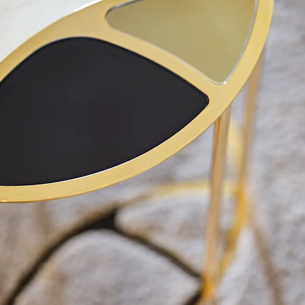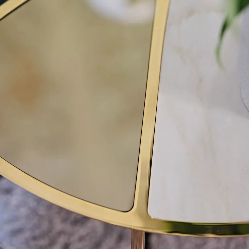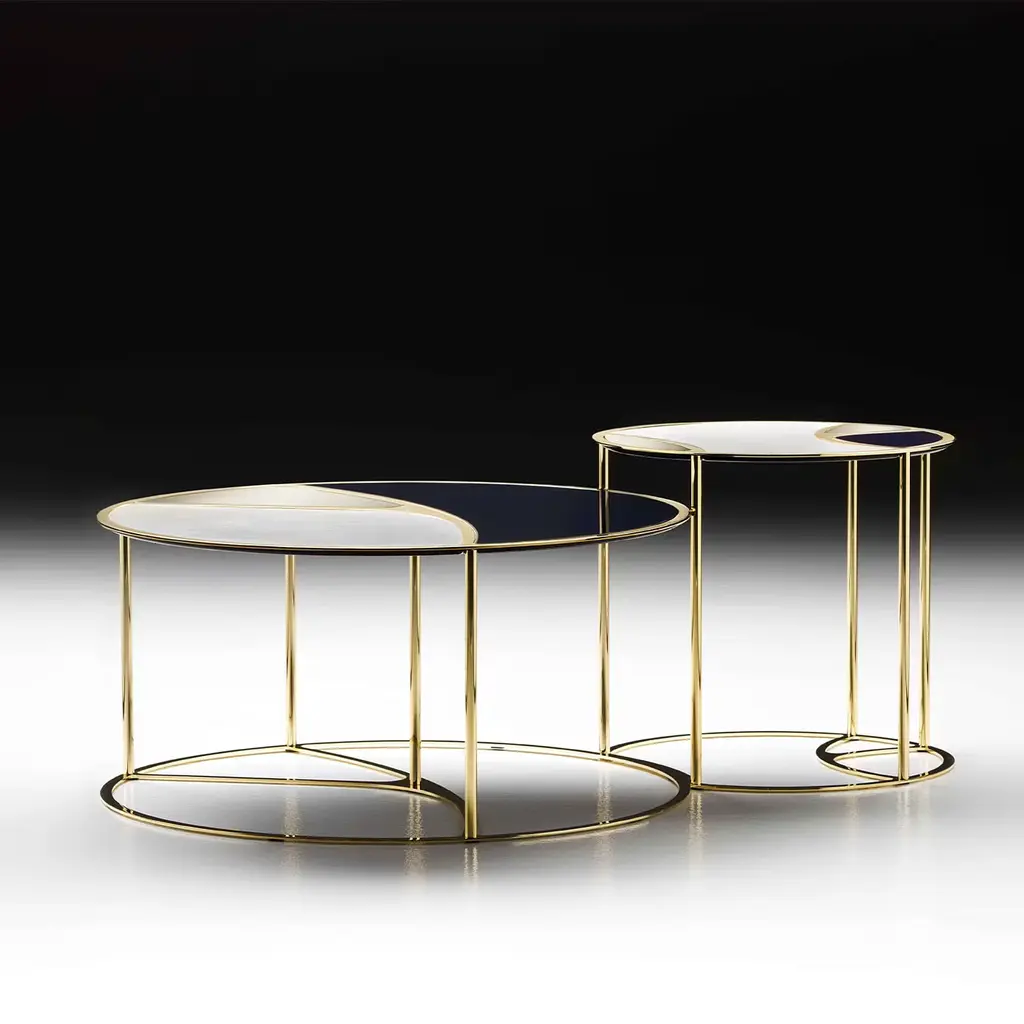 Refined phytomorphic-inspired lines are the ones conceived for the glossy golden laser-cut metal frame of this elegant coffee table. Precious inserts of Calacatta Vagli Oro marble, glass back-painted in blue, and bronzed mirrored glass combine at the top, for a visual contrast of striking visual impact. Its asymmetrical design is strengthened by the legs' distribution.