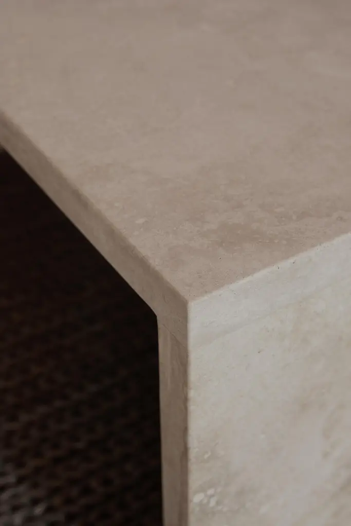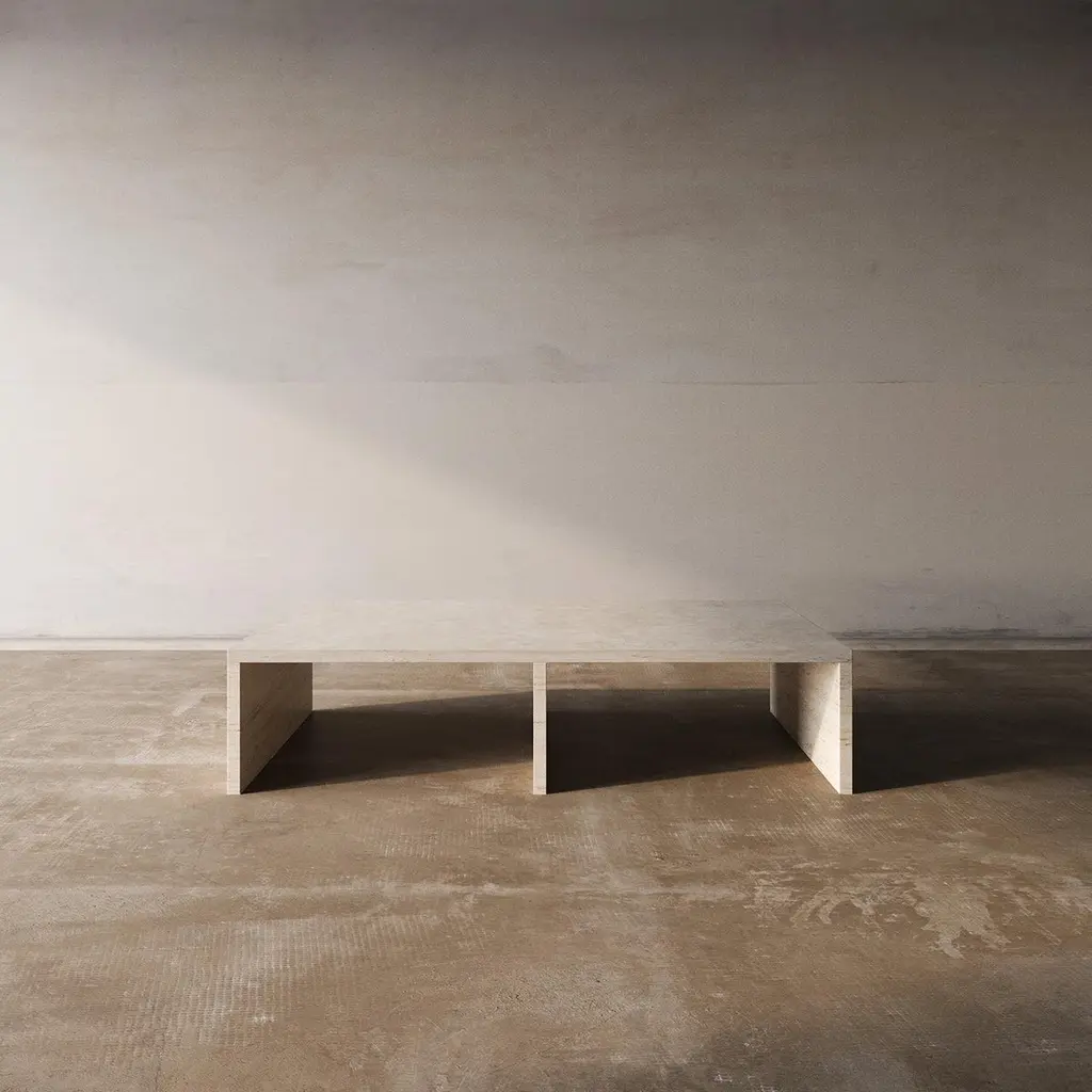 The AA106 coffee table, part of the 'Pure Minimalist' collection by Amee Allsop, is a simple yet architectural design with a focus on the material and form. It is elegantly constructed of 3cm solid ivory travertine.