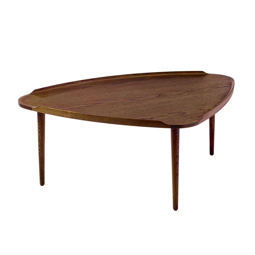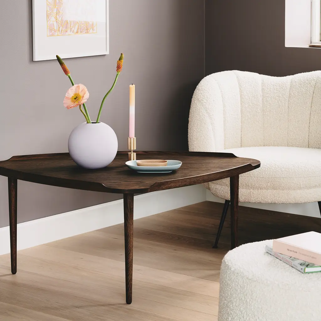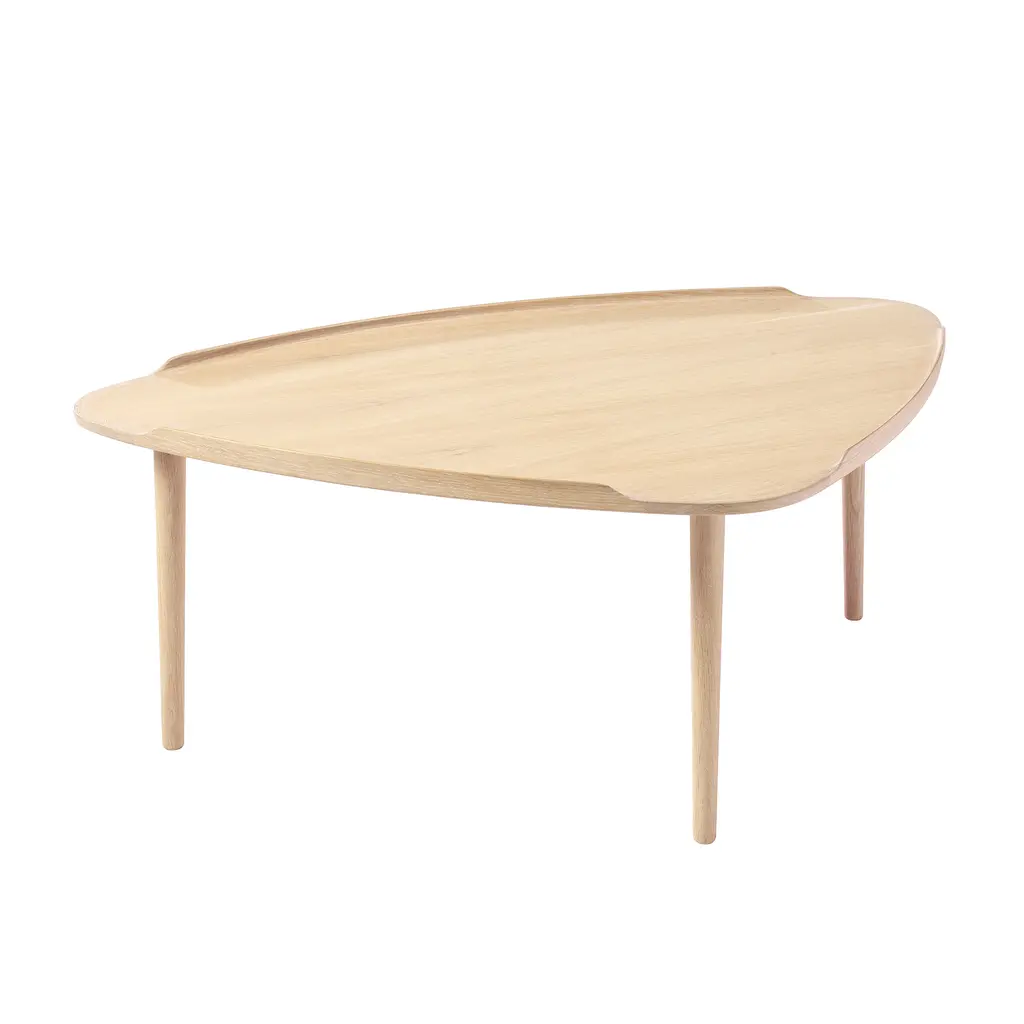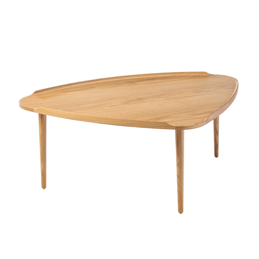 Petals, leaves, a guitar pick. Regardless of what its silhouette reminds you of, the No. 55 Table has a distinctive style that brings charm and timeless Danish elegance into your home. Designed in the 1950s by Jørgen Aakjær Jørgensen, this Intarsia Furniture table was relaunched in two versions that perfectly suit modern interiors. Available in two sizes and two heights, the No. 55 tables can be nested in a living room to save space. Both versions feature a triangular top with curved corners and a traditional chamfered edge. Three tubular but slim legs provide excellent support while giving a light look to this versatile coffee table. Available in natural, white oiled or smoked oak versions, the Intarsia Furniture No. 55 Table blends into any décor with ease.