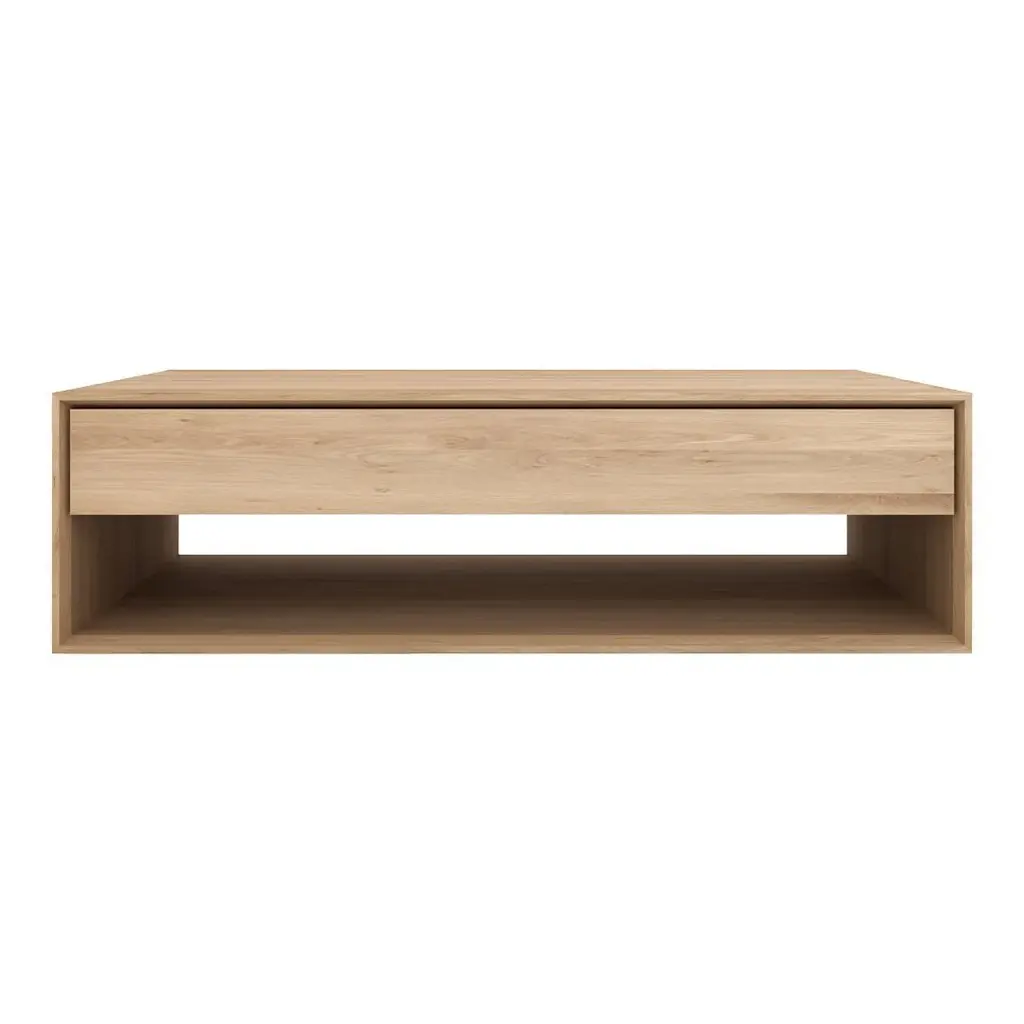 The Ethnicraft Nordic Coffee Table, designed by Alain Van Havre, transforms everyday living spaces through its masterful blend of Scandinavian simplicity and practical luxury. This thoughtfully crafted piece serves as both a design focal point and a natural gathering place for life's daily moments.Crafted from sustainably sourced solid oak, the table's refined presence emerges from carefully considered details. Beveled edges create subtle plays of light across its surfaces, while a soft-close drawer seamlessly integrates storage without disrupting the table's clean lines. This hidden compartment elegantly conceals everything from remote controls to board games, maintaining the room's aesthetic harmony while accommodating real-life needs.The table's generous surface area provides an ideal canvas for both everyday use and artistic expression. Whether styled with carefully curated objects, laden with coffee table books, or cleared for family game night, it adapts effortlessly to your living patterns. The natural oak construction ensures that each piece develops its own character over time, recording the story of your home in its gradually deepening patina.Perfect for both casual family rooms and formal living spaces, the Nordic Coffee Table demonstrates Ethnicraft's gift for creating furniture that enhances daily life while maintaining architectural elegance. Its versatile design complements various interior styles while providing the durability needed for decades of memorable moments.