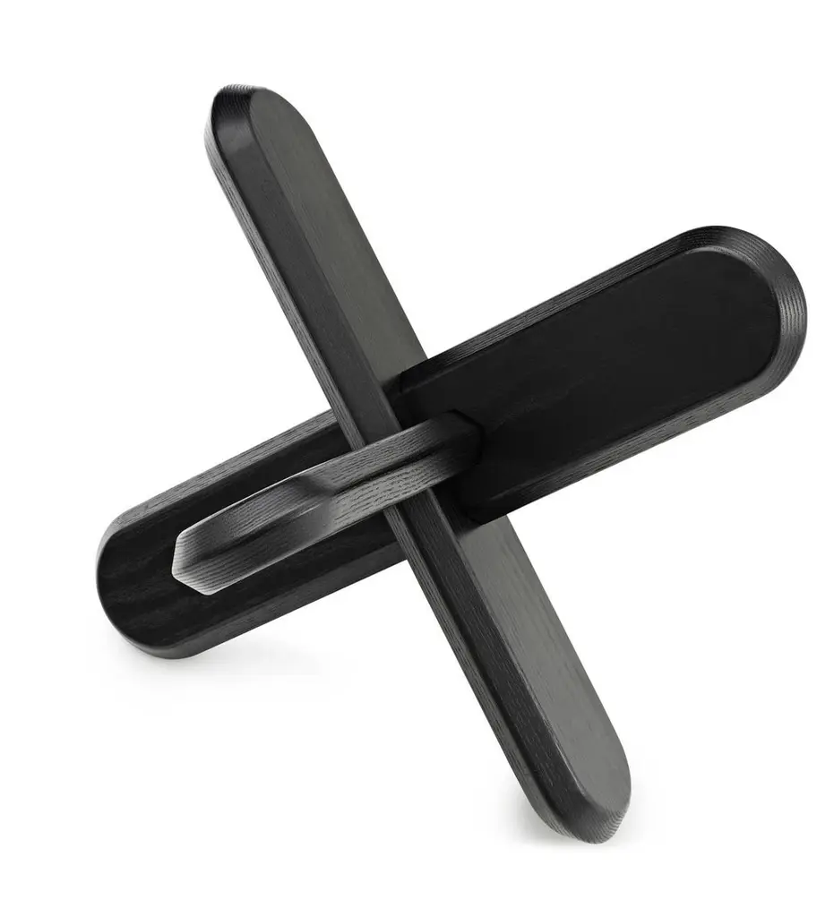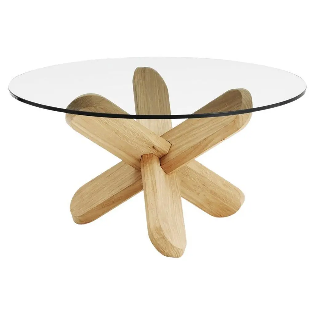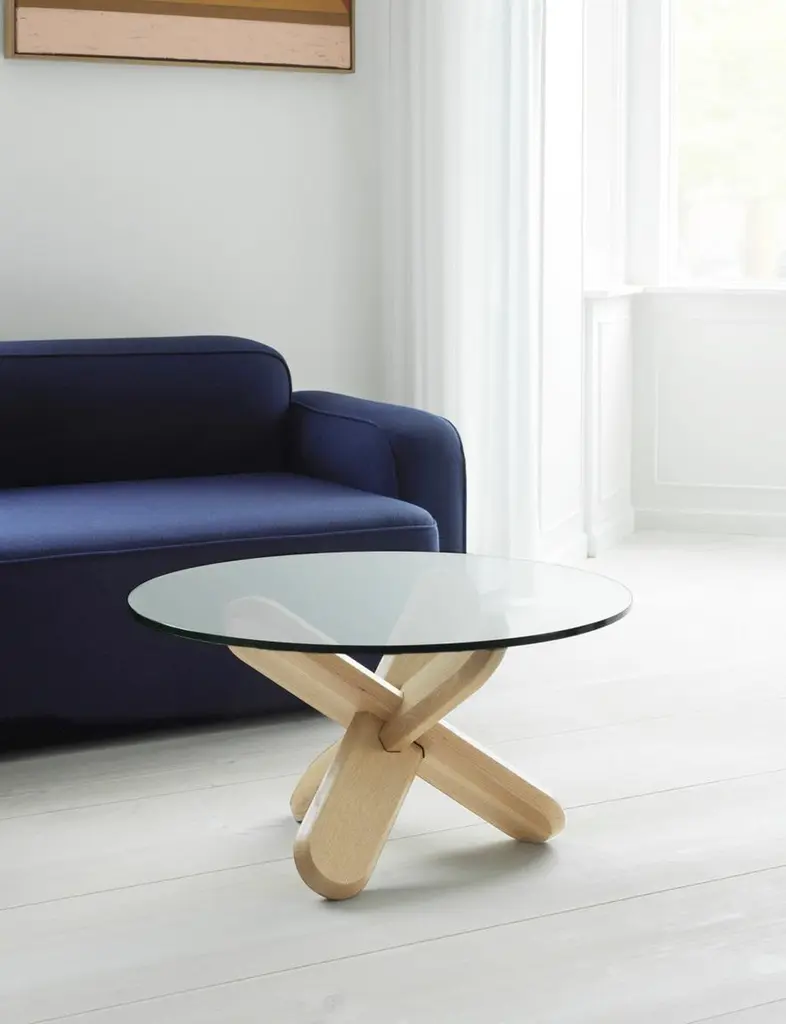 The Ding table comes flat packed. The legs interlock easily by following the included manual. The legs have chamfered edges making the table stand sturdily on the floor and the round 12 mm thick sheet of glass rest solidly on the base.Ding TableThe Ding table is inspired by ancient three-dimensional wooden brain teaser puzzles. The table consists quite simply of three legs made from oak have that are assembled without screws and tools of any kind.When put together they constitute a sculptural knot that works as the base for an exclusive glass tabletop. The legs are rounded off with chamfered edges, making the table stand sturdily on the floor and the round sheet of glass sit solidly on the base. The Ding table is available with either a clear or smoked glass tabletop, and with a choice of three different types of legs, there is ample opportunity to find exactly the style that suits your furnishings and taste. For example, you can combine a clear glass tabletop with legs in natural for a clean and Nordic expression, or turn up the intensity with a smoked table top in bold coral-colored or striking black legs.