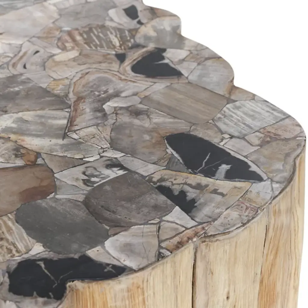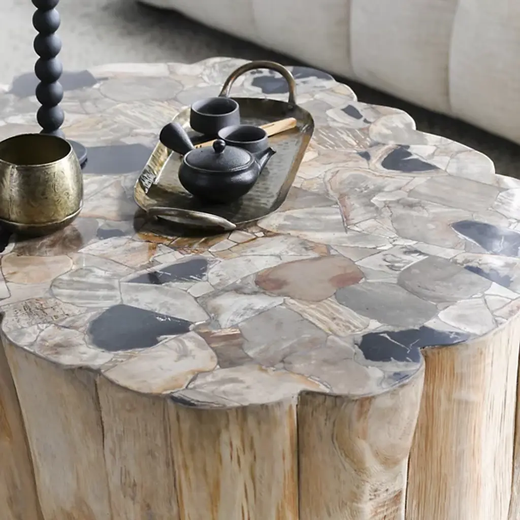 The Norwest Coffee Table from Classic Home showcases the beauty of natural materials, blending teak and petrified wood into a striking statement piece. Its design features bold grain patterns and distinctive variations in shape and texture, making each table truly unique. The combination of organic gray and brown hues ensures integration with a variety of color schemes. A perfect balance of style and nature, this eye-catching coffee table adds depth, warmth, and character to any room.