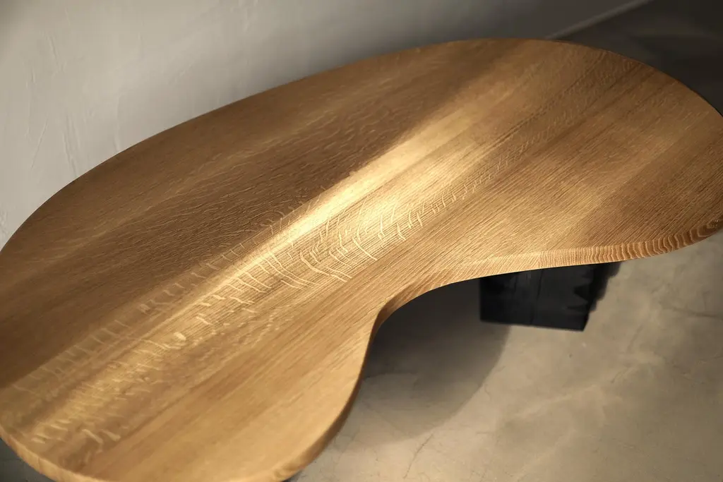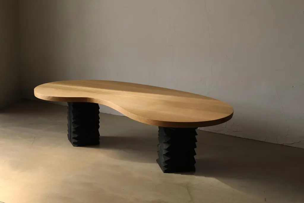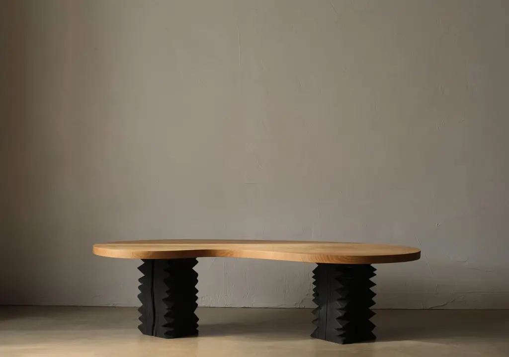 The Notch II coffee table is built from two solid pedestal legs and a large bean-shaped white oak top.This collection finds its foundation in ‘cribbage’, a rough-cut lumber used to build support structures called ‘cribs’ in coal mines. This material which would otherwise go to waste, is recycled, hand-cut, and charred to create the pedestal base at the root of this collection. A visual connection is easily made between the harsh and sporadic dark forms and the raw minerals drawn from the earth.