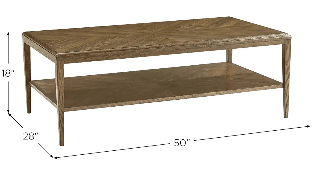 Seen in our Dawn finish, this rustic oak cocktail table features a concentric parquetry pattern on the top and bottom tiers making it a true original. Resting on a tapered oak leg.