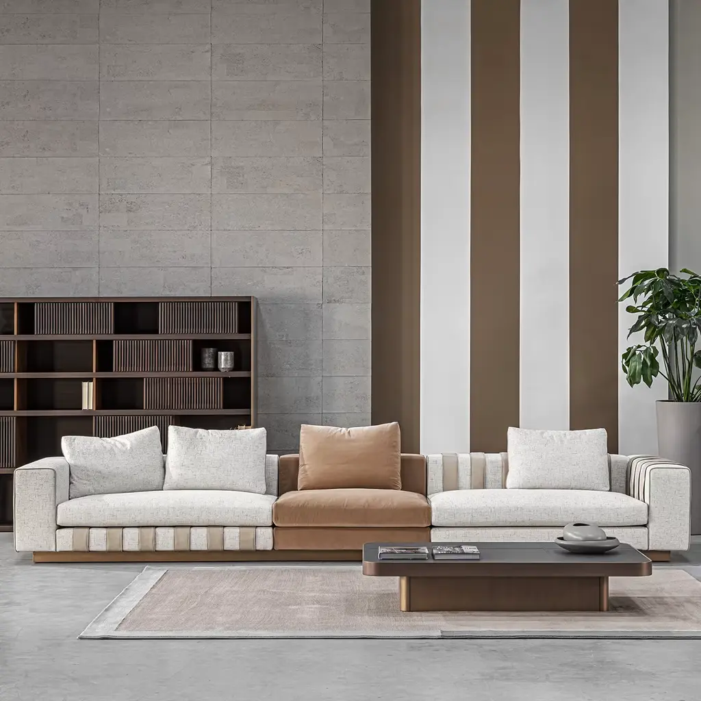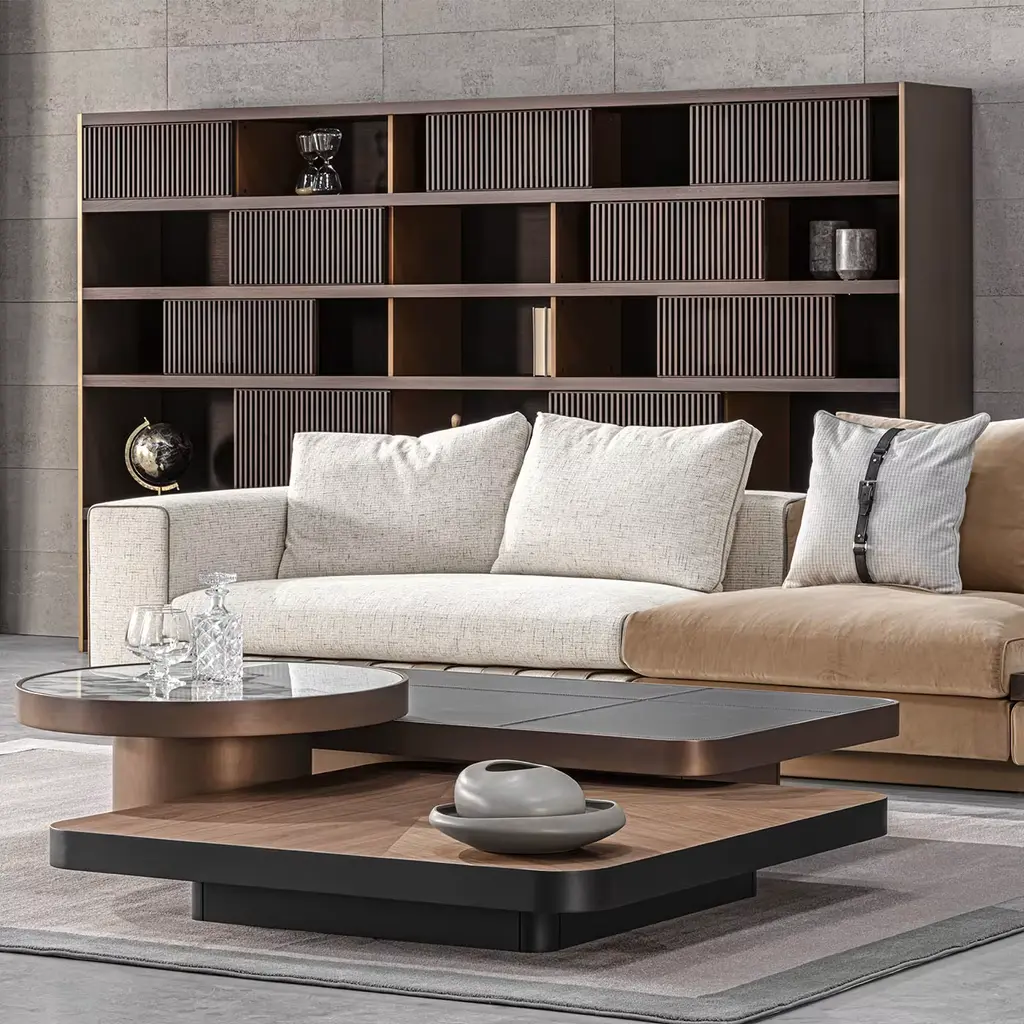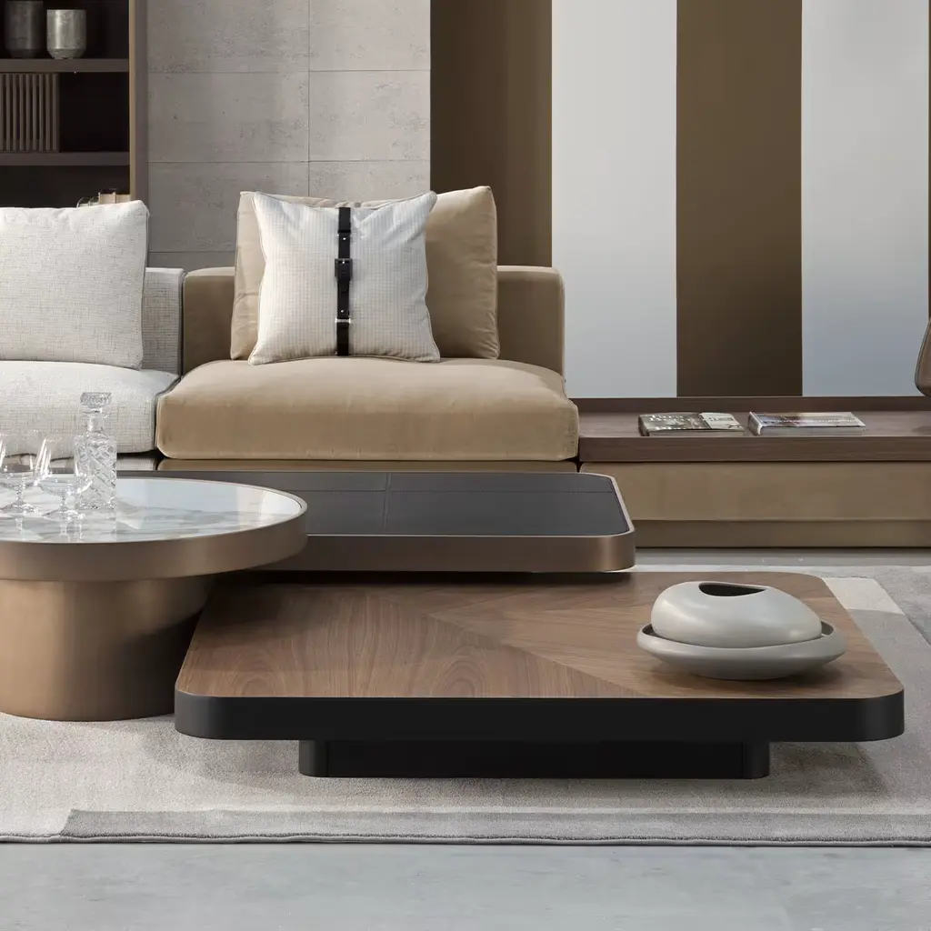 Part of the Numana Collection, this rectangular coffee table embodies geometry and solidity. Crafted with precision from a saddle gray top and a base and edges finished in bronze, its clean lines play on the overlapping of contrasting surfaces and materials, fitting elegantly even into minimalist living areas. Ideal for both home and office environments, it seamlessly blends practicality with modern flair, catering to diverse aesthetic preferences and functional needs.