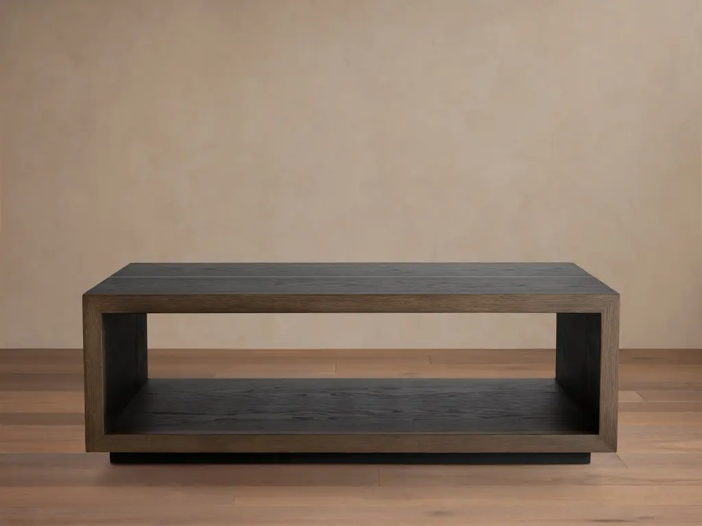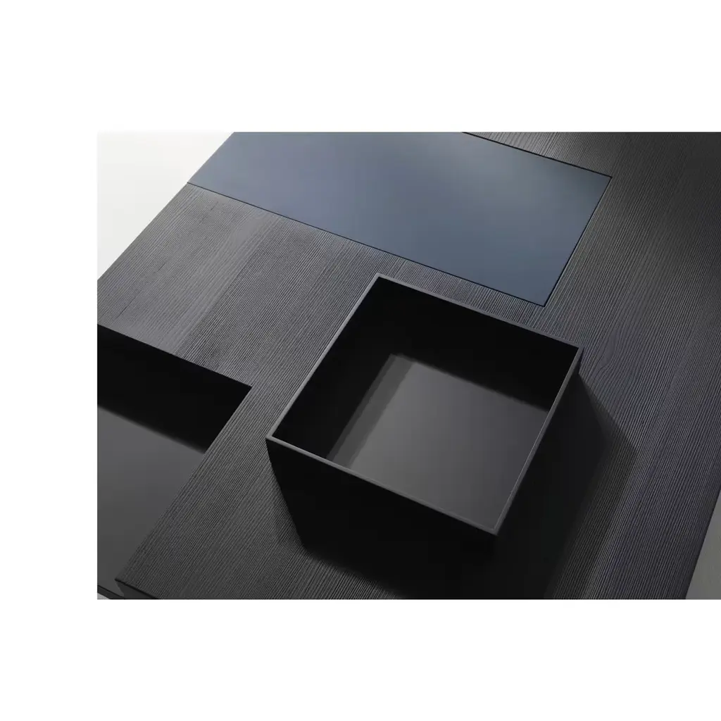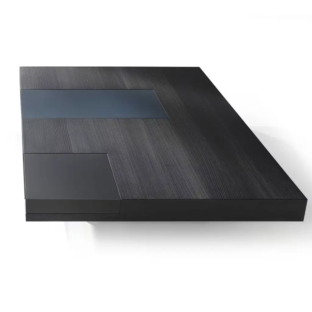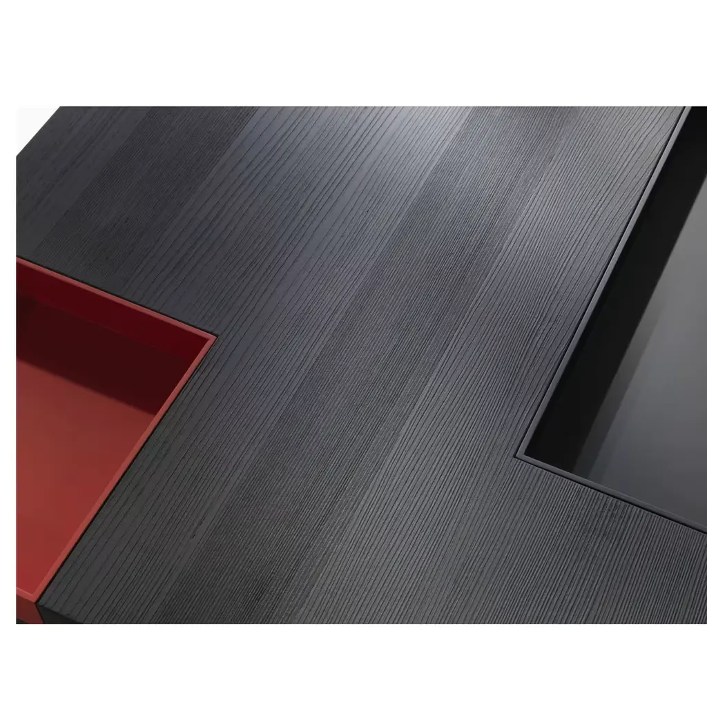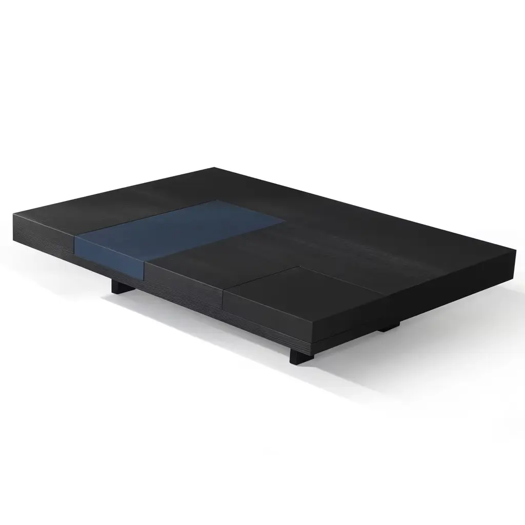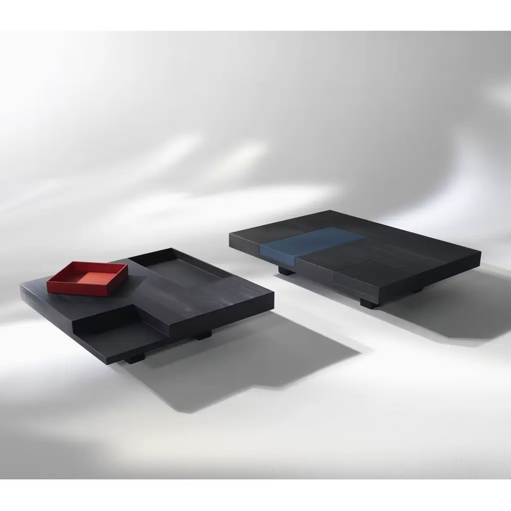 This striking coffee table which is low to the ground has both purely decorative elements as well as functional attributes. The solid larch wood structure of the table is lacquered in matte black with a brushed texture and consists of a large rectangular top supported by four short rectangular legs. A serving tray in a contrasting blue hue rests in an insert on the surface of the table and can be removed. The sophisticated silhouette enhances the look of interiors and its dual functionality make is a truly dynamic piece.